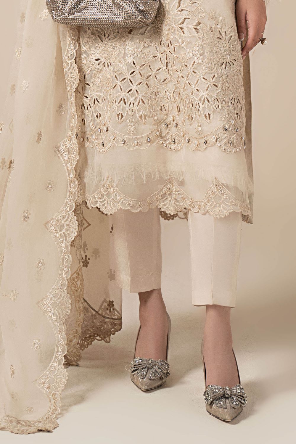 Cutwork Embroidered Front Border With Stone, Pearl & Frayed Organza Detailing