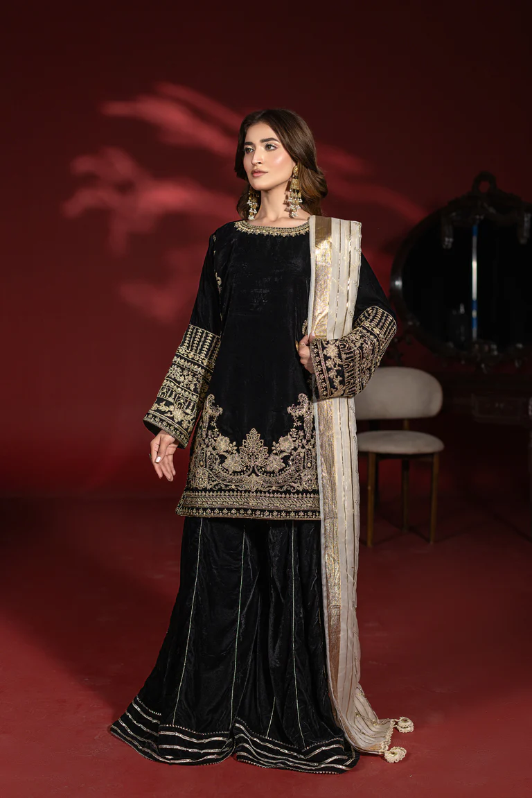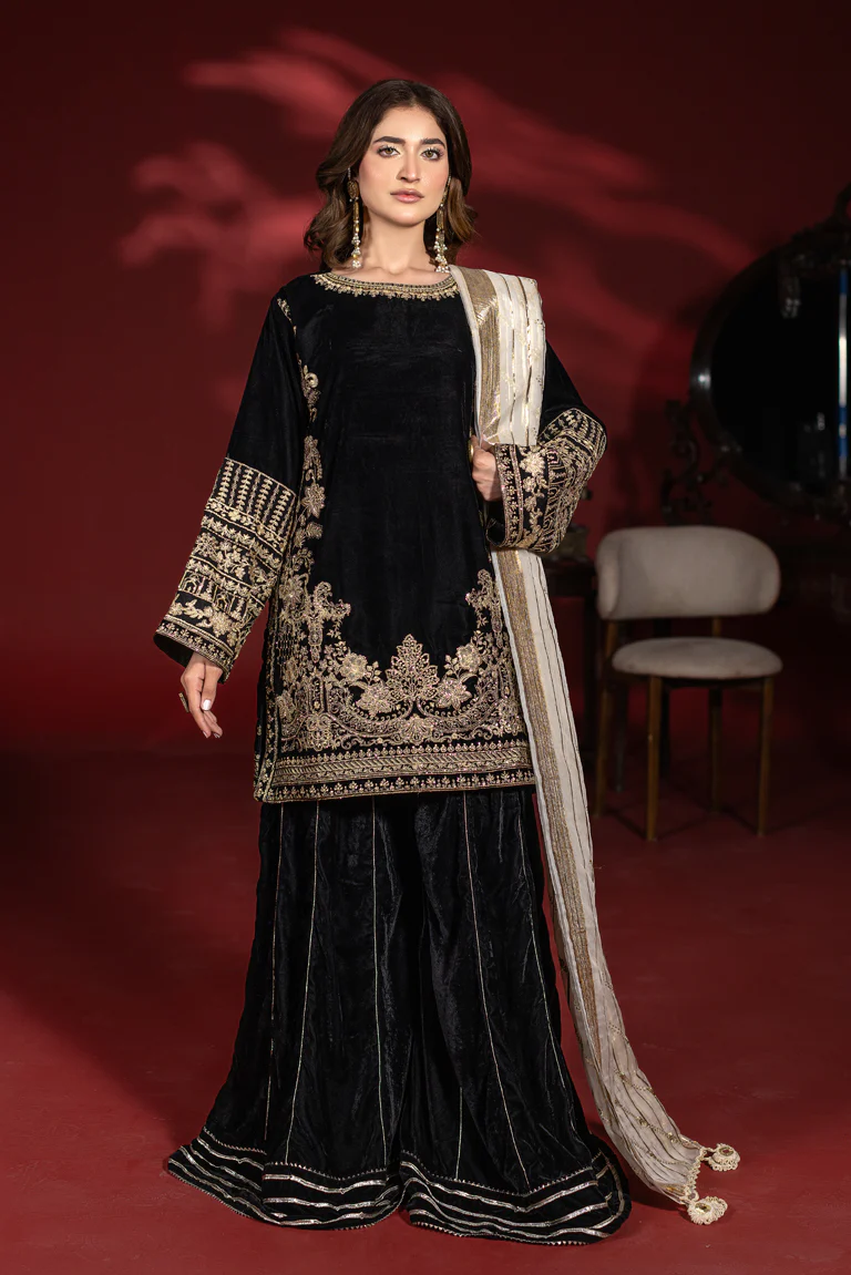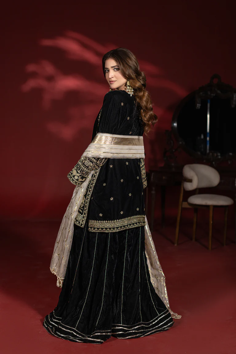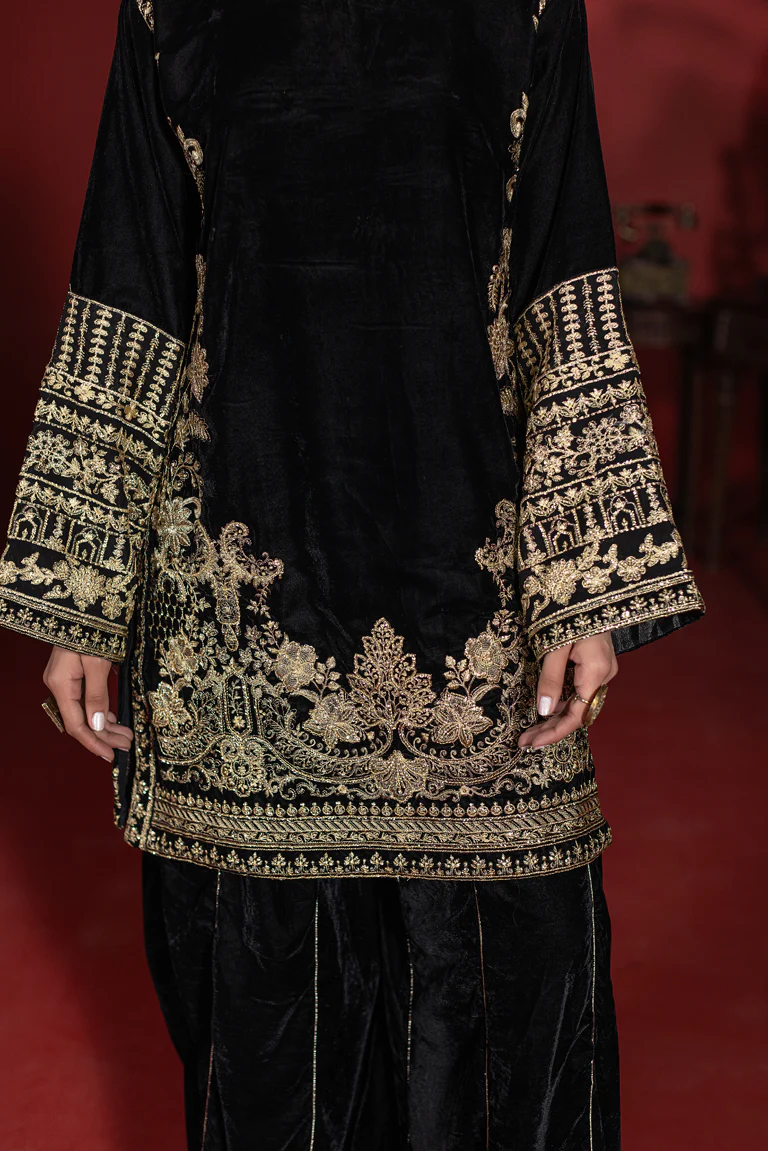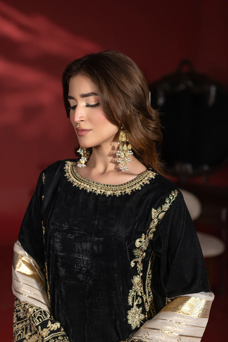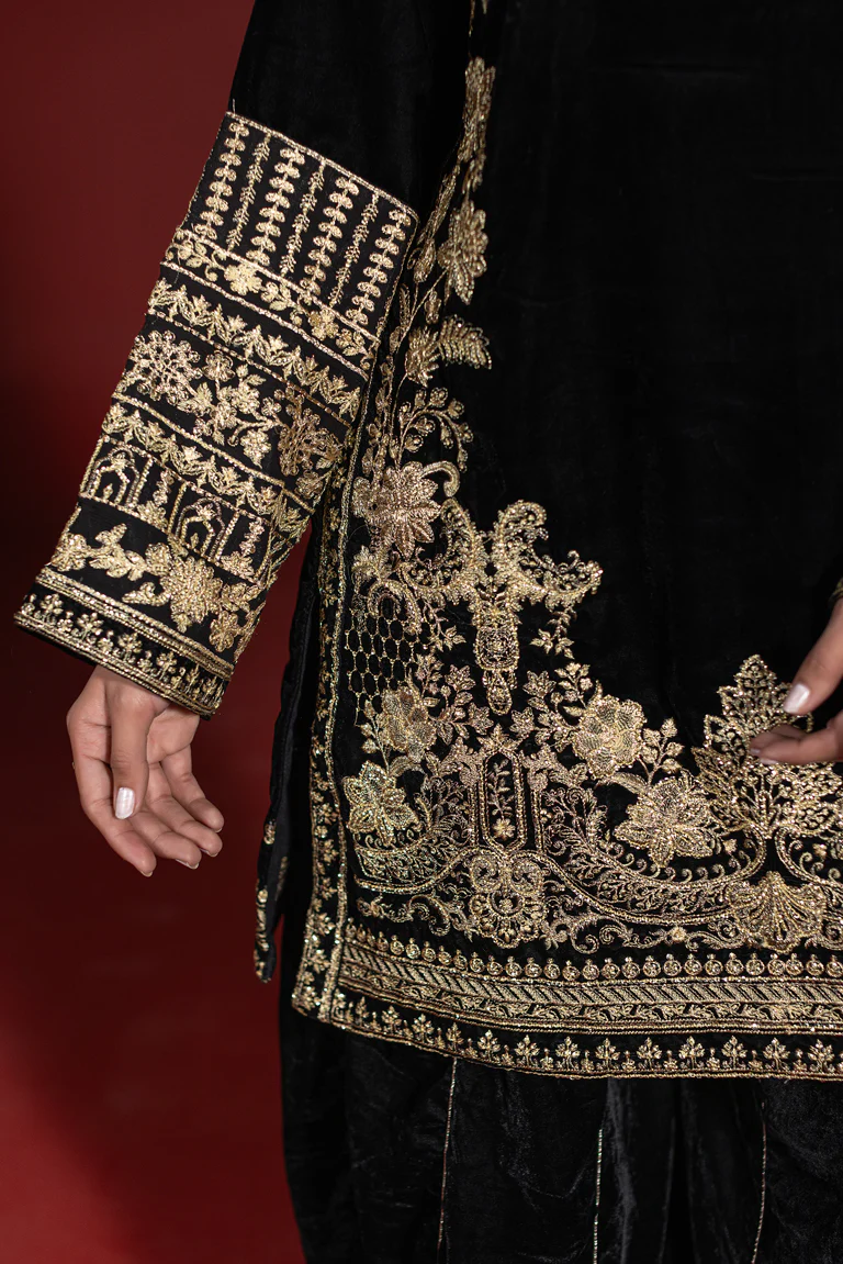 Make a statement in this exclusive black velvet ensemble designed for timeless elegance. The shirt is richly adorned with intricate thread embroidery across the front, sleeves, and hem border, creating a luxurious and sophisticated look. Paired with coordinated velvet flared pants featuring subtle gold stripe detailing, the silhouette remains graceful and structured. A contrasting lightweight organza dupatta completes the outfit with effortless charm. Ideal for weddings, Eid celebrations, formal dinners, and special evening occasions.
