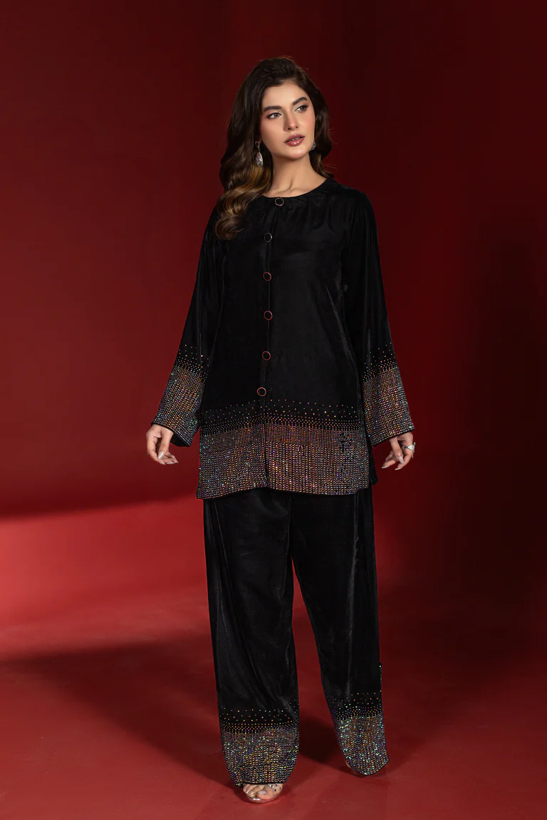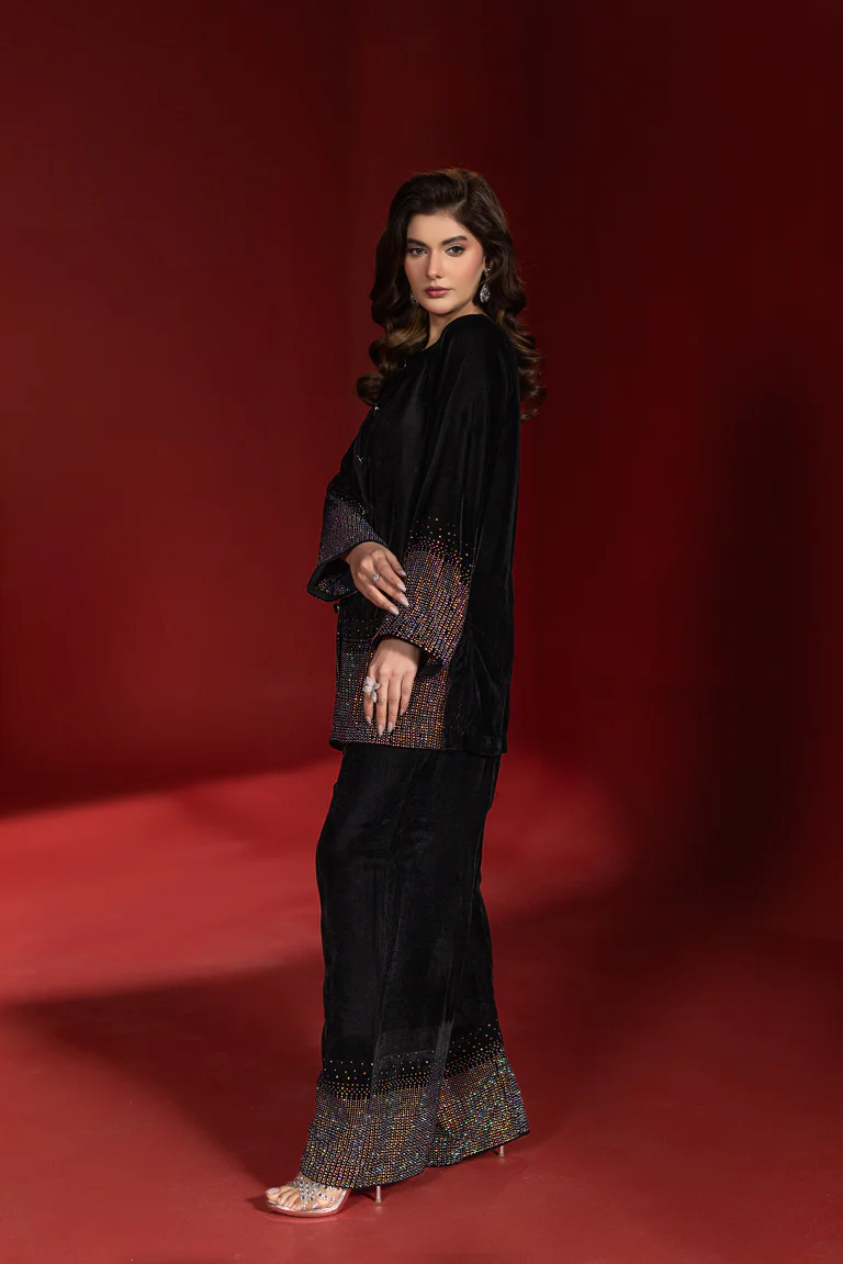 Elevate your evening wardrobe with this effortlessly elegant black co-ord set, designed for refined sophistication and modern glamour. Crafted from premium velvet fabric, this ensemble features a straight-cut tunic adorned with subtle metallic embellishments along the hem and sleeves, creating a graceful shimmer with every movement.