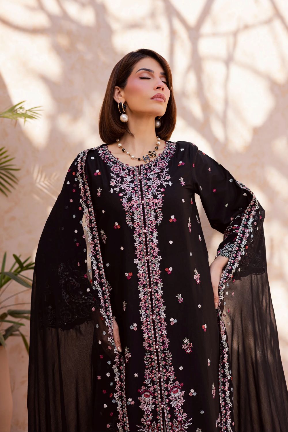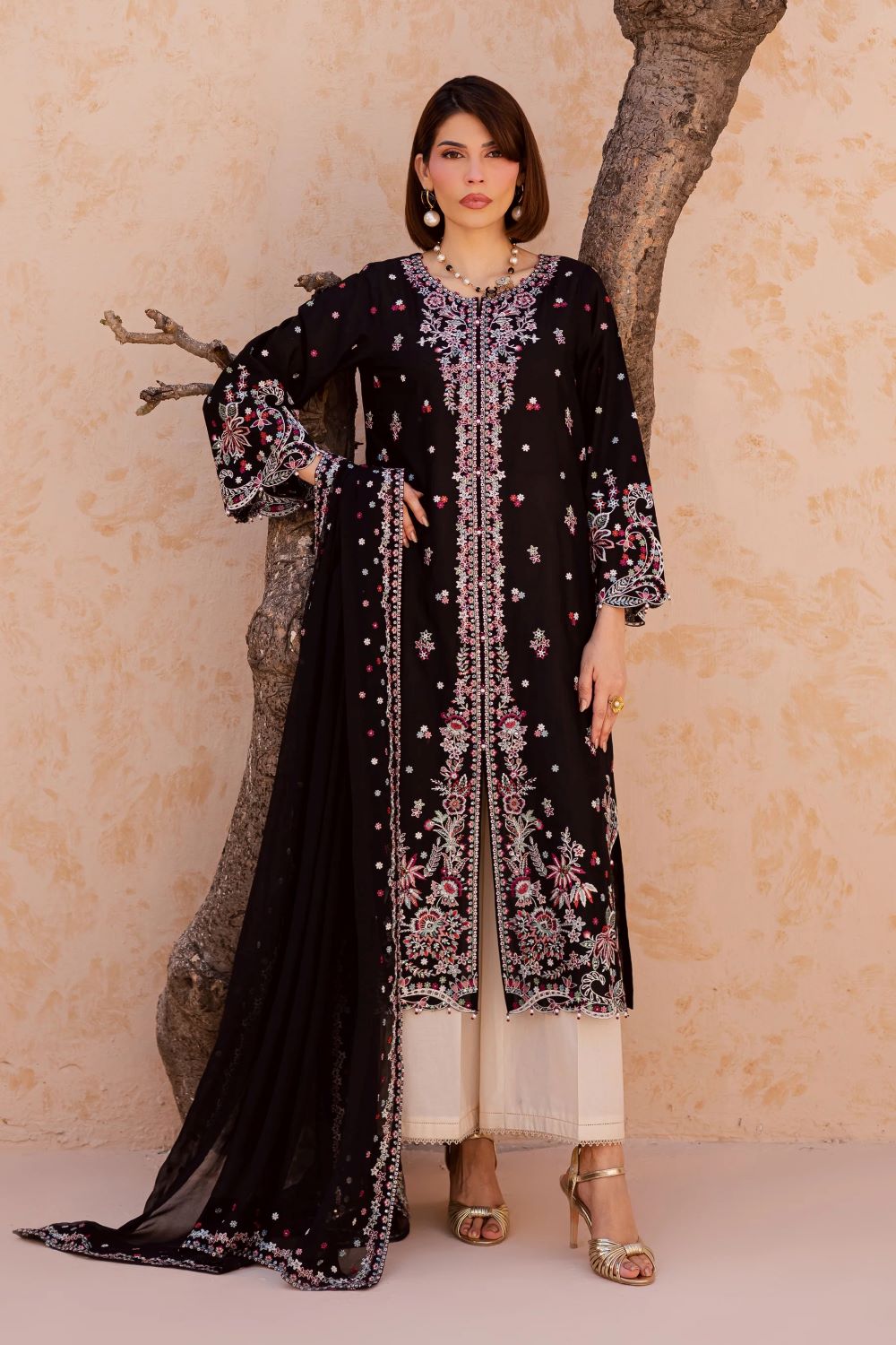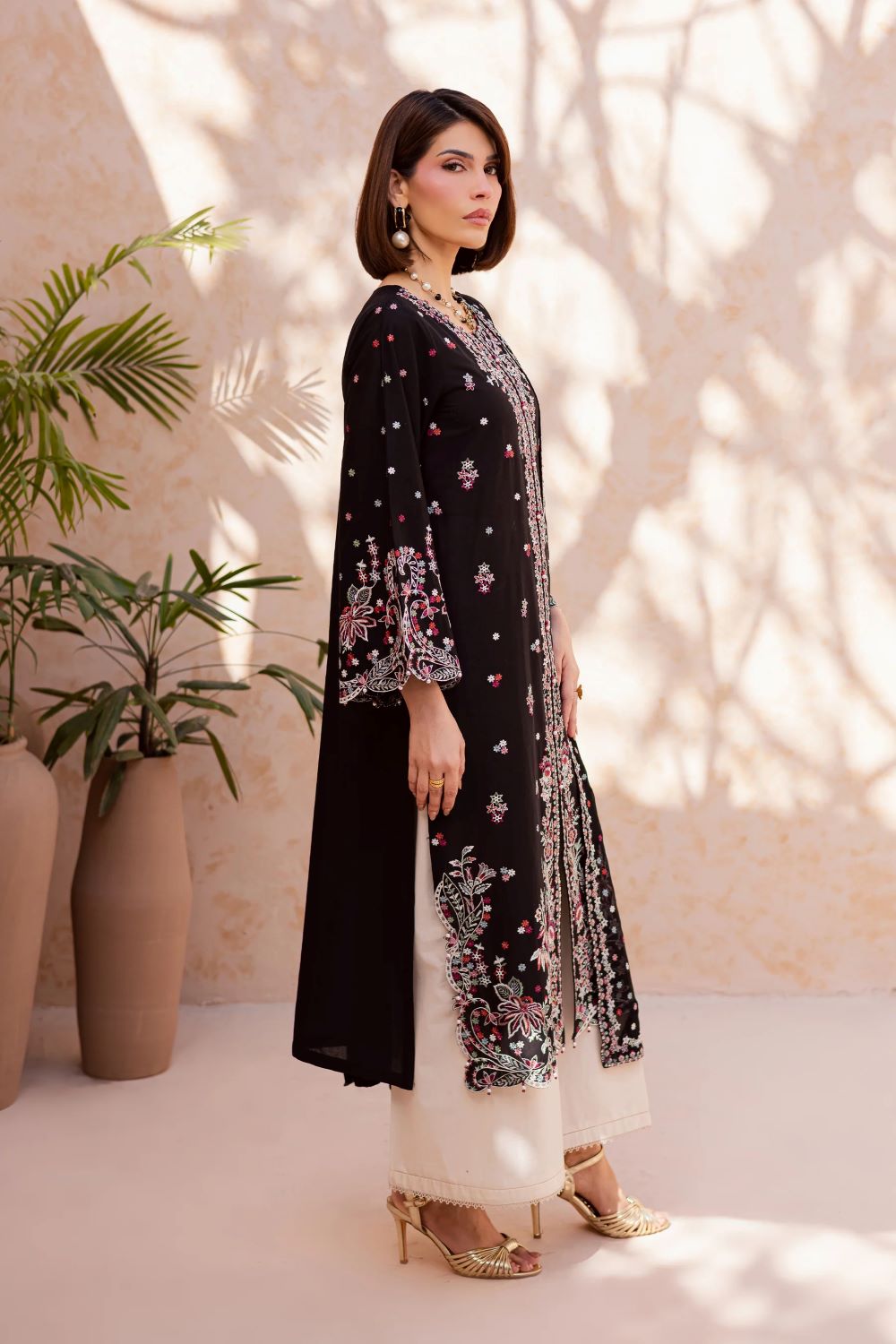 This three-piece ensemble features an embroidered front-open black shirt with sleeves, designed with composed embroidery and intricate boring detailing. The hem and side chaaks are finished with refined kaviya accents, while the flared sleeves add graceful movement and structure.