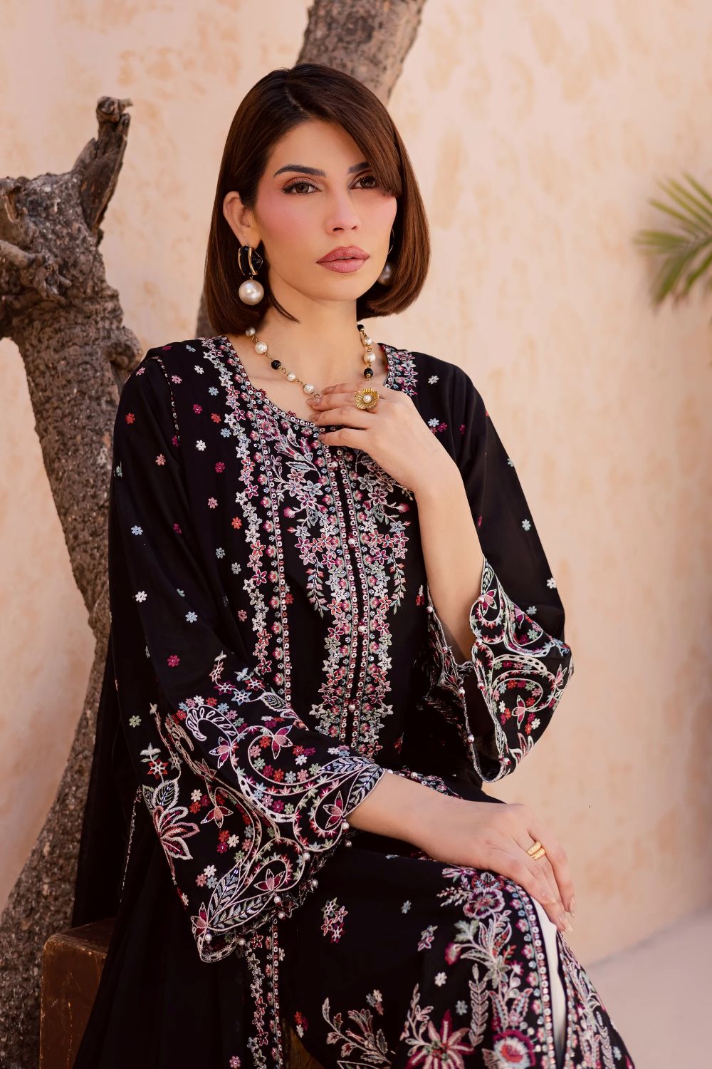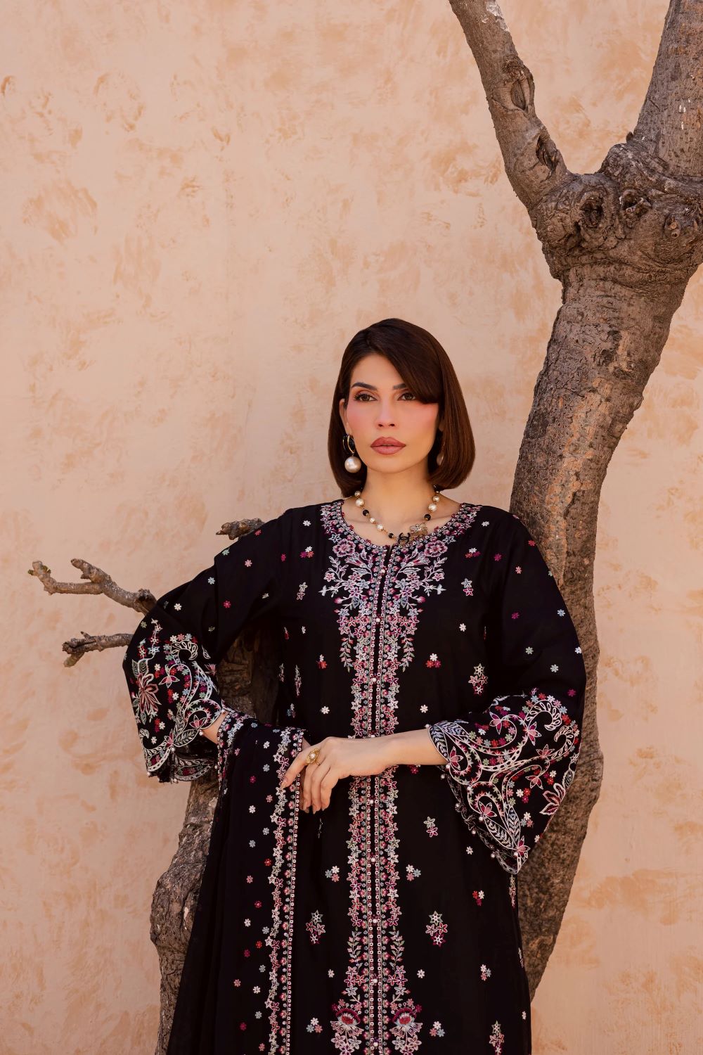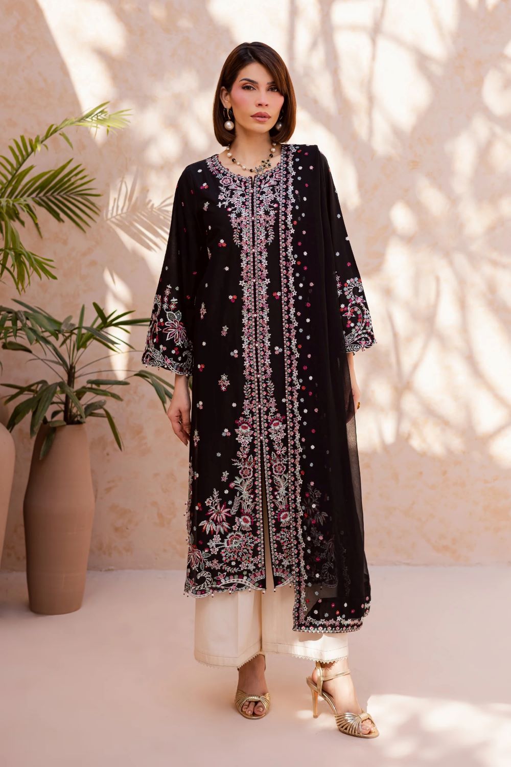 This three-piece ensemble features an embroidered front-open black shirt with sleeves, designed with composed embroidery and intricate boring detailing. The hem and side chaaks are finished with refined kaviya accents, while the flared sleeves add graceful movement and structure.