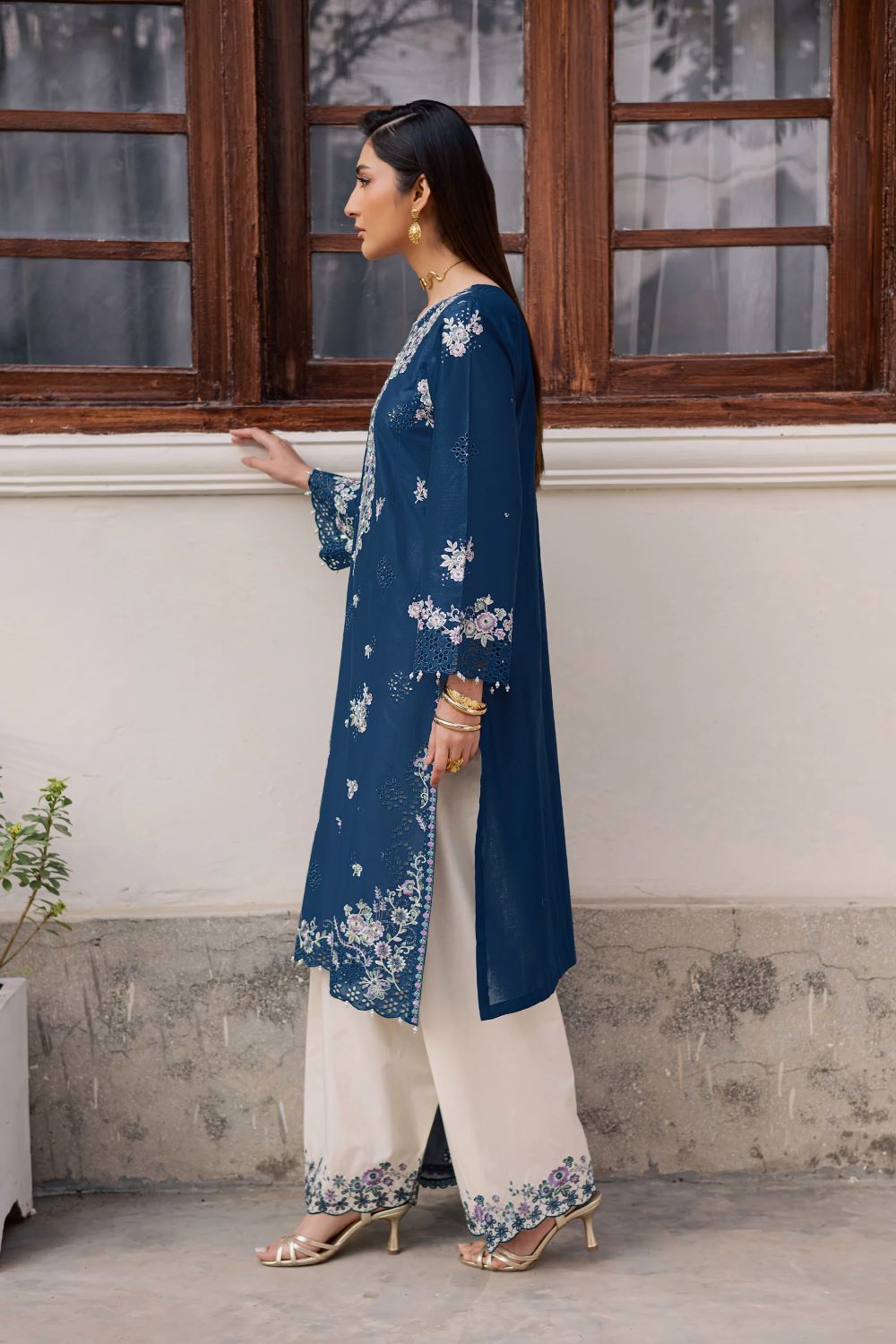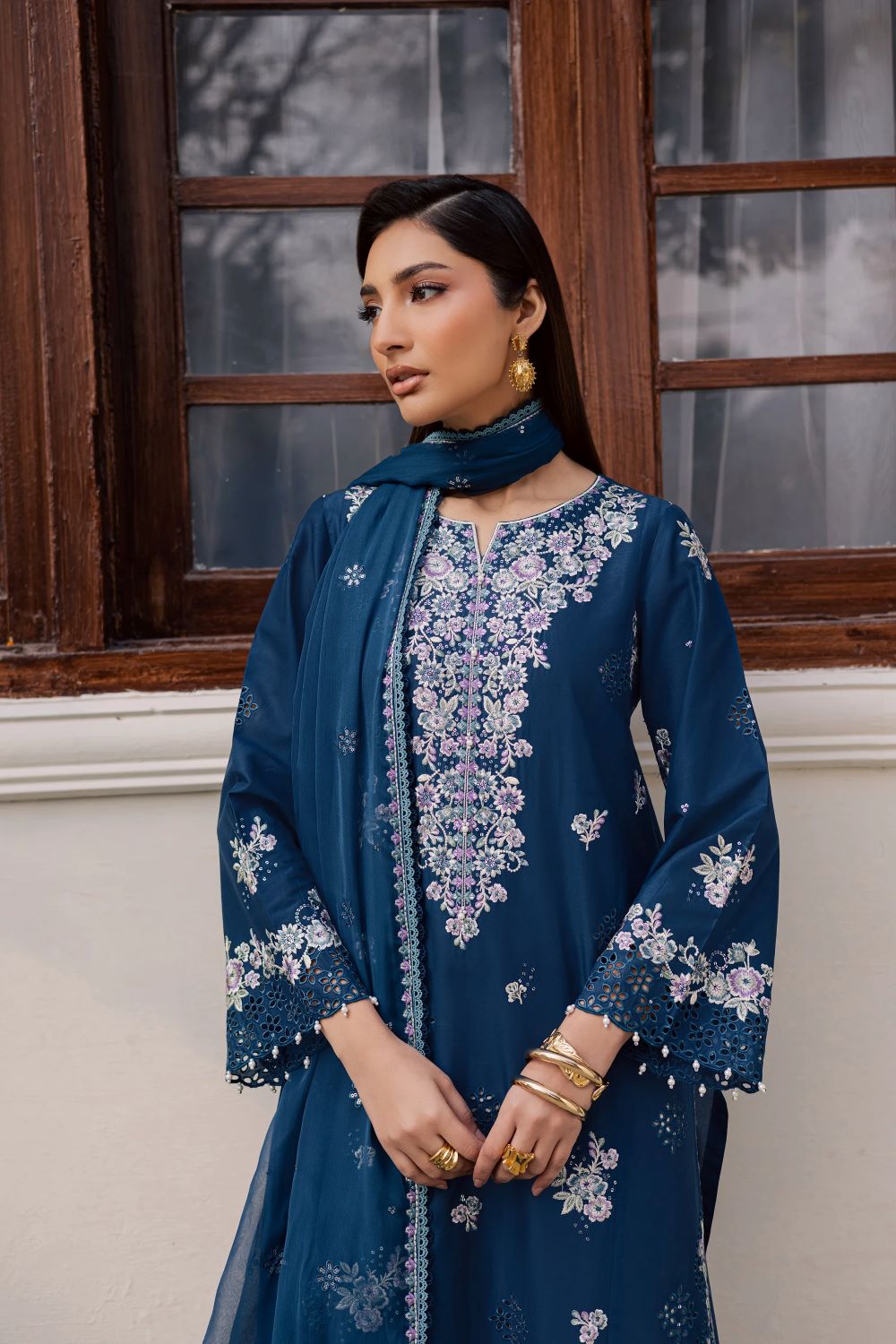 This Eid lawn ensemble features a deep blue embroidered shirt adorned with colored floral motifs, enhanced with sequin and tilla detailing. The front is finished with all over boring, adding texture while keeping the design airy and suitable for Eid day wear.