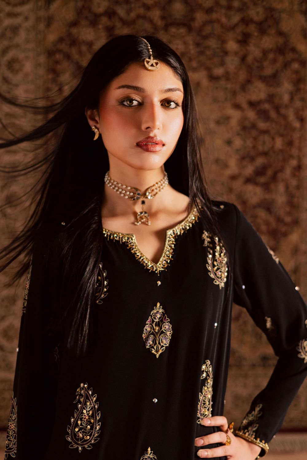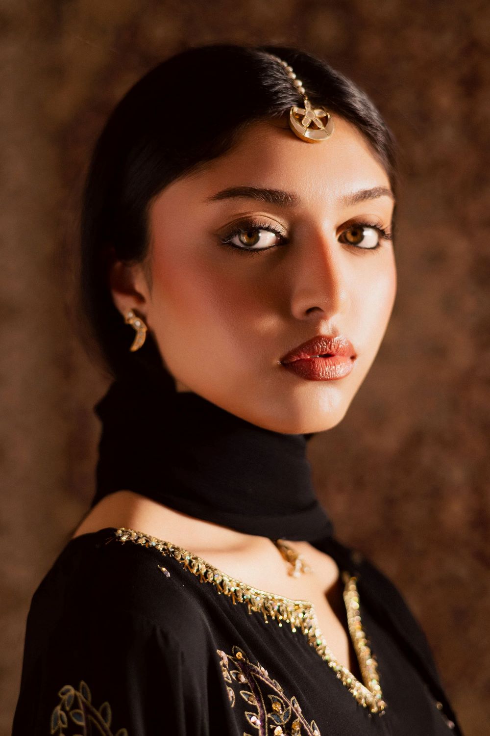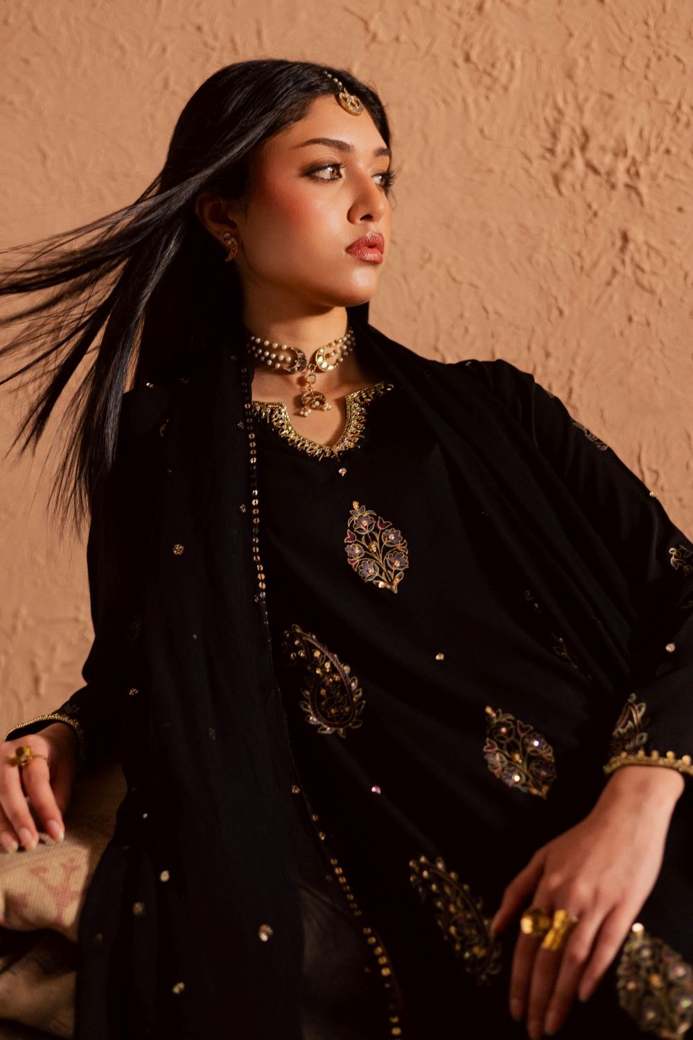 A chiffon dupatta with a delicate sequin spread completes the look, bringing lightness and shimmer to the ensemble. The overall composition exudes refined sophistication and effortless festive charm.