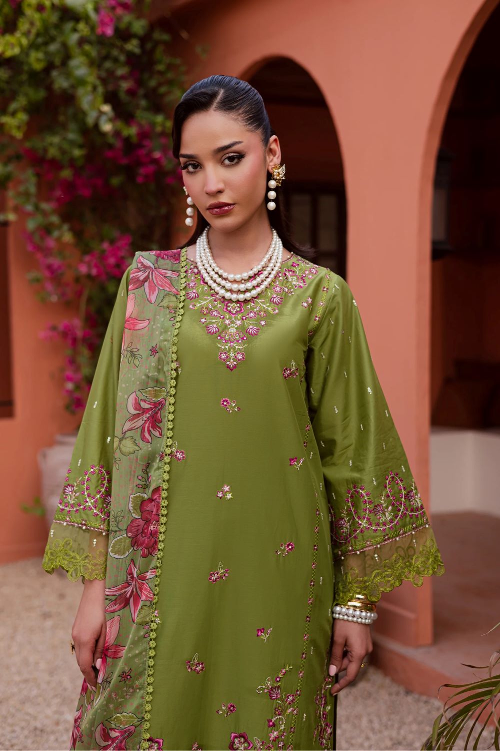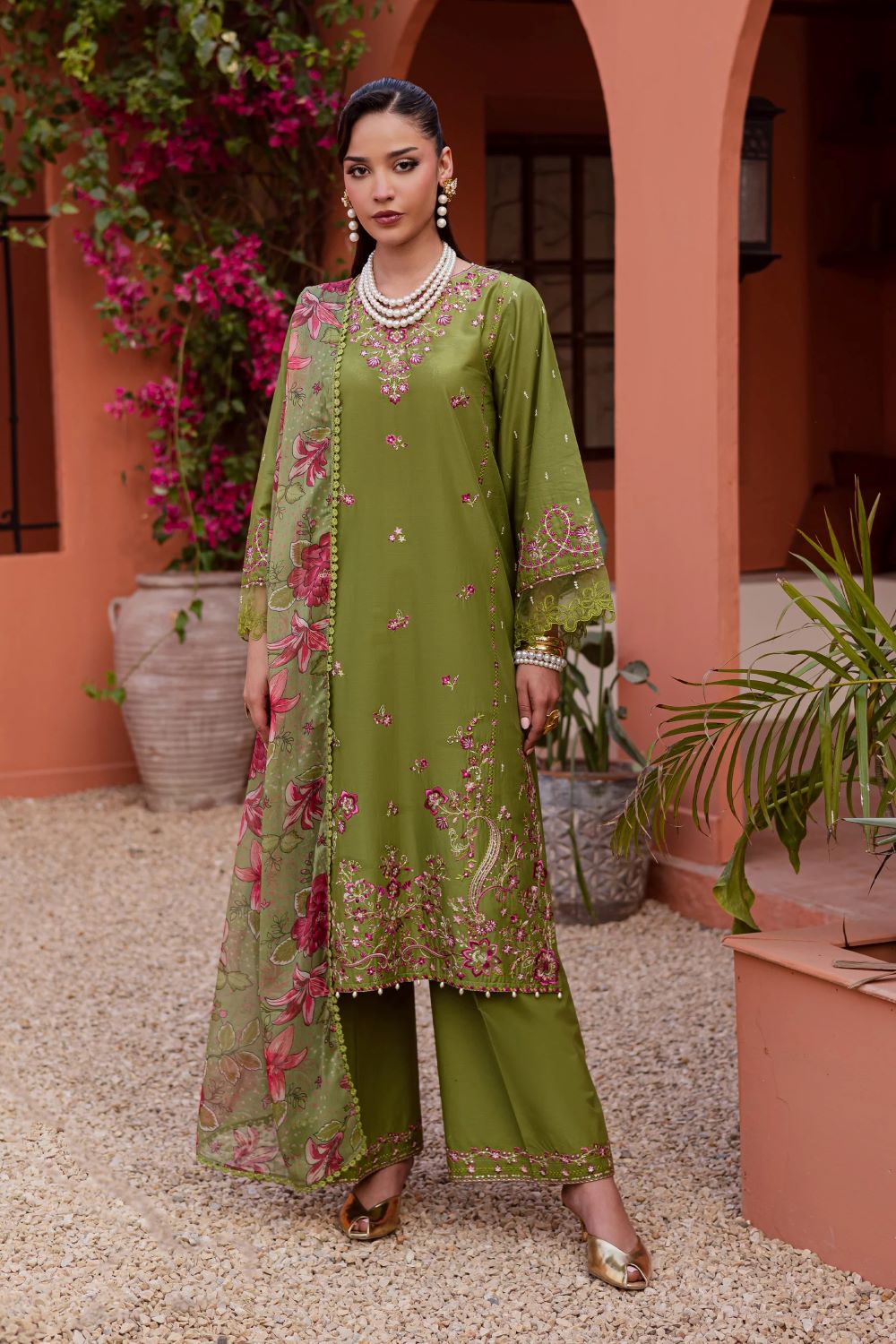 This three-piece ensemble features a fern-coloured long embroidered shirt with sleeves, adorned with intricate embroidery across the silhouette that enhances the design with refined festive elegance. The sleeves are elevated with organza patch embroidery, adding delicate texture and graceful detail.