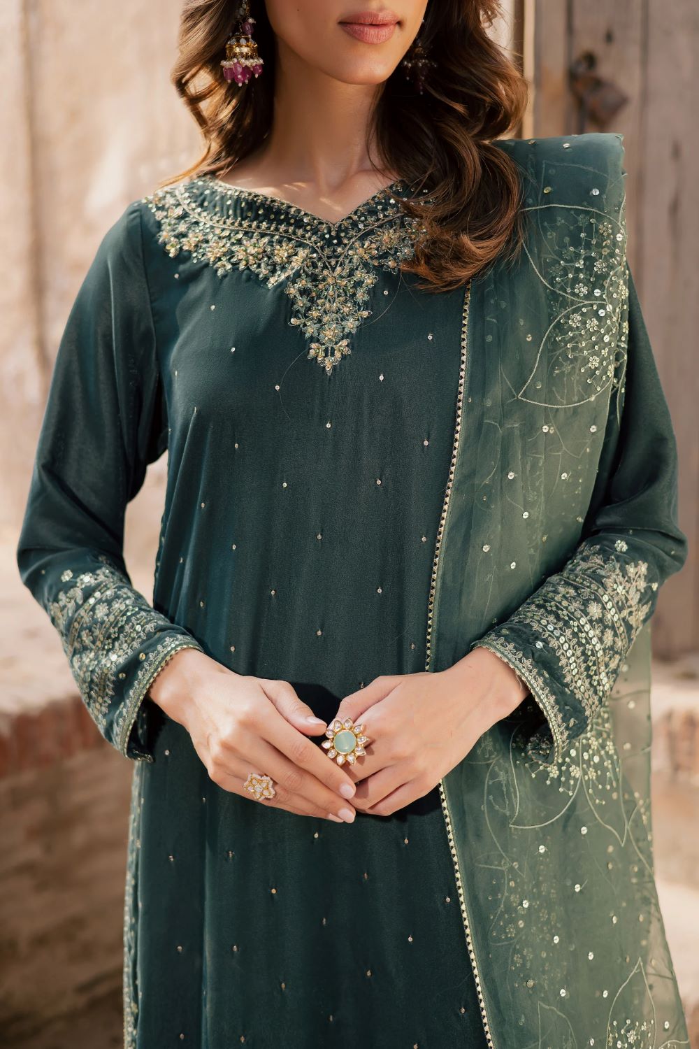 Paired with an embroidered velvet sharara, the ensemble exudes festive opulence. The sharara is finished with samosa lace, enhancing its traditional elegance while maintaining a soft, graceful flow.