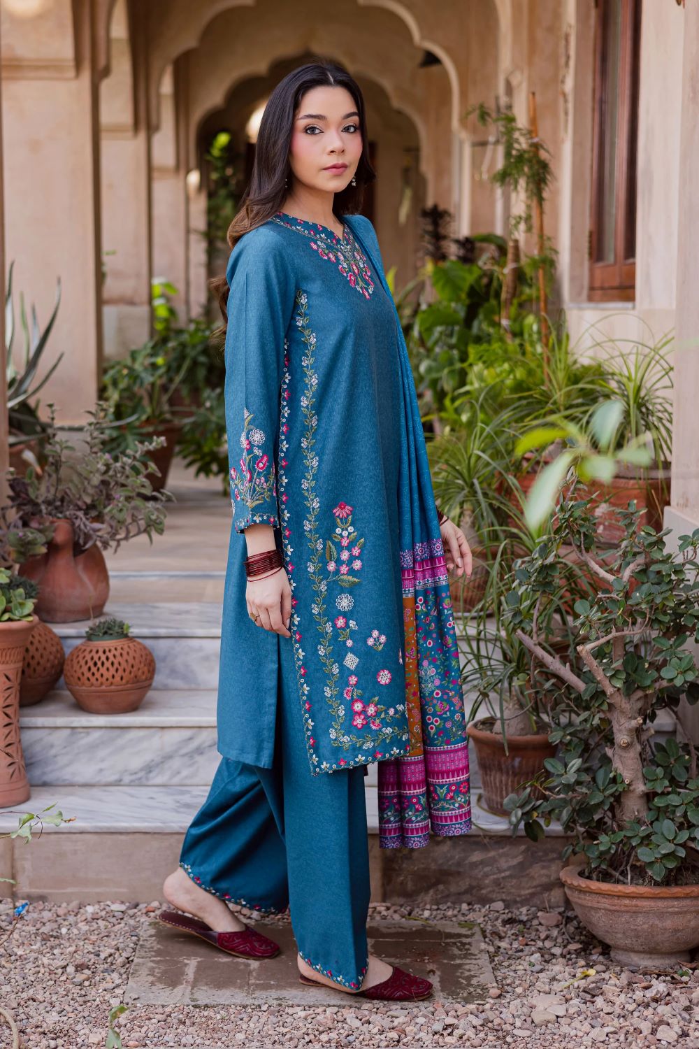 Completing the ensemble is a printed herringbone shawl that brings contrast and character to the outfit. Its rich print and soft texture add warmth and elegance, creating a perfect balance of tradition and contemporary charm.