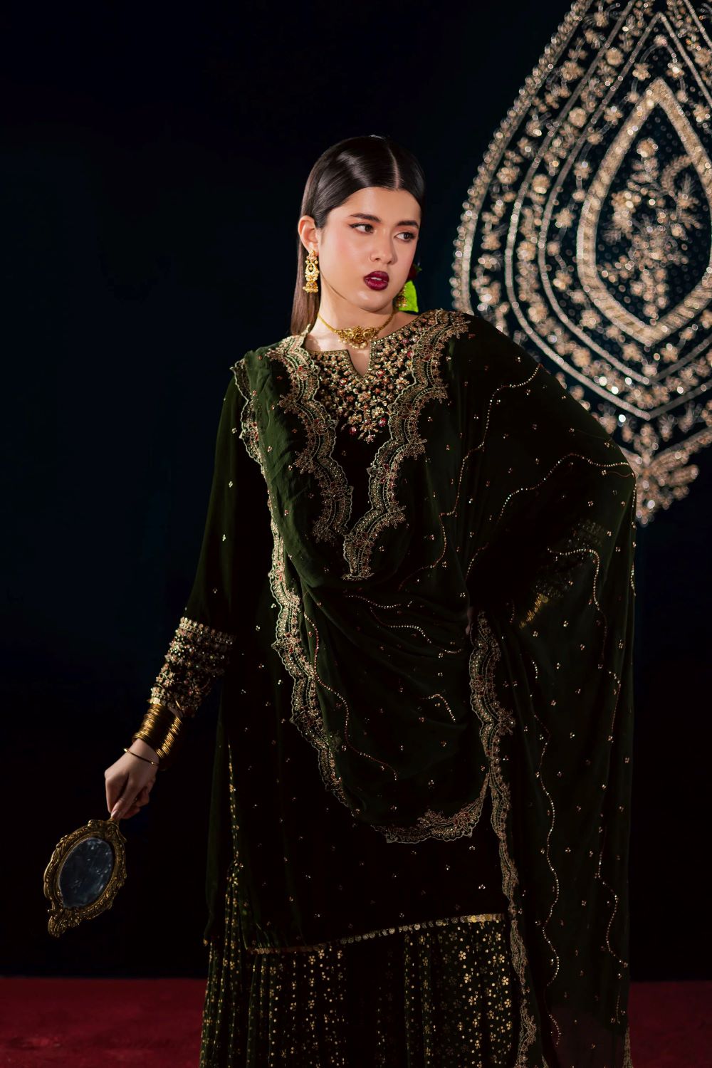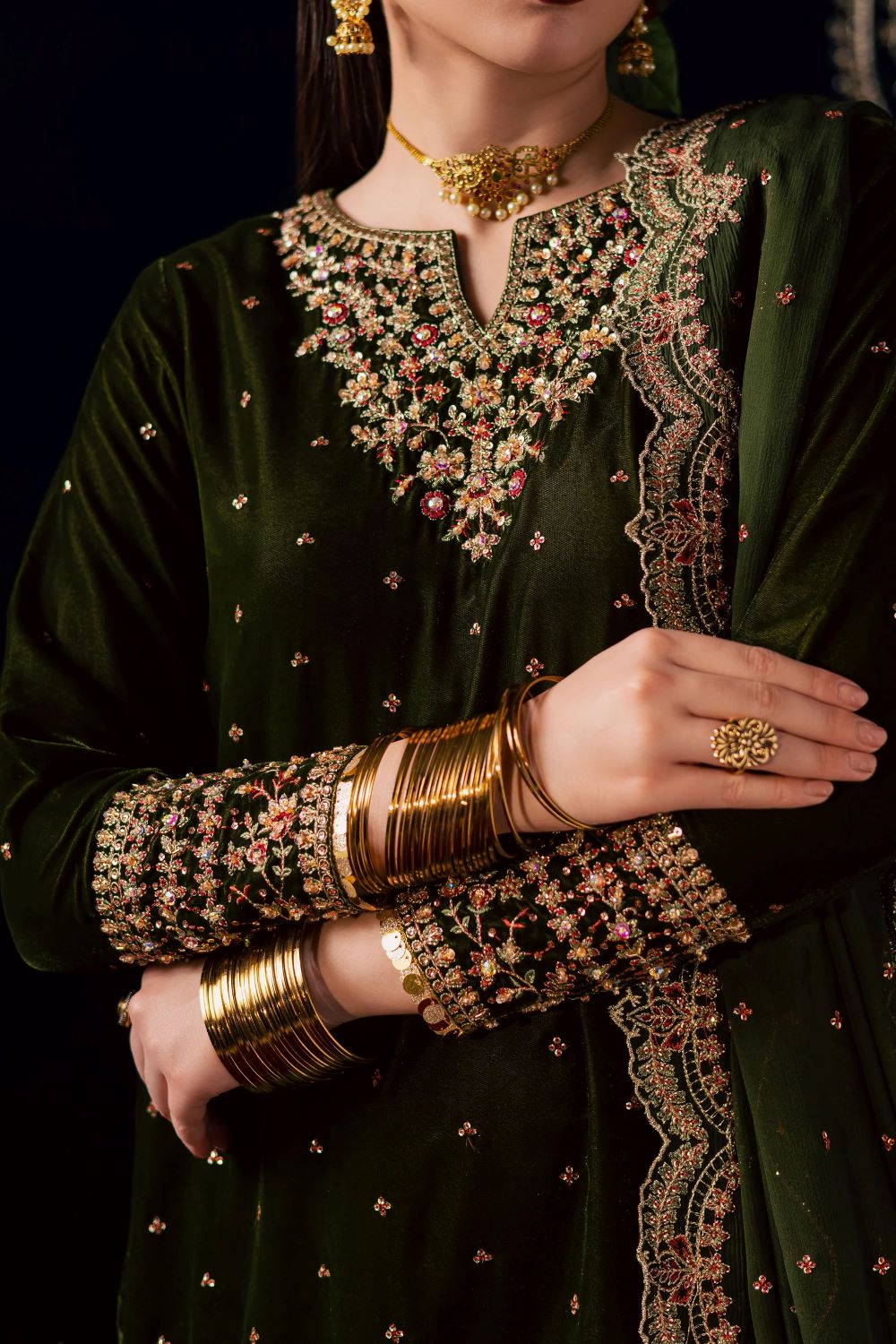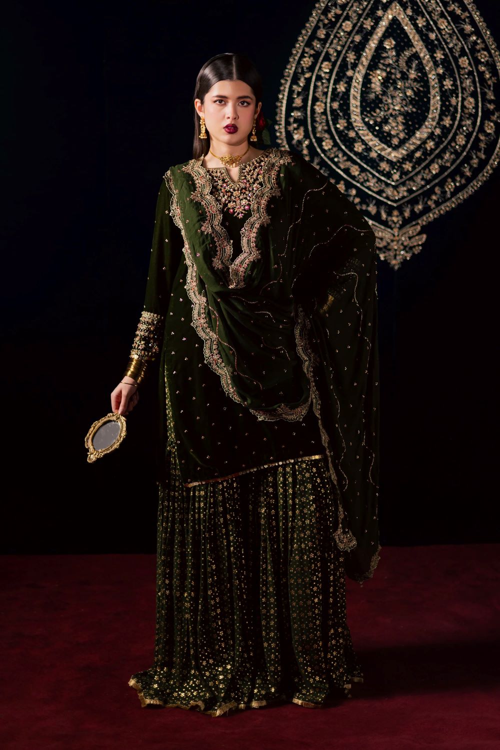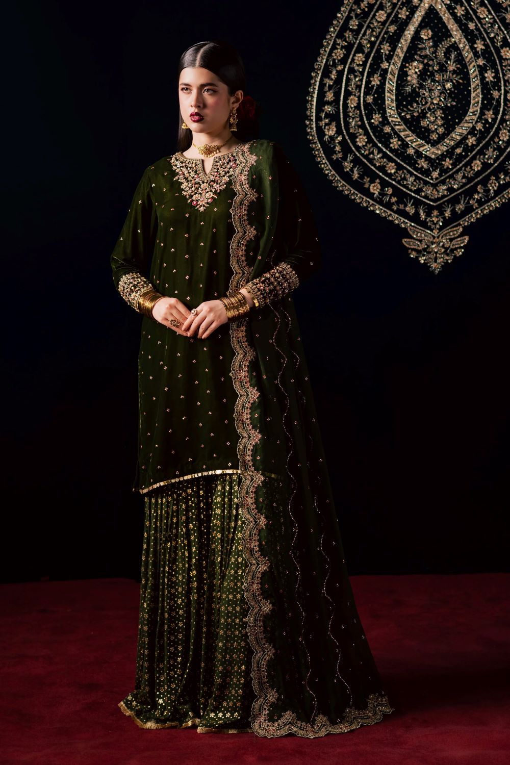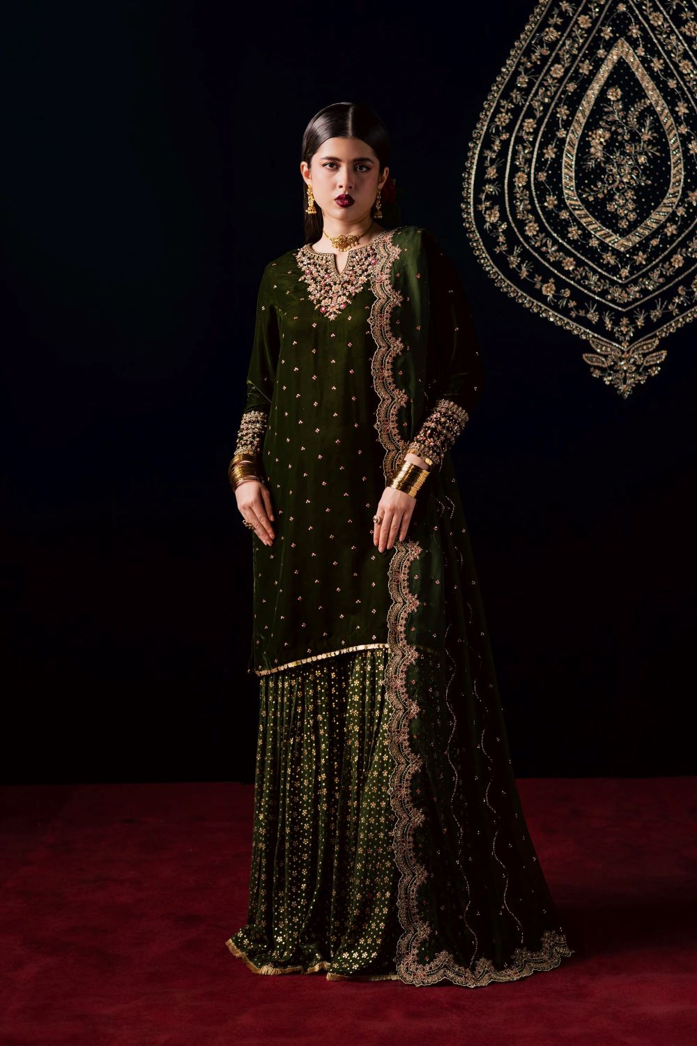 This exquisite three piece ensemble features a velvet short shirt adorned with a delicate sequin embroidery spread and a composed neckline accented with subtle adda work. The fitted sleeves are beautifully finished with embroidered borders, further enhanced with fine hand embellishments that add a touch of shimmer and sophistication. The rich texture of velvet paired with the detailed craftsmanship makes this outfit a true statement of refined elegance.