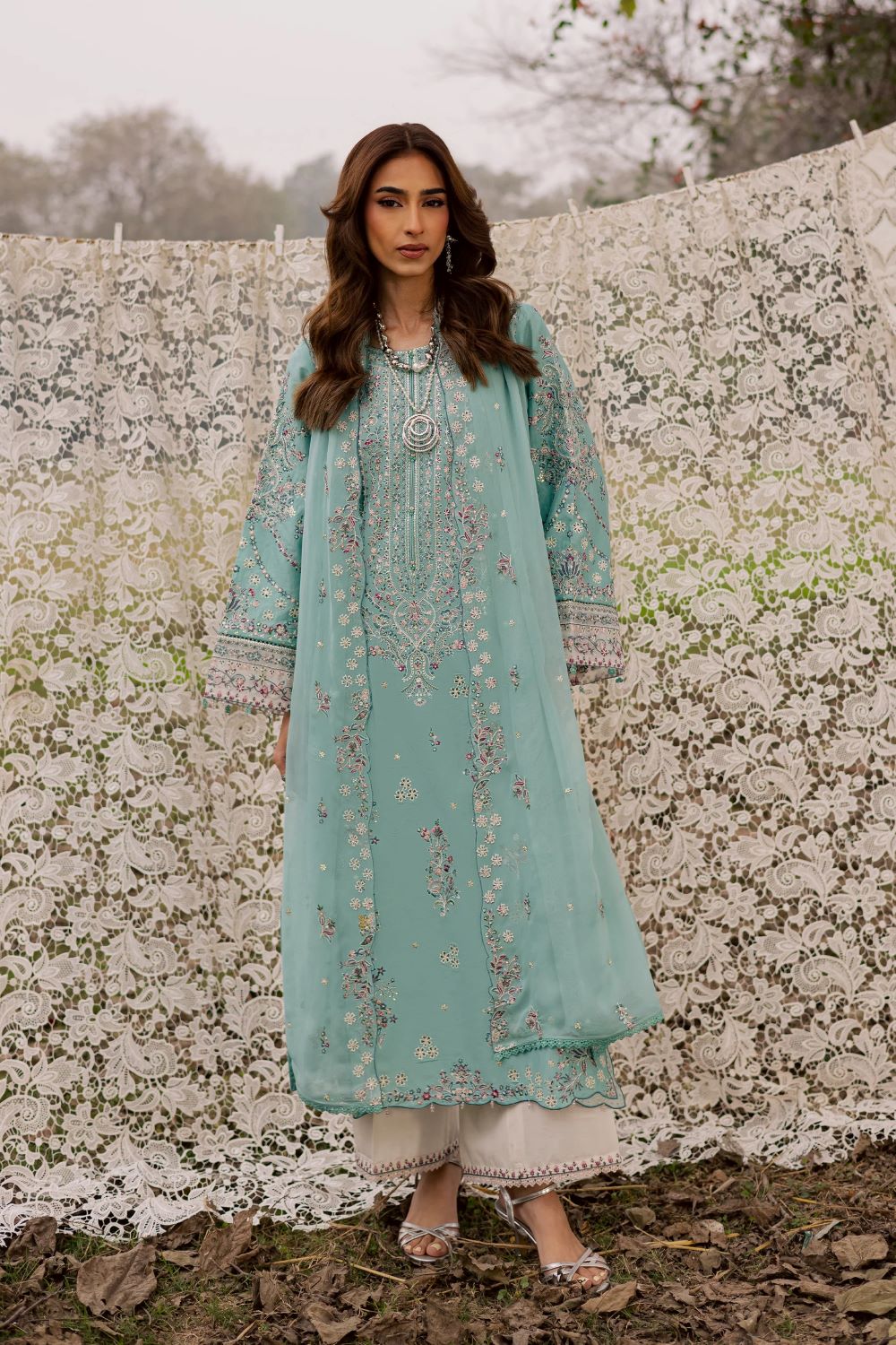 This opulent 3pc set in Pima lawn features a heavily embroidered long shirt with hand embellishments, organza detailing along the hem, and full-length flared sleeves finished with lace and embroidered organza borders. The neckline is delicately embellished, creating a luxurious and festive Eid look.