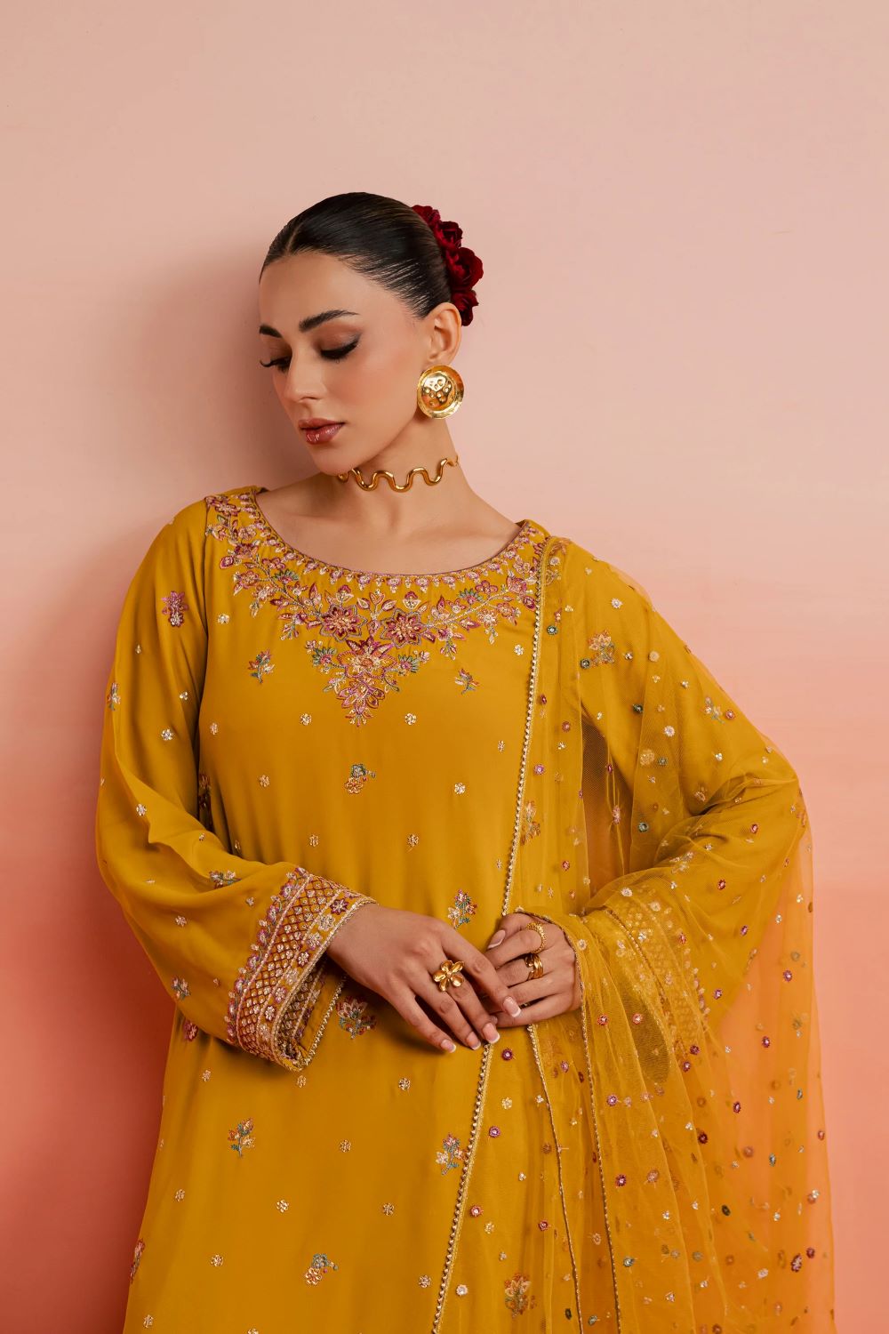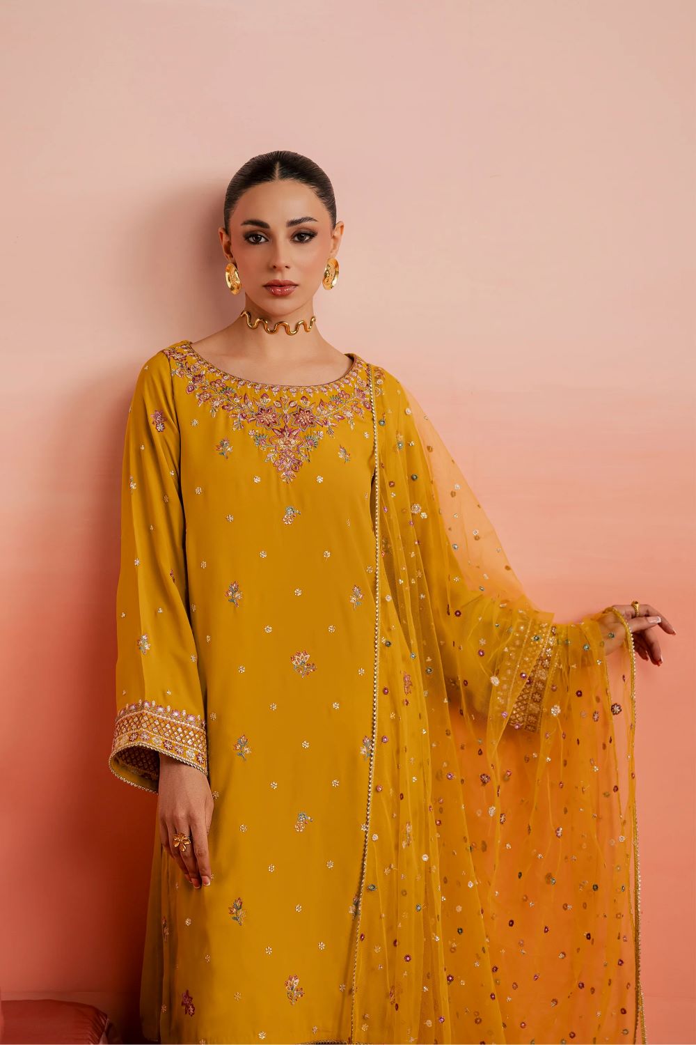 The outfit is paired with a georgette shalwar, finished with a subtle spread that adds volume and movement to the silhouette.