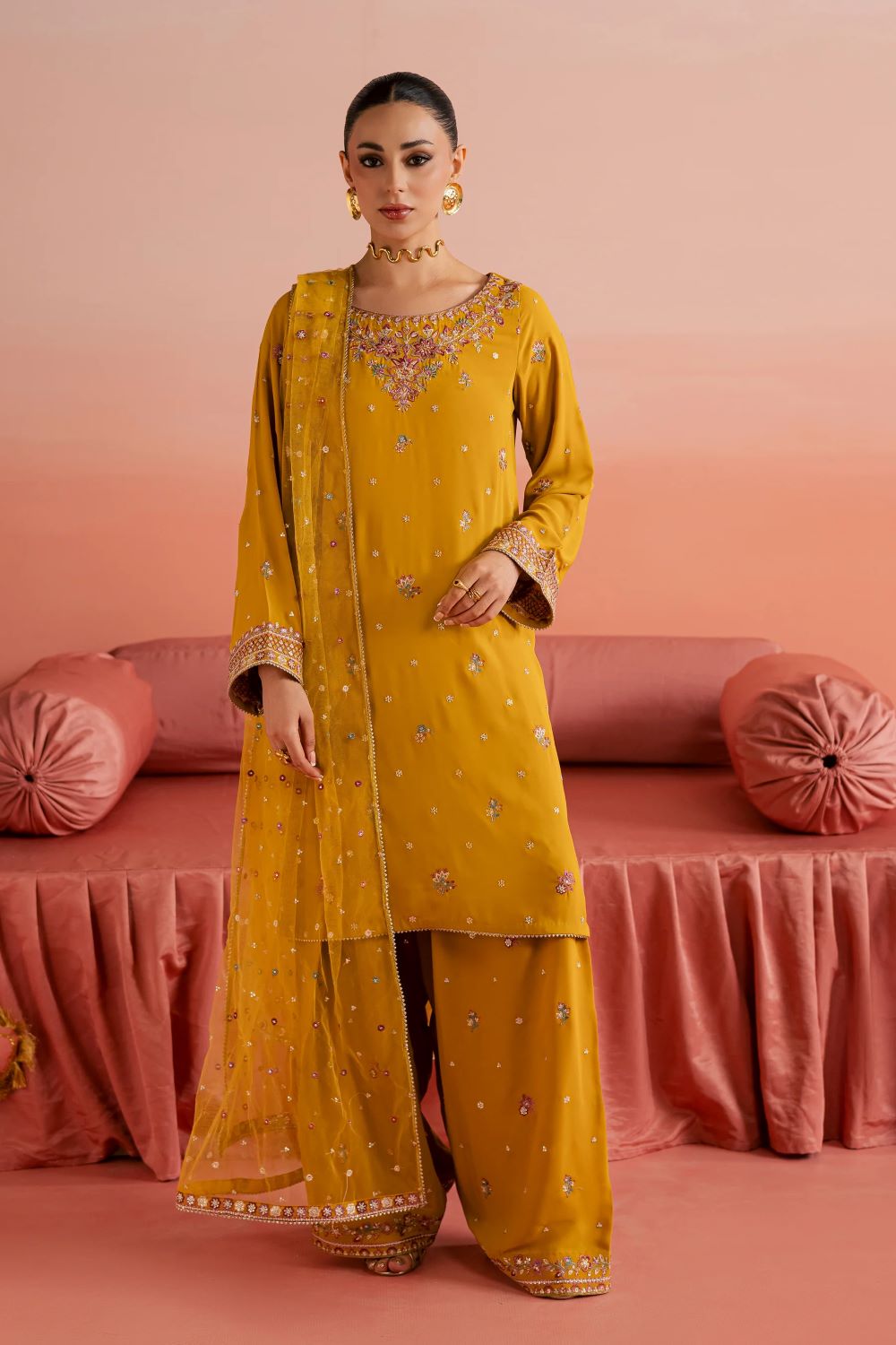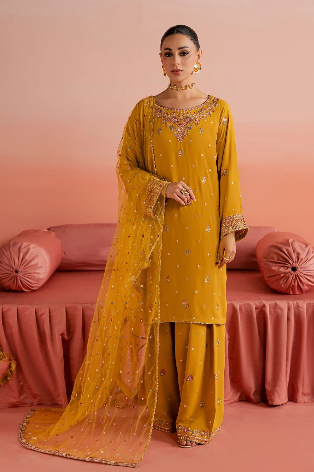 This three-piece georgette ensemble features a short shirt with sleeves, adorned with embroidery across the front and sleeves. The embroidered neckline flows into a delicate spread on the front, creating a balanced festive look with refined detailing.