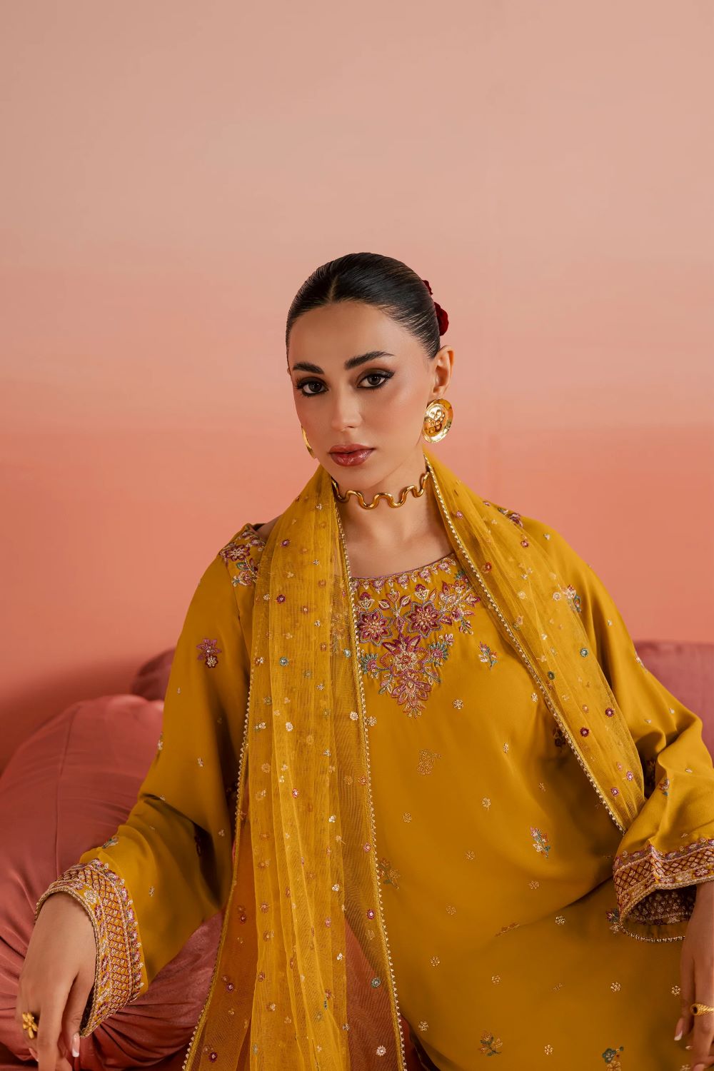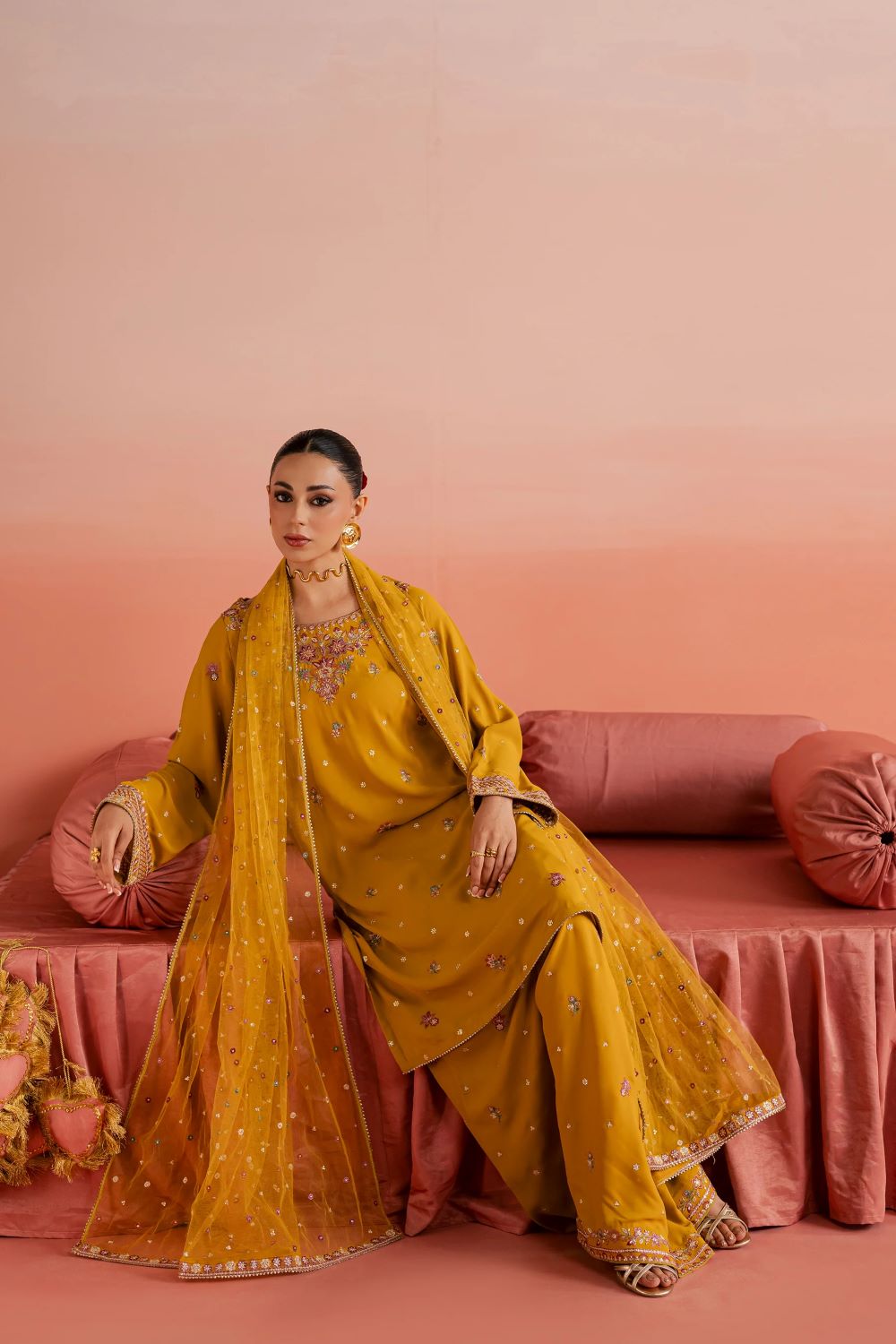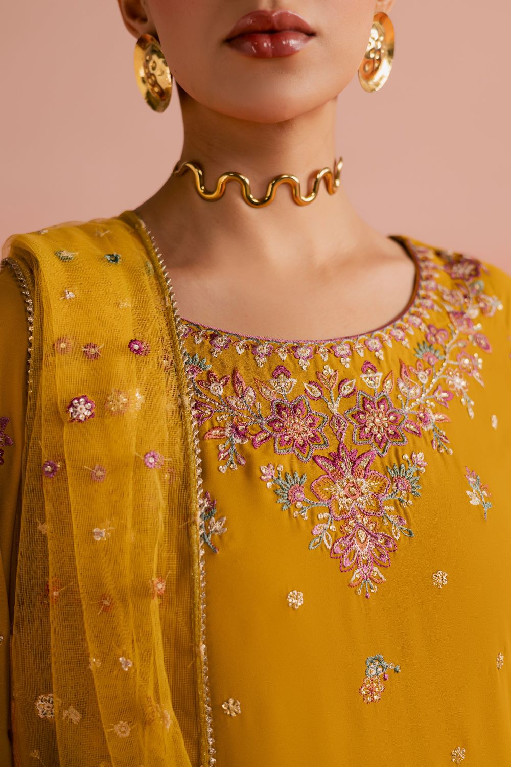 A net dupatta completes the ensemble, finished with samosa lace for a soft and elegant Eid finish