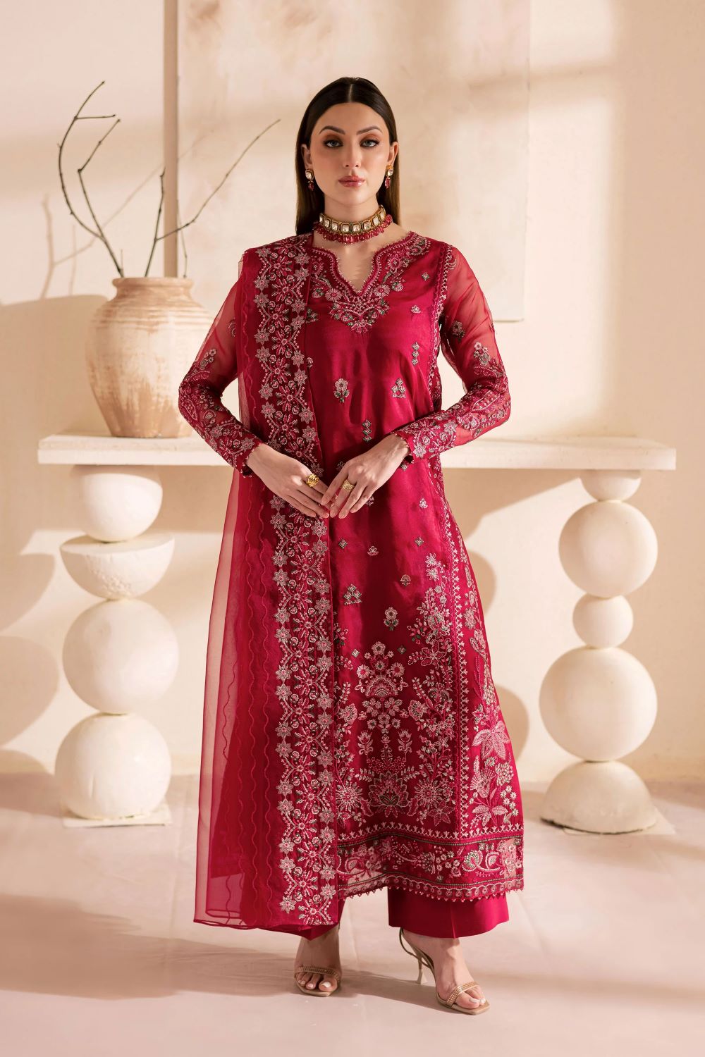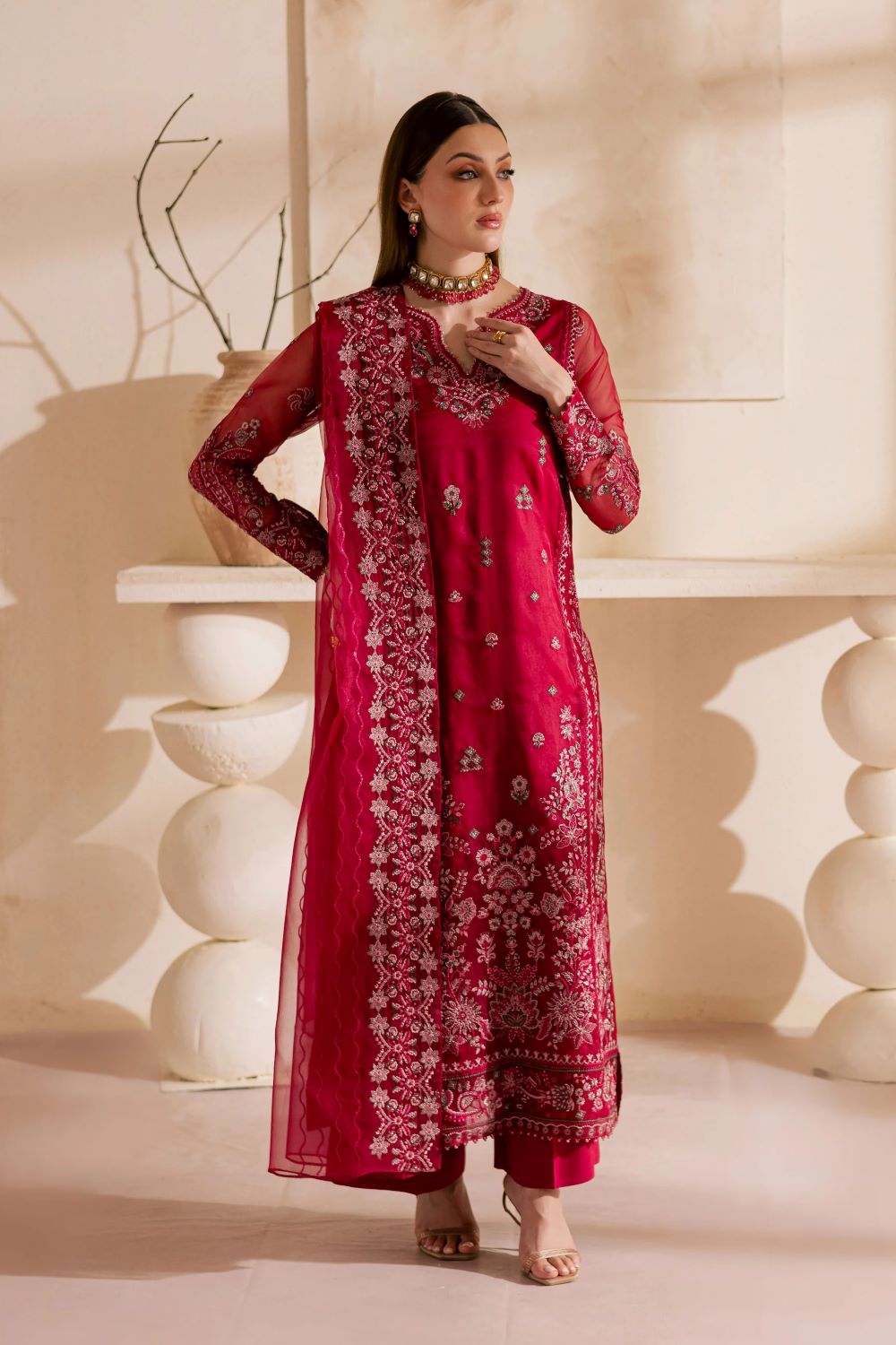 An embroidered organza dupatta completes the look, adding a layer of ethereal grace. Its delicate embroidery and airy drape bring harmony to the ensemble, making it a statement of timeless luxury and festive allure