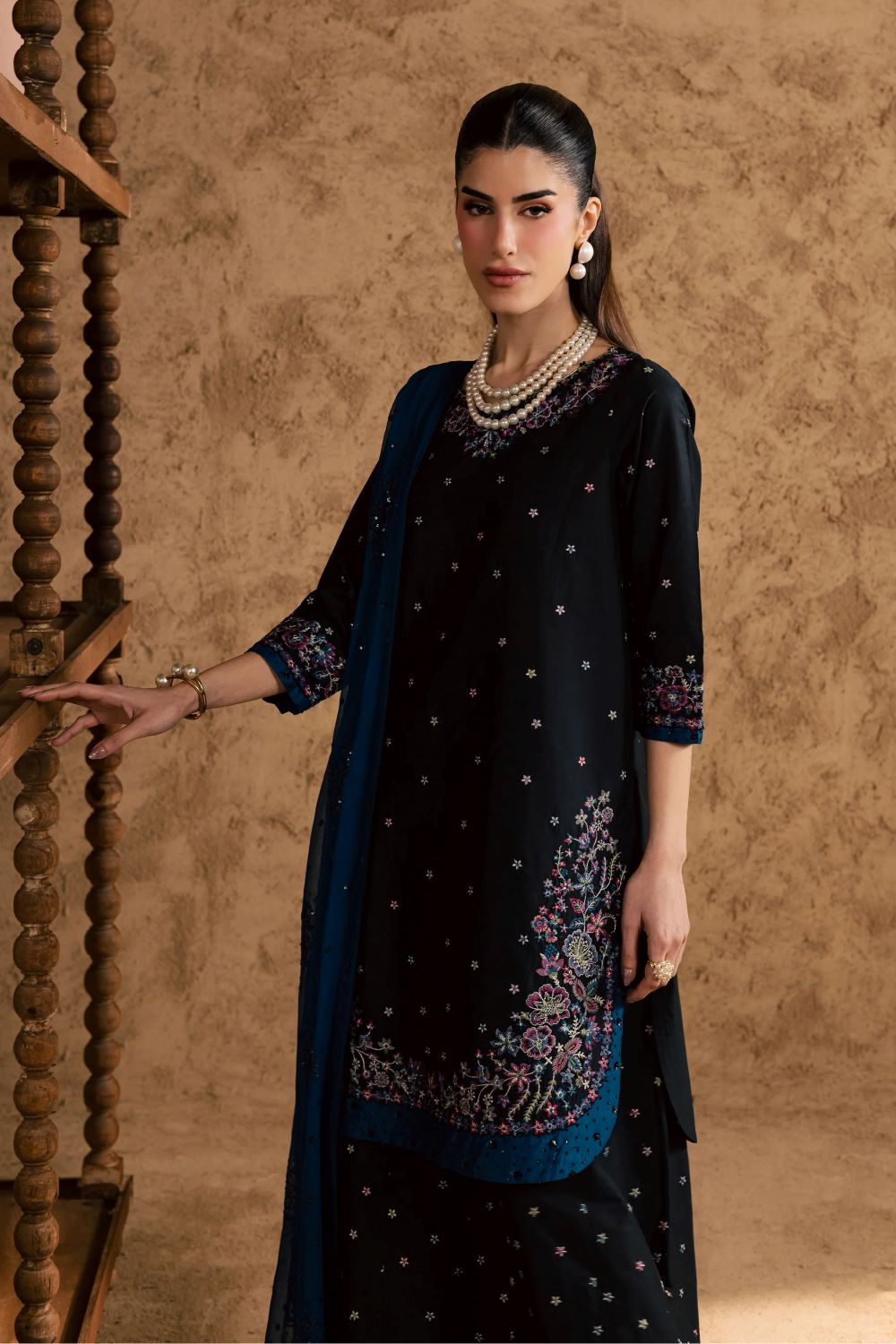 A composed short embroidered shirt featuring elegant color-blocking on the hem and sleeves, enriched with delicate handwork details. Three-quarter fitted sleeves add a refined touch, perfect for Festive Eid occasions.