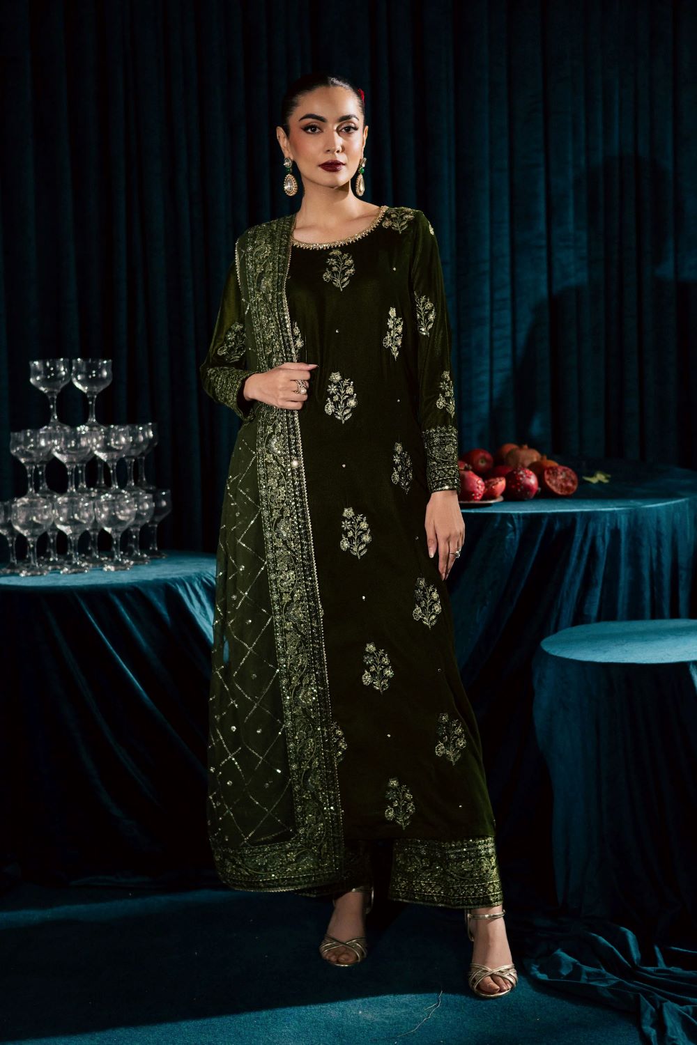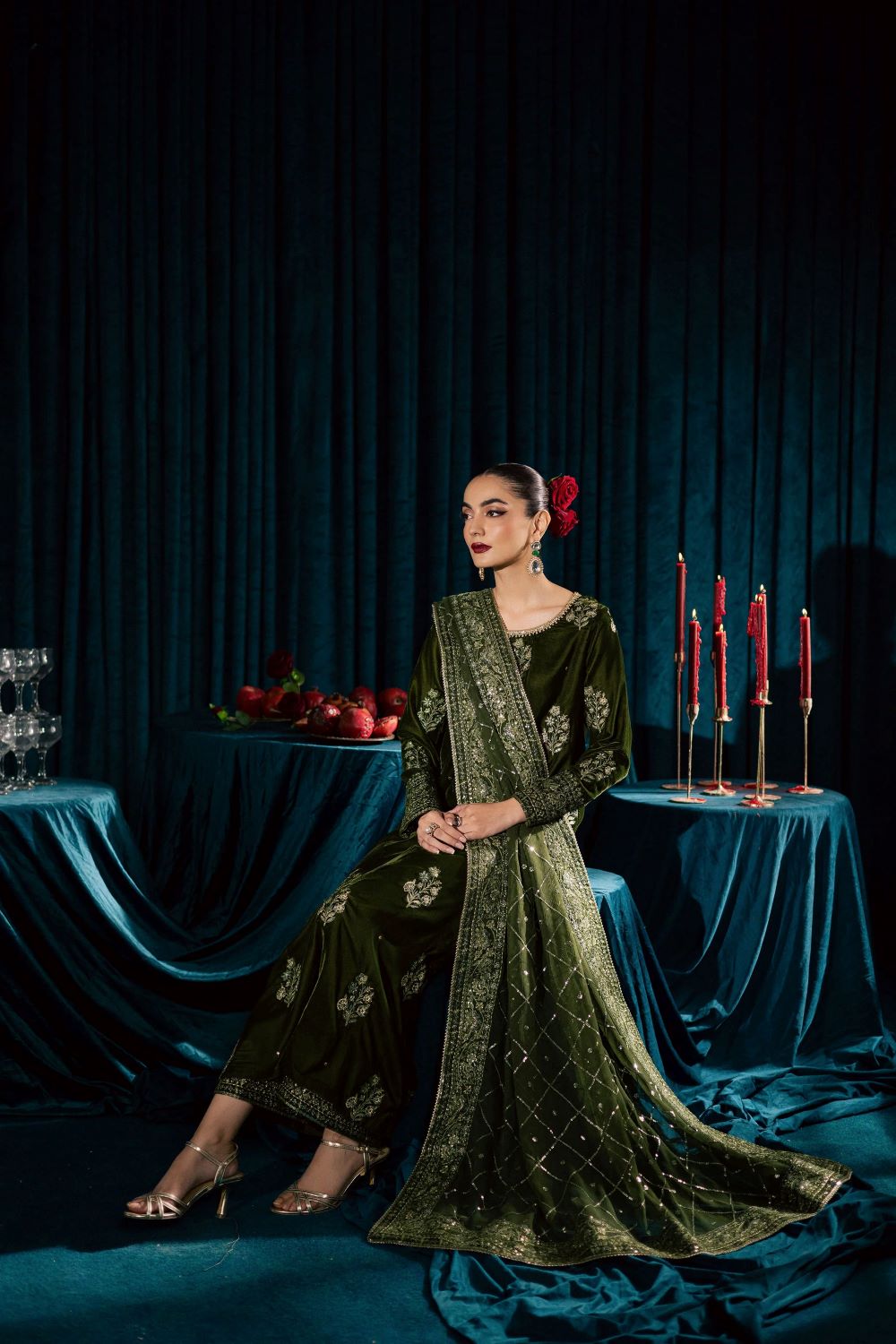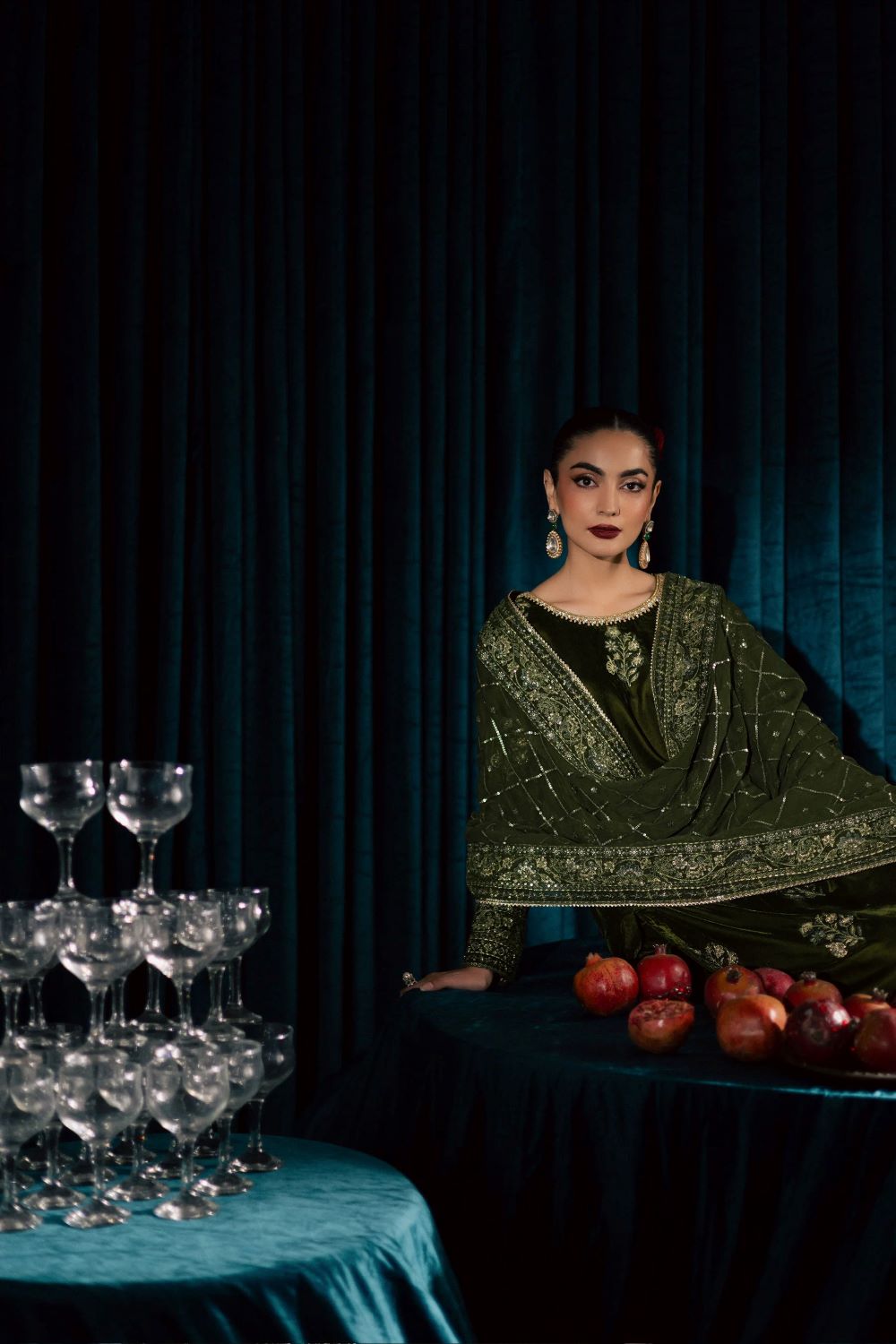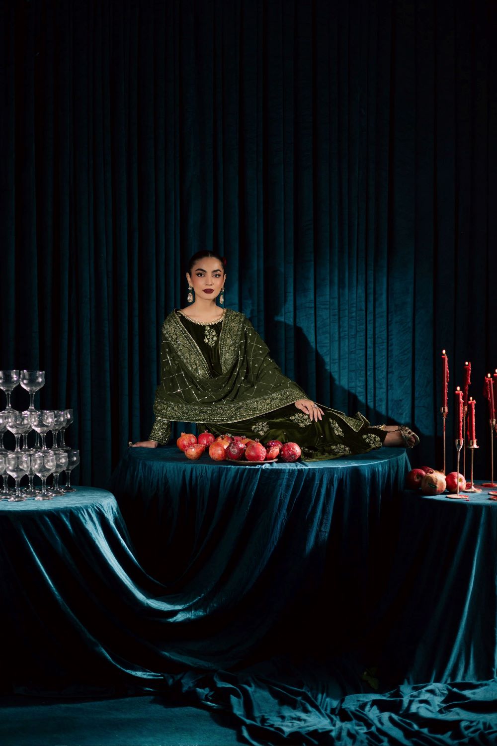 This elegant three piece ensemble features a long velvet shirt adorned with embroidered motif spread and a delicate mukesh spread on the front and sleeves. The neckline is crafted with intricate hand work, adding depth and refined detailing to the rich velvet base. The sleeves are finished with velvet embroidered borders and delicate samosa lace, giving the shirt a graceful and polished finish.
