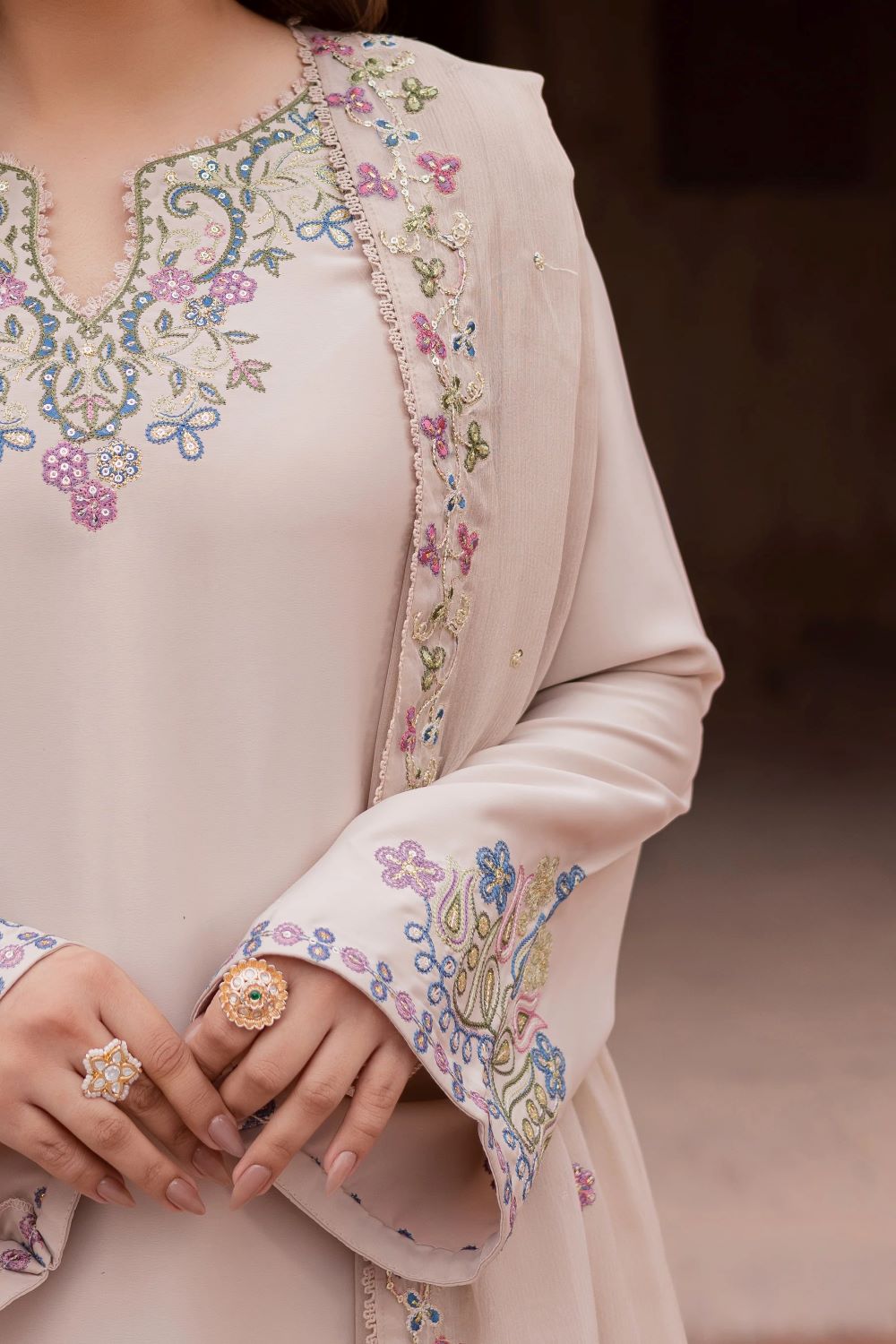 A crinkle dupatta completes the ensemble, designed with an embroidered border and an all over embroidered spread, adding texture and softness to the festive look.