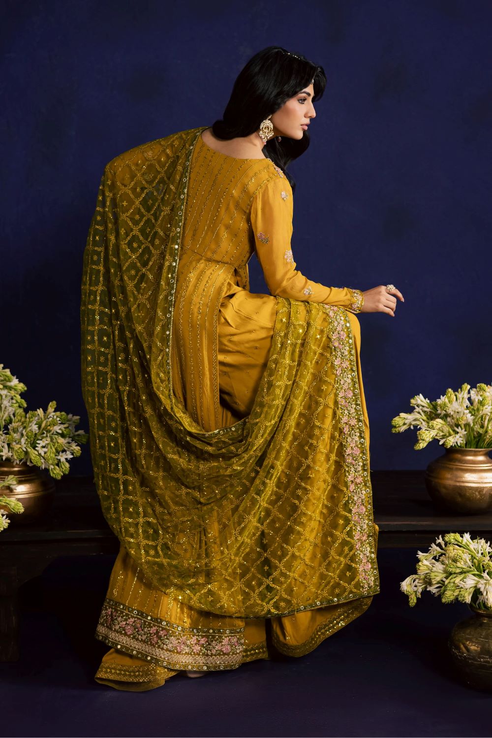 The paneled raw silk sharara brings balance to the ensemble with its structured yet fluid fall. Finished with a contrasting organza border and elegant golden samosa lace, it adds richness while maintaining a graceful movement.