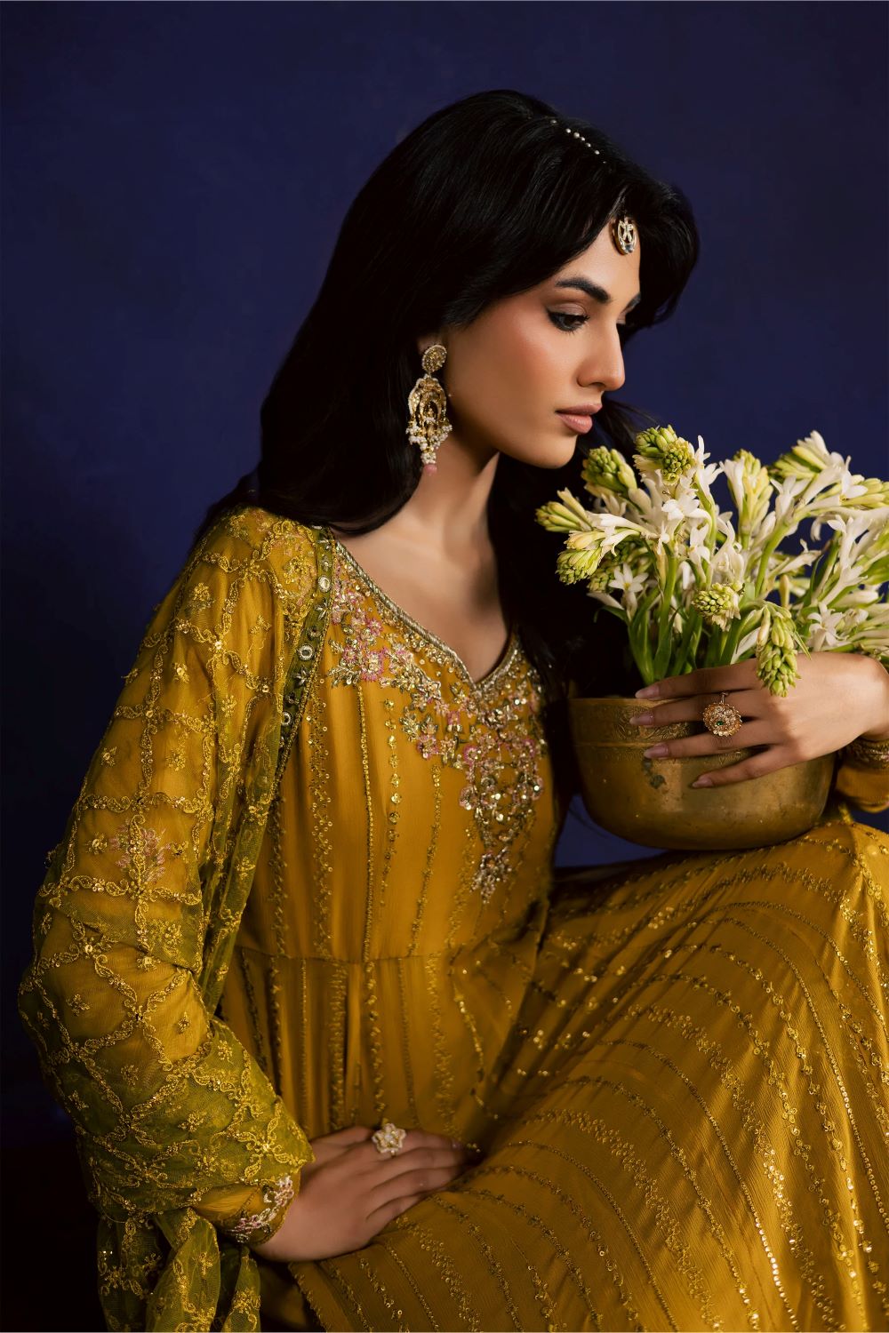 The look is completed with a contrast embroidered net dupatta, finished with organza borders on all four sides and subtle lace detailing, tying the entire ensemble together with effortless sophistication.