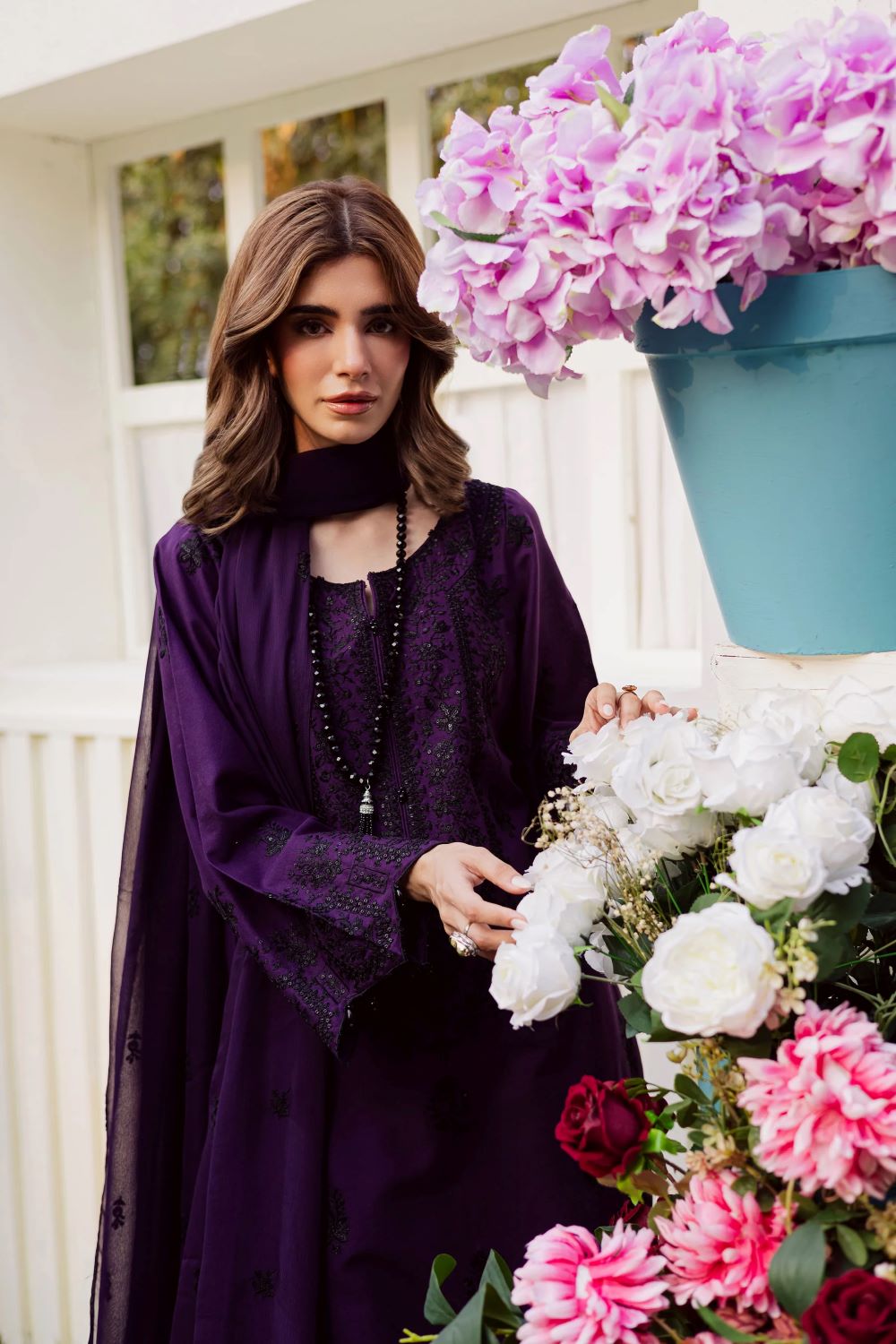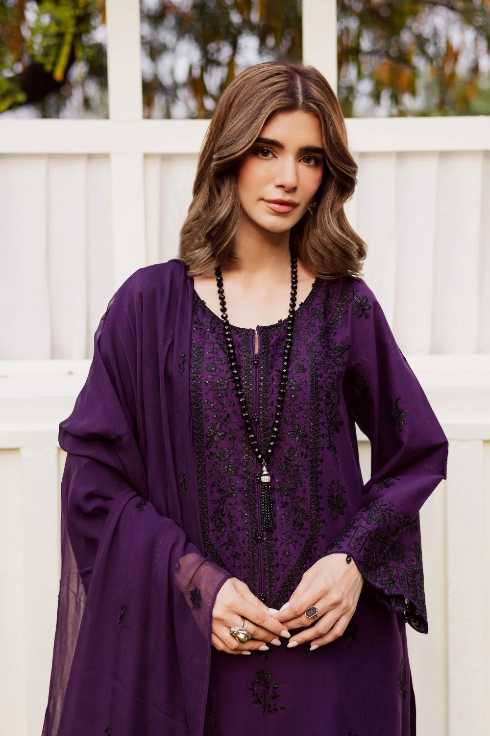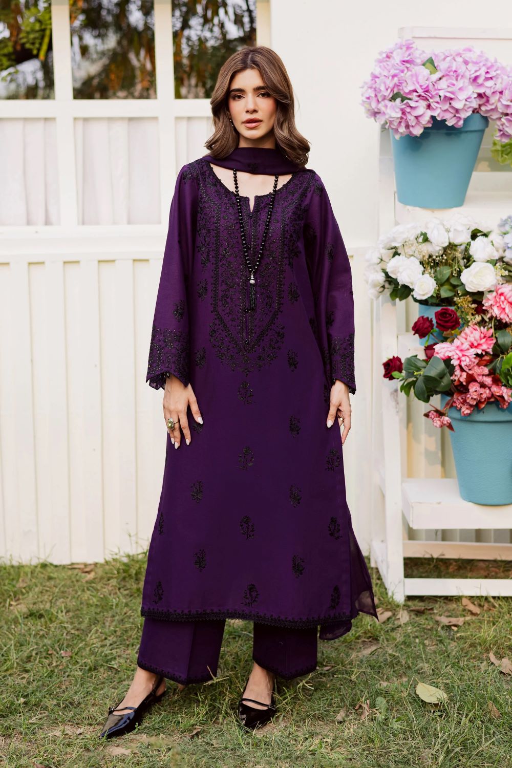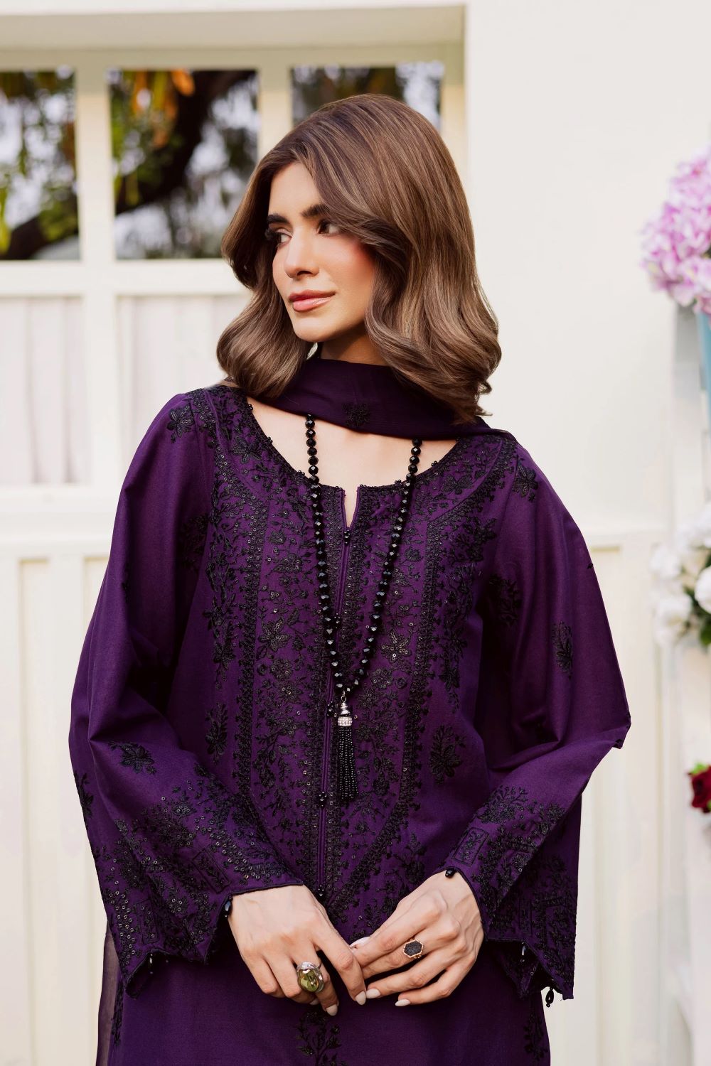 This 3-piece khaddar ensemble is a perfect mix of elegance and comfort, crafted for the winter season. The long shirt features intricate embroidery with a beautifully composed neckline and delicate embroidered spread that enhances its timeless appeal. The sleeves are detailed with fine embroidery and finished with kawya edging, giving the outfit a graceful and polished look.