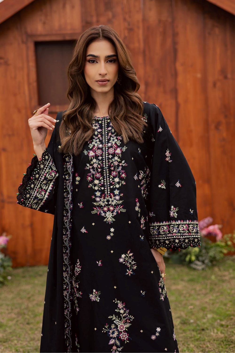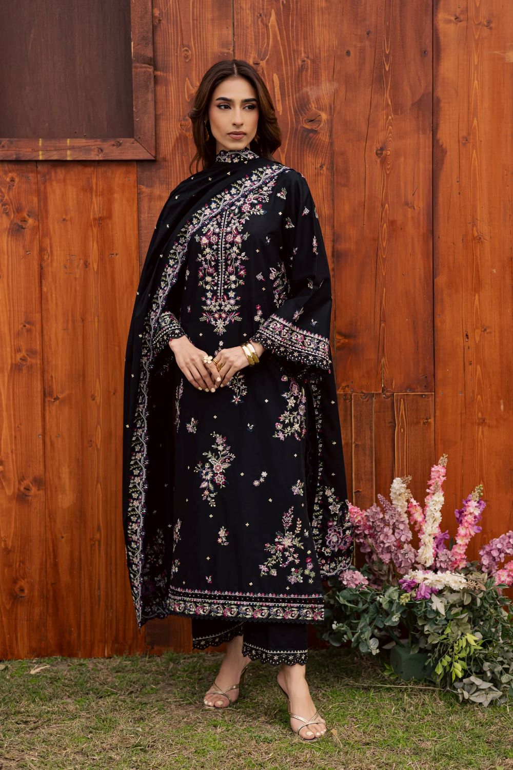 This luxurious 3pc outfit in Pima lawn features a long shirt with a boat neckline, fully embroidered front spread, and fabric-manipulated hem finished with organza embroidered borders