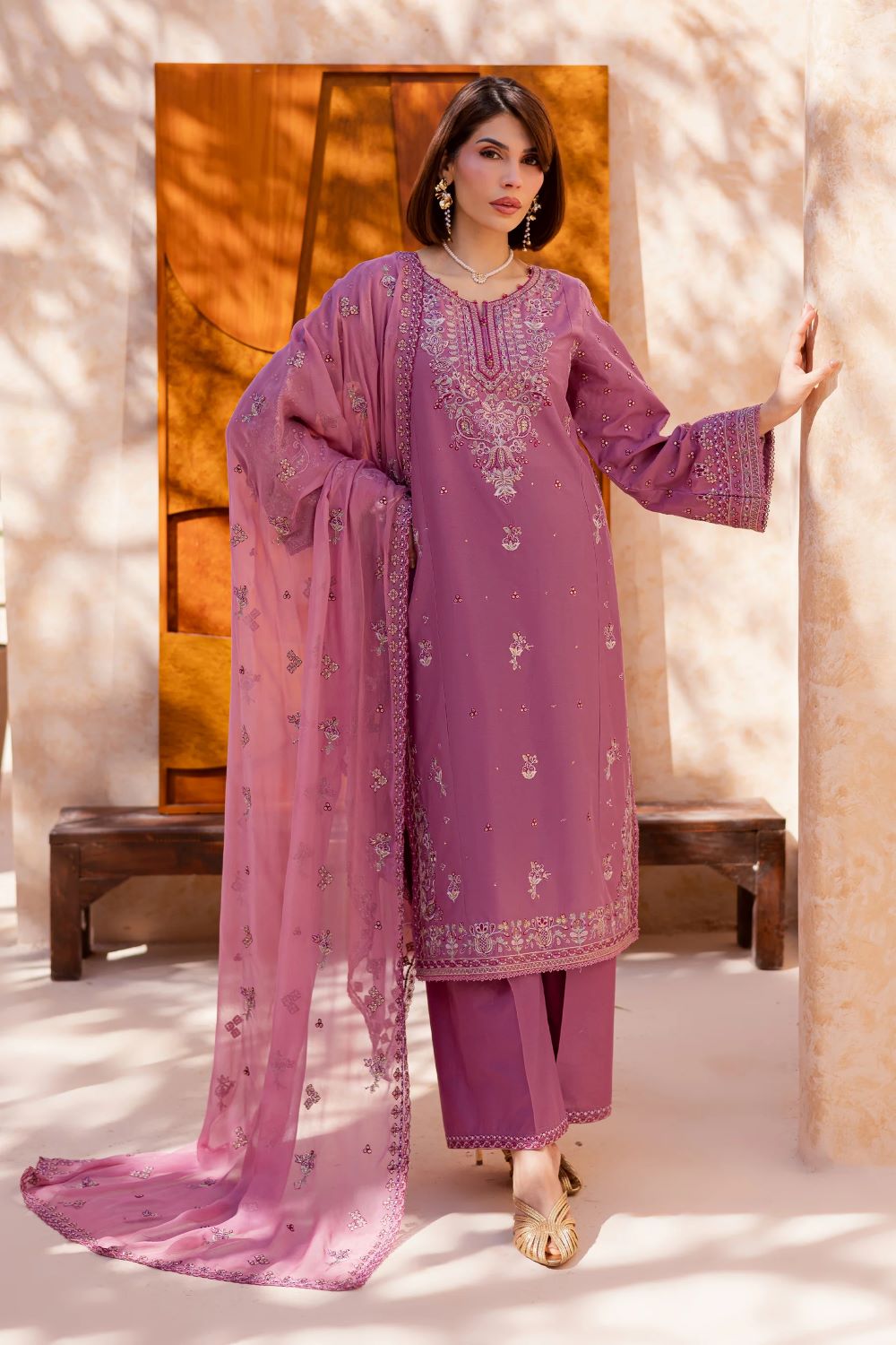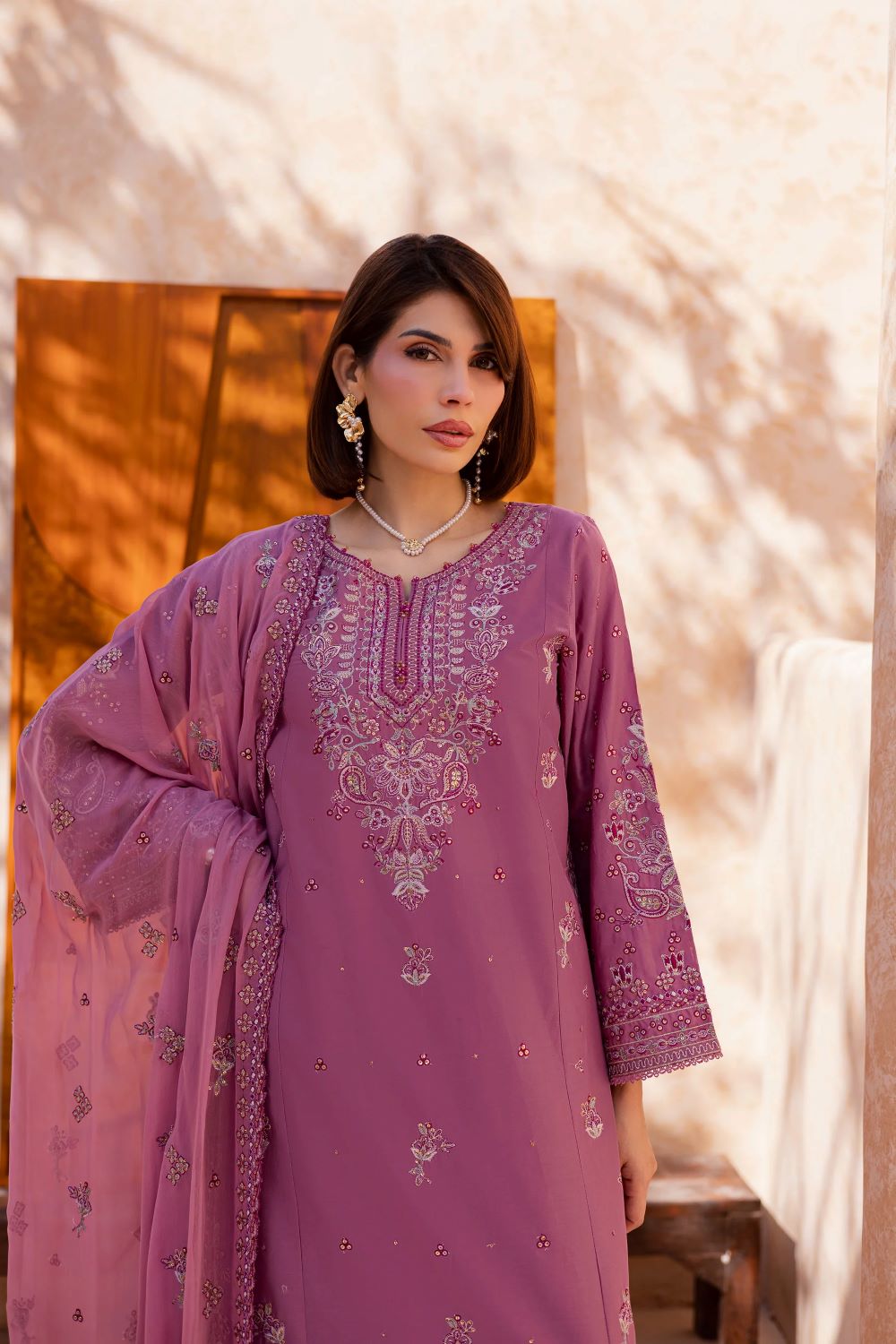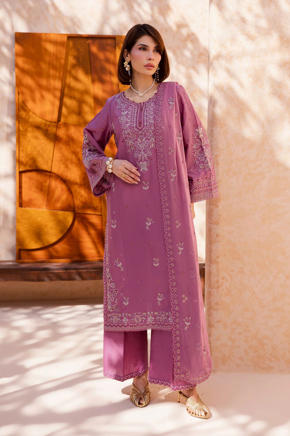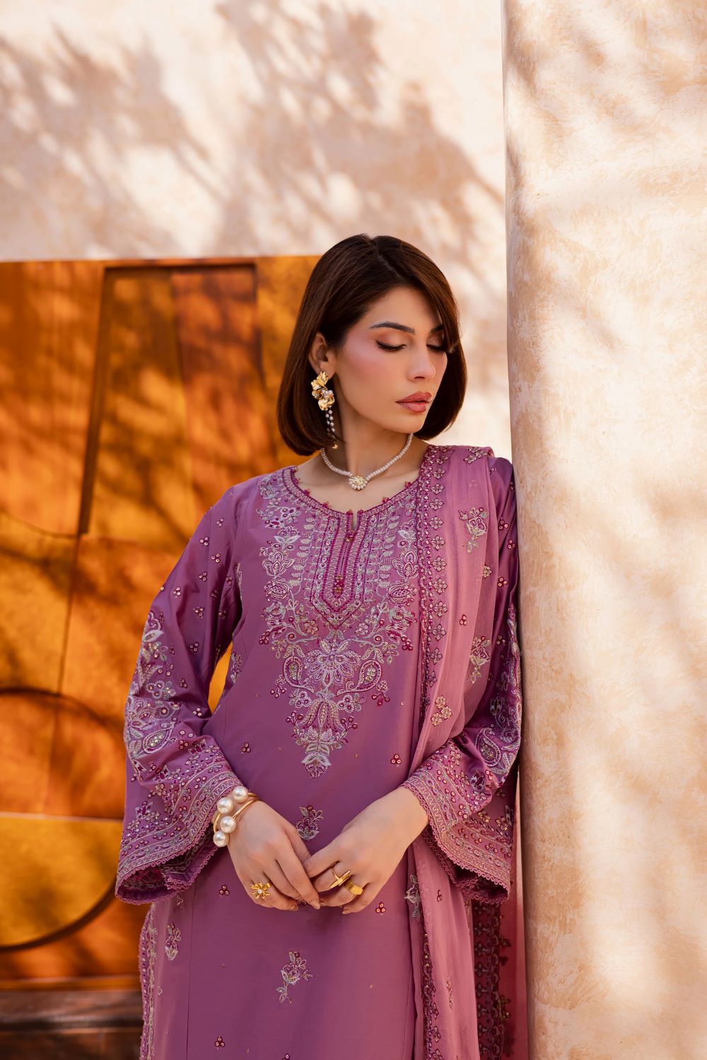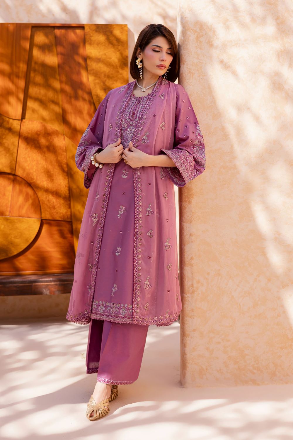 This three-piece ensemble features an onion-colored embroidered shirt with sleeves, adorned with beautifully composed floral embroidery along the side chaaks, front hem, and sleeves, creating a refined and graceful festive silhouette.