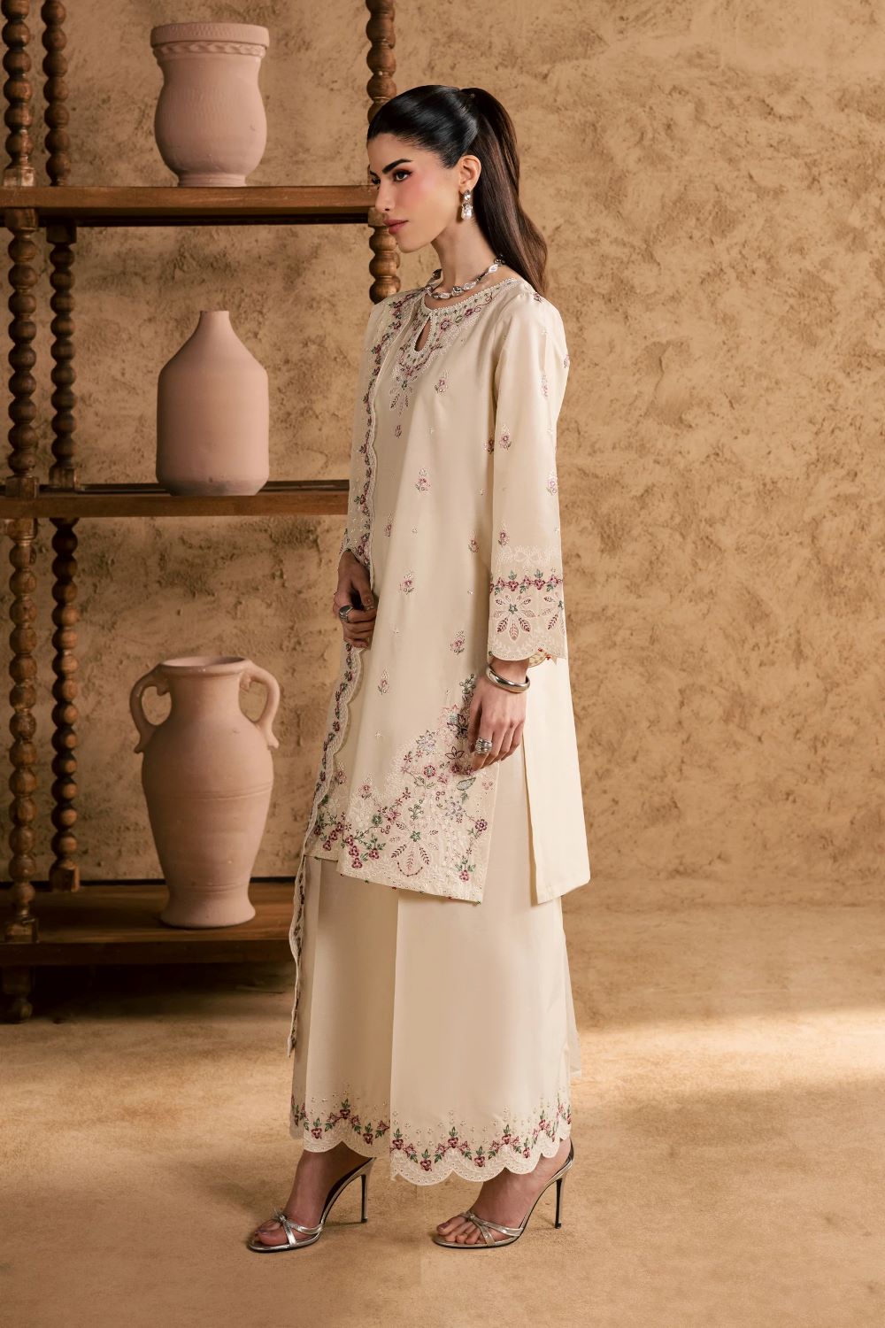 fully embroidered Ivory shirt, intricately crafted with delicate motifs and finished with a subtle lace trim, exuding refined elegance. The detailed embroidery brings depth and texture, making it a standout piece perfect for Festive Eid celebrations.