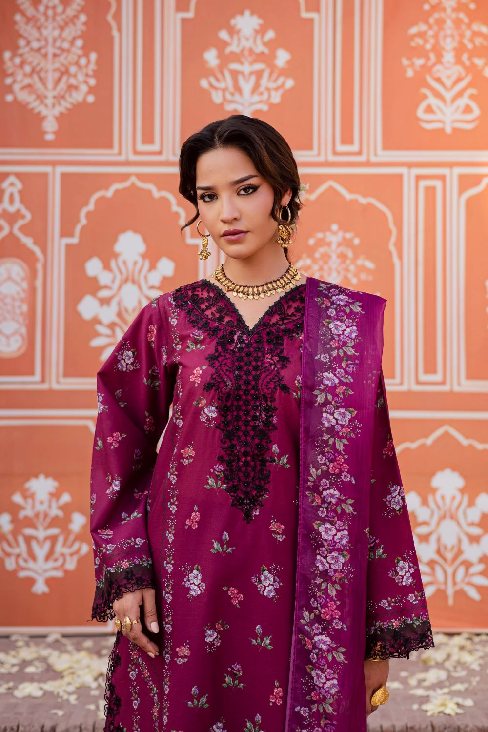 A medium silk printed dupatta completes the look, adding fluidity and understated elegance.