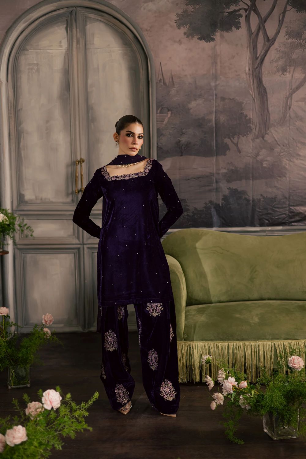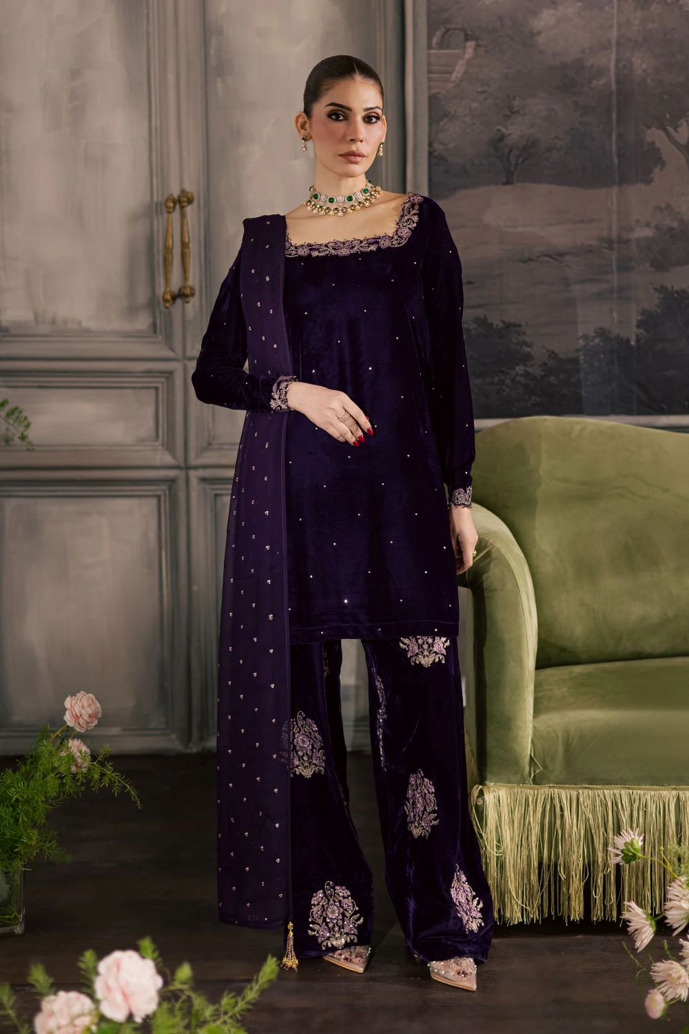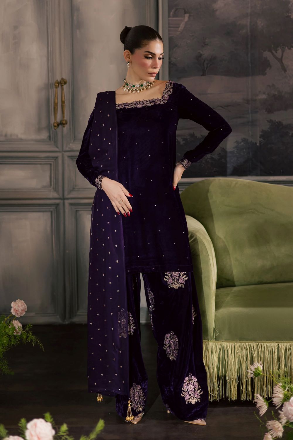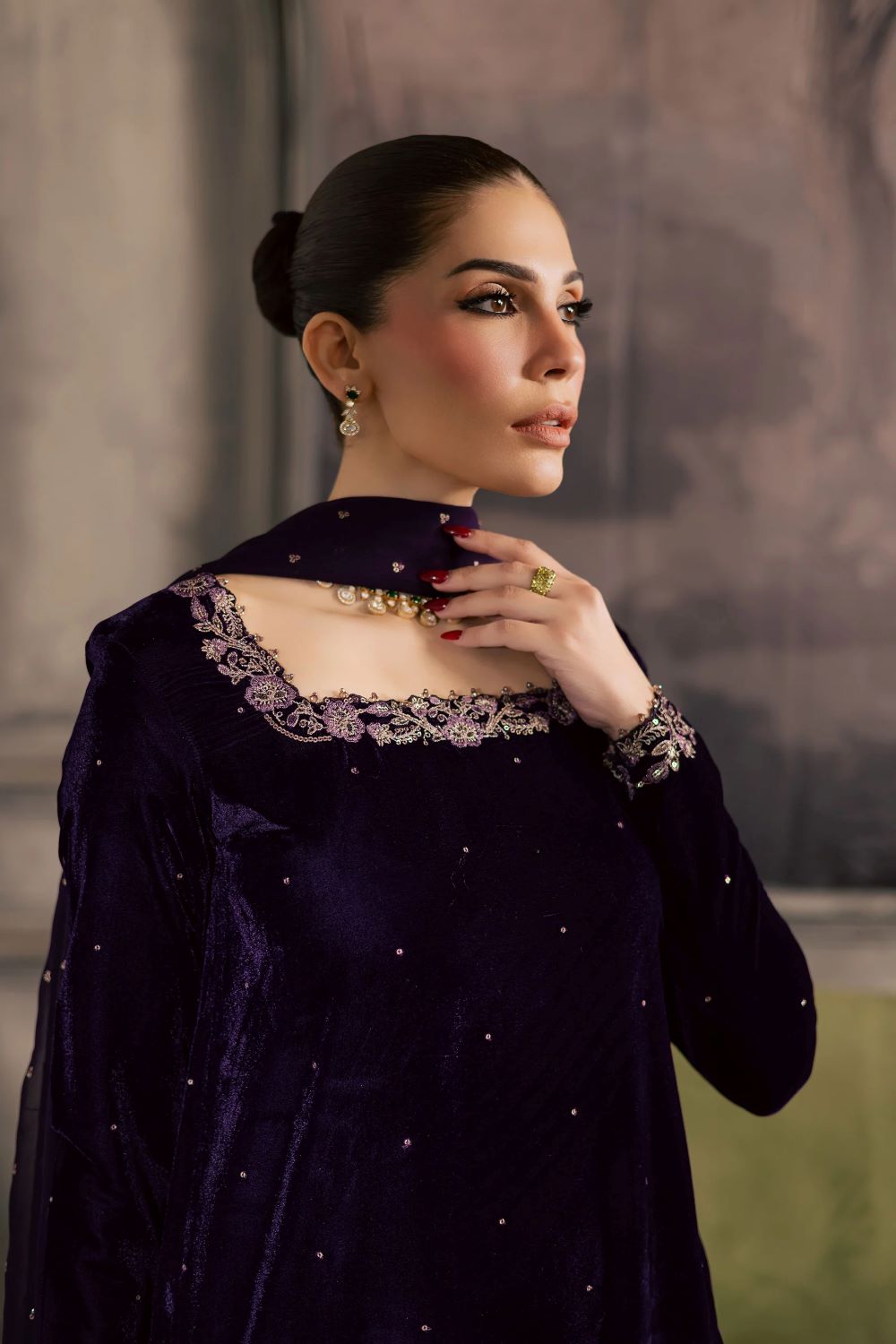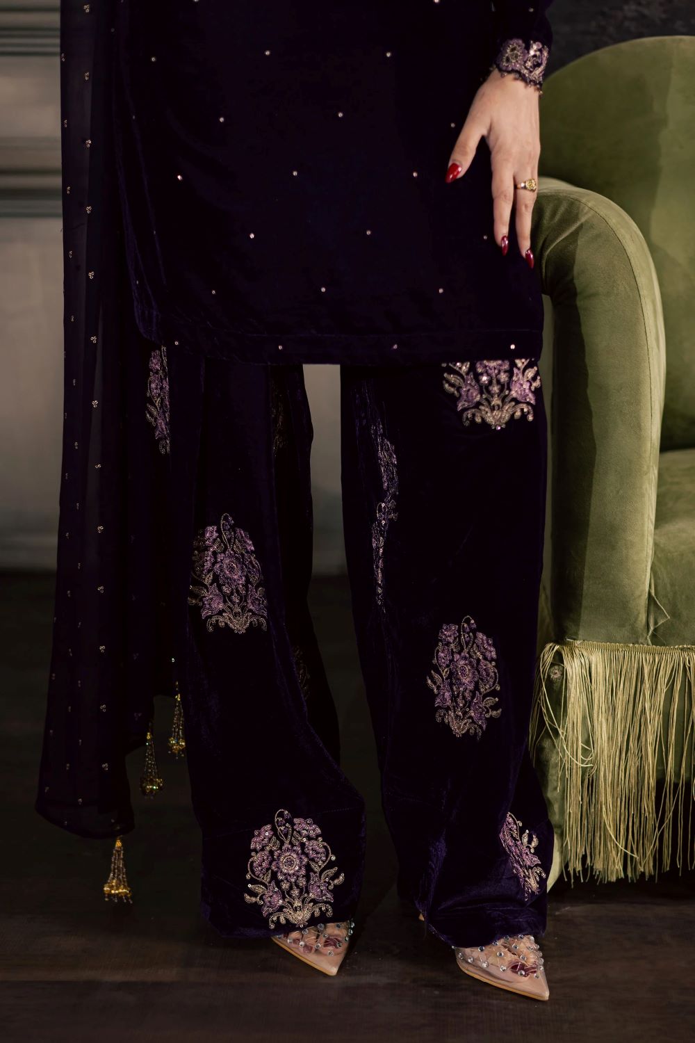 This midnight purple velvet ensemble features intricate embroidery on the neckline and sleeves, paired with a subtle sequin spread on the shirt front for a refined festive glow. Crystal detailing, cutwork on the neckline, and delicate tassels on the dupatta add a touch of charm and elevate the overall look with soft elegance.