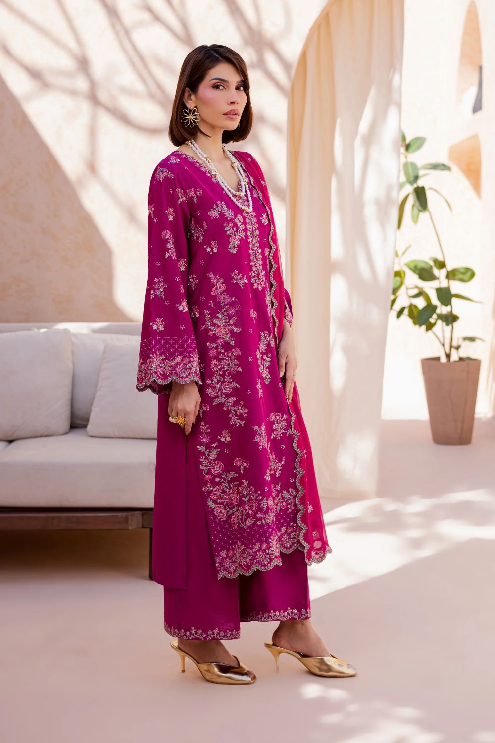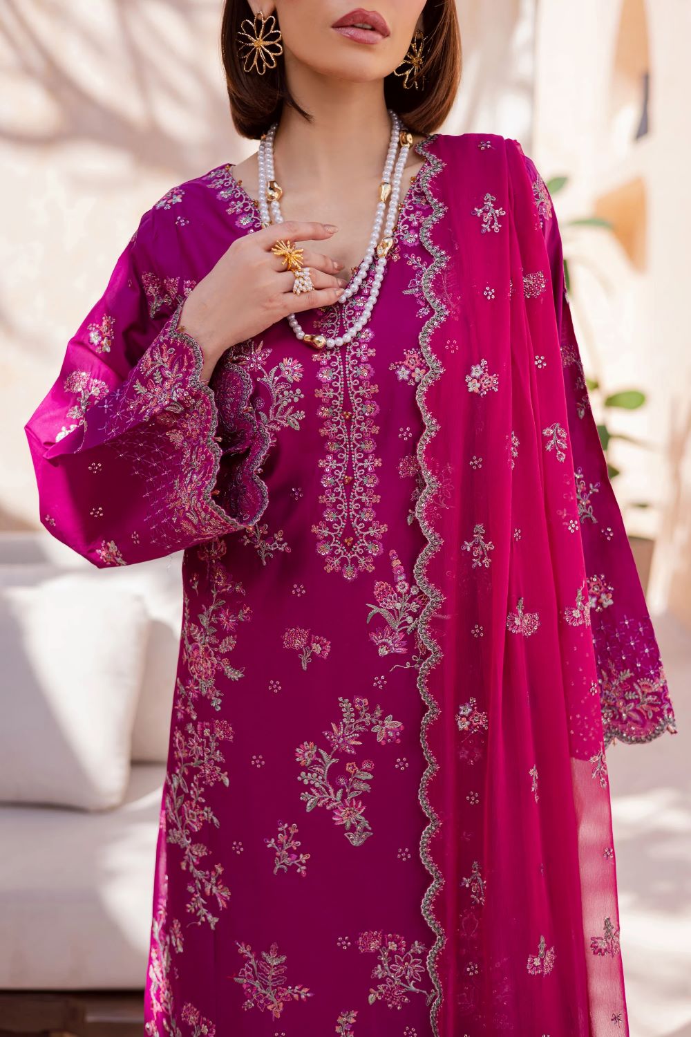 This three-piece ensemble features a bahar pink fully embroidered panelled Pima shirt with sleeves, enhanced with crystal detailing along the neckline and sleeve hems for luminous festive charm.