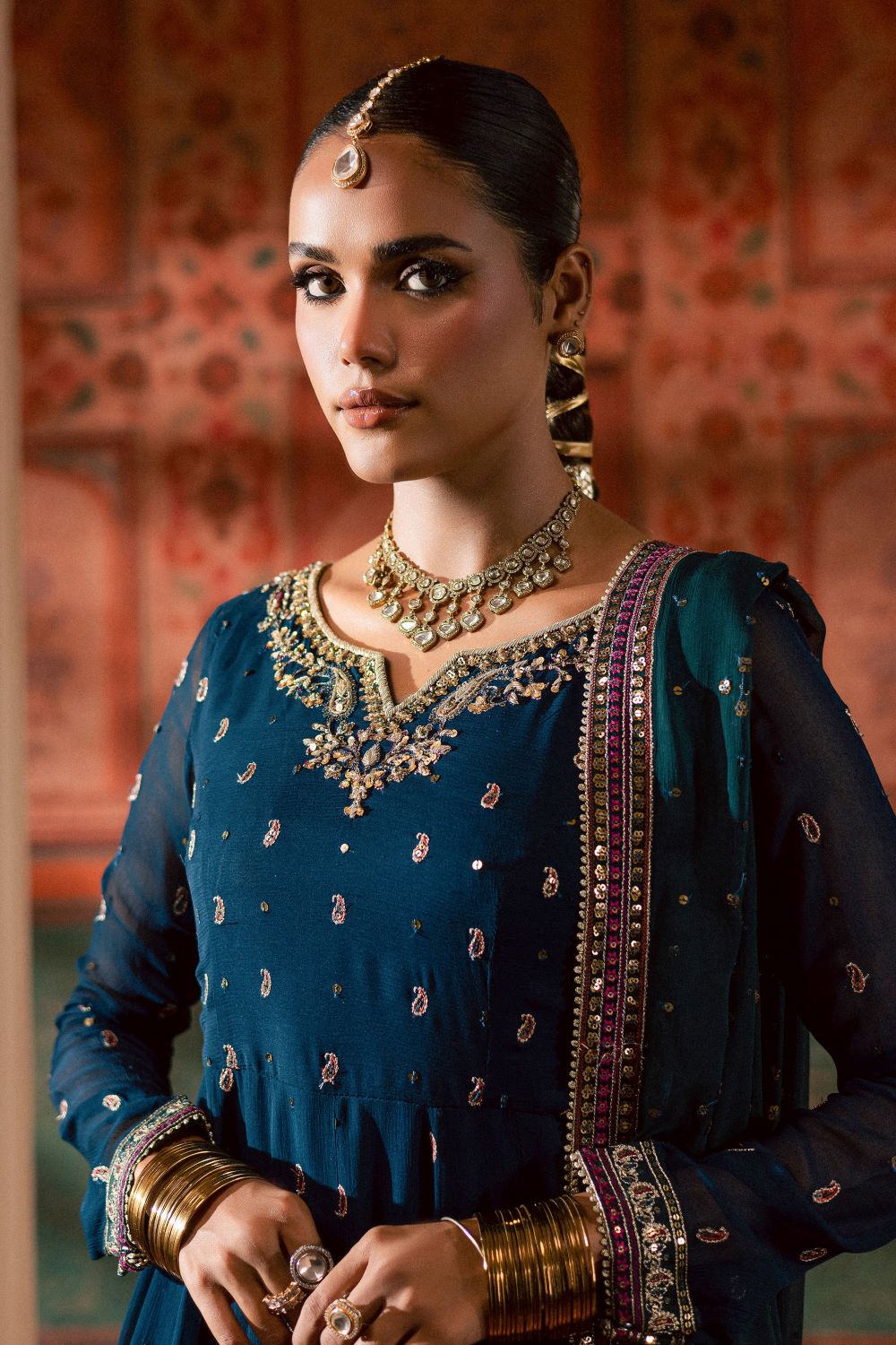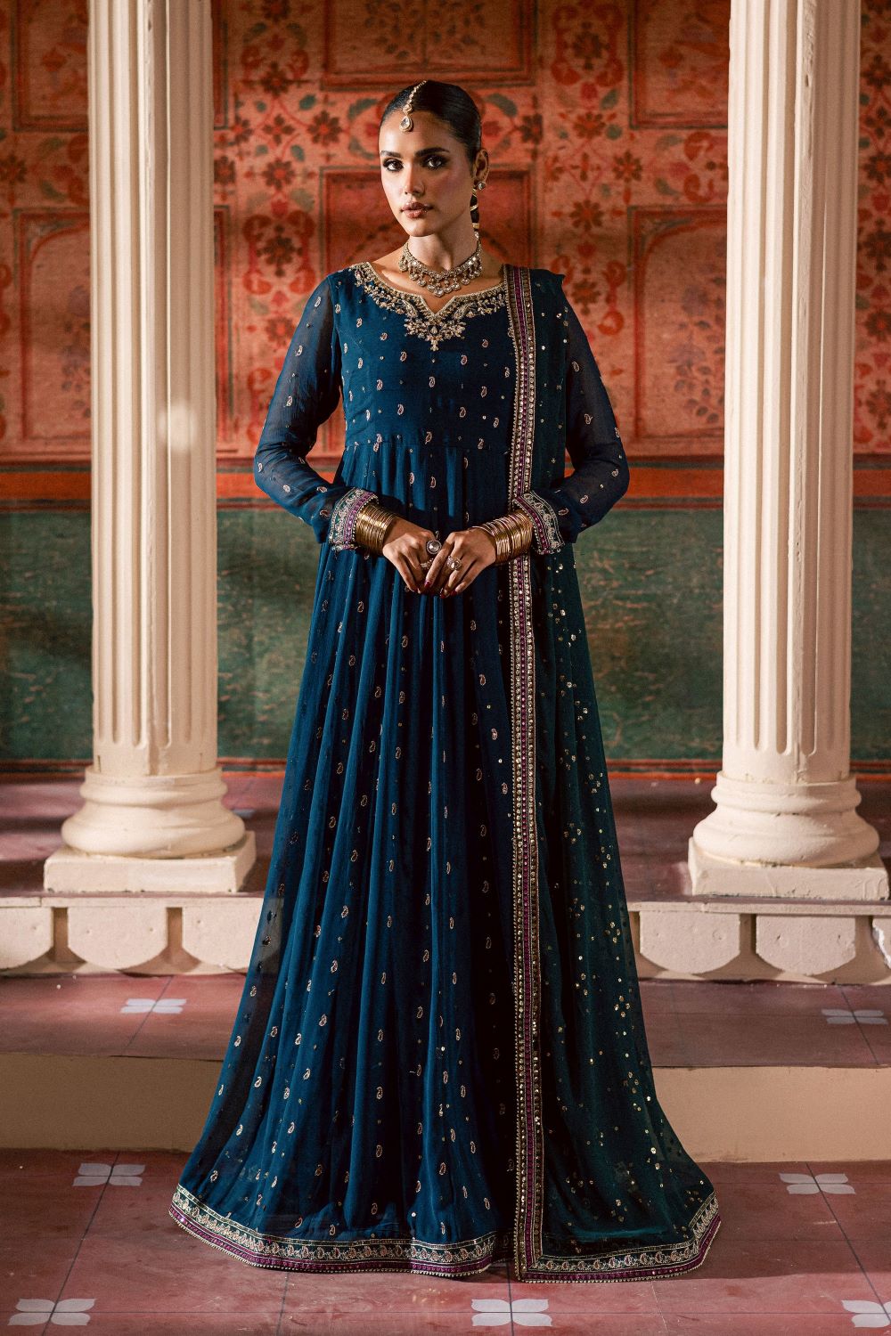This 3-piece outfit celebrates intricate craftsmanship and timeless elegance. The crinkle frock features an embroidered yoke and neckline enhanced with fine adda work. Detailed paisley embroidery and sequin spread adorn the paneled frock, while full-length fitted sleeves and the hem are finished with embroidered borders and samosa lace for a refined, cohesive look.
