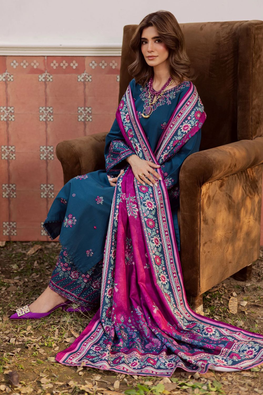 ThisĀ 3-piece prussian khaddar ensembleĀ is a celebration of color and craftsmanship. The long shirt features a beautifully embroidered front and sleeves, brought to life with vibrant threads that add a touch of artistry to every detail. Finished with delicate lace accents, it carries a perfect balance of elegance and warmth, ideal for the winter season.