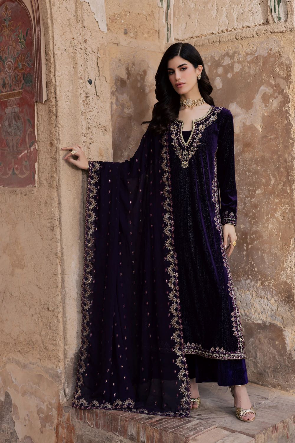 This three piece dark purple velvet set features a long shirt with an embroidered neckline enhanced with adda work detailing. The shirt is finished with embroidered borders along the hem and side seams, while the sleeves carry matching borders at the hem for a clean and structured look.