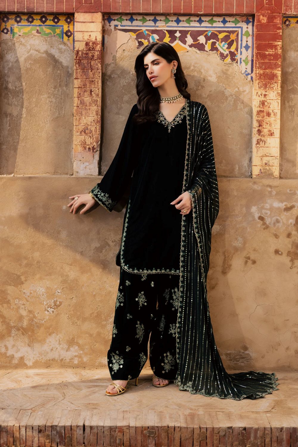 Paired with an embroidered velvet shalwar, the ensemble exudes festive opulence. The sharara is finished with samosa lace, enhancing its traditional elegance while maintaining a soft, graceful flow.