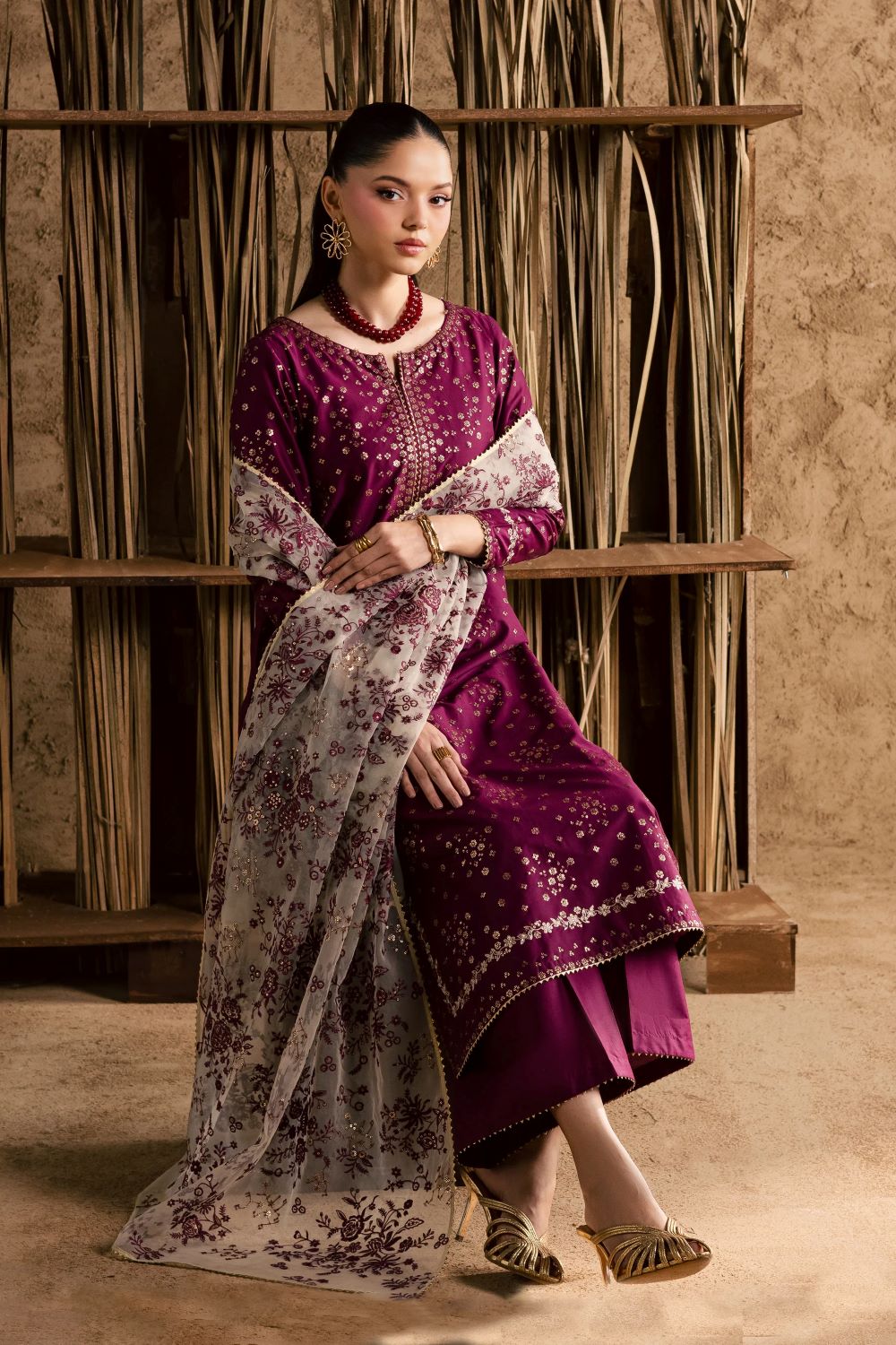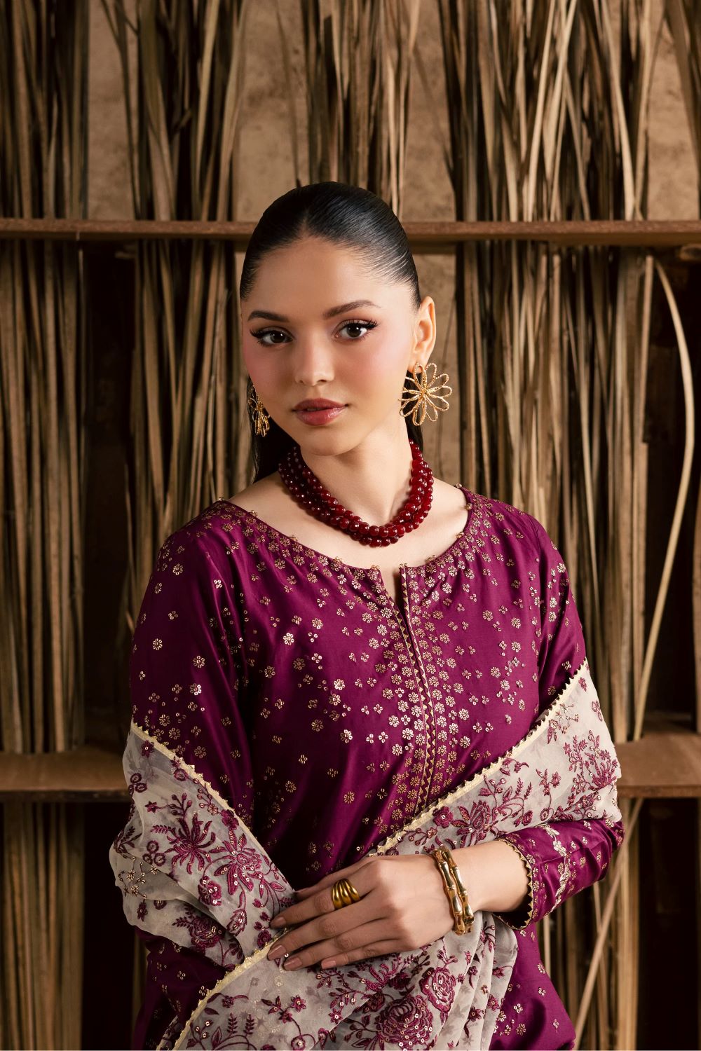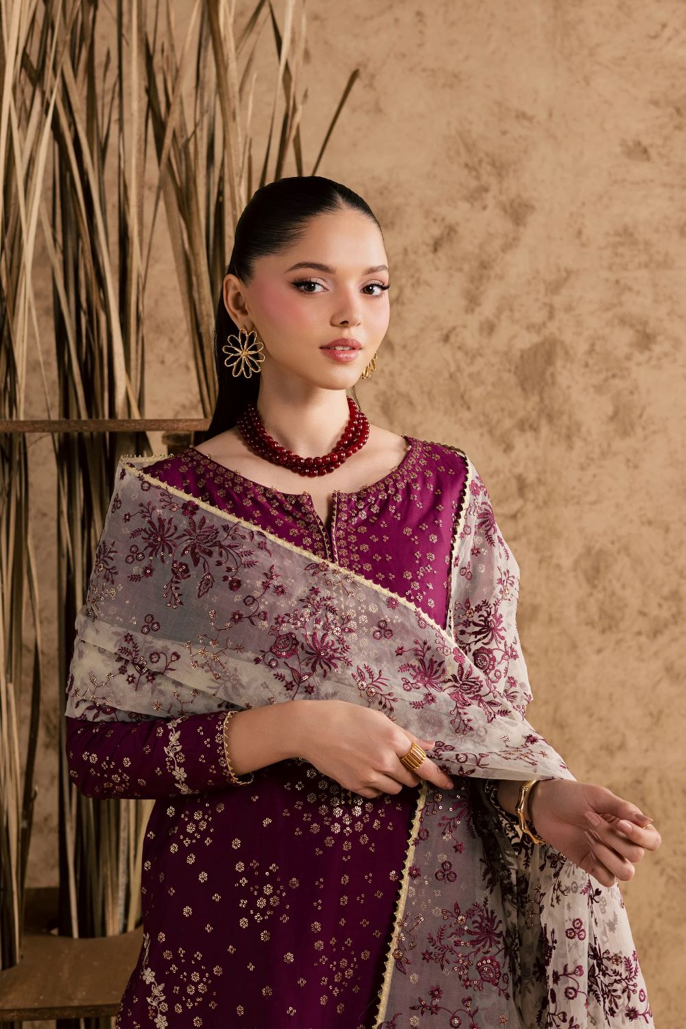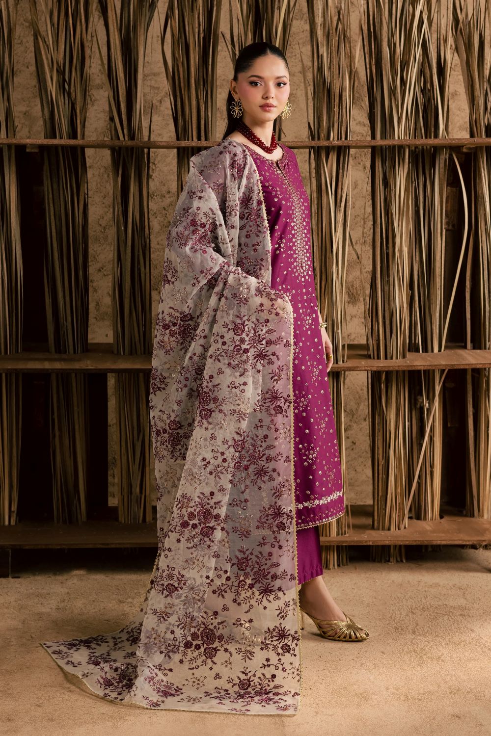 A heavily embroidered organza dupatta completes the ensemble, its intricate work adding depth and a touch of opulent sophistication. Draped gracefully, it elevates the look with a festive, celebratory flourish.