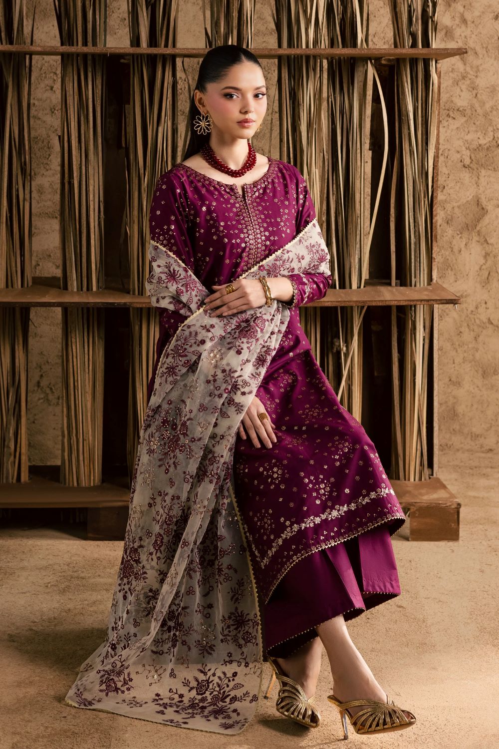 Plain culottes offer a sleek, understated balance, allowing the shirt’s ornate detailing to take center stage while ensuring comfort and effortless elegance.