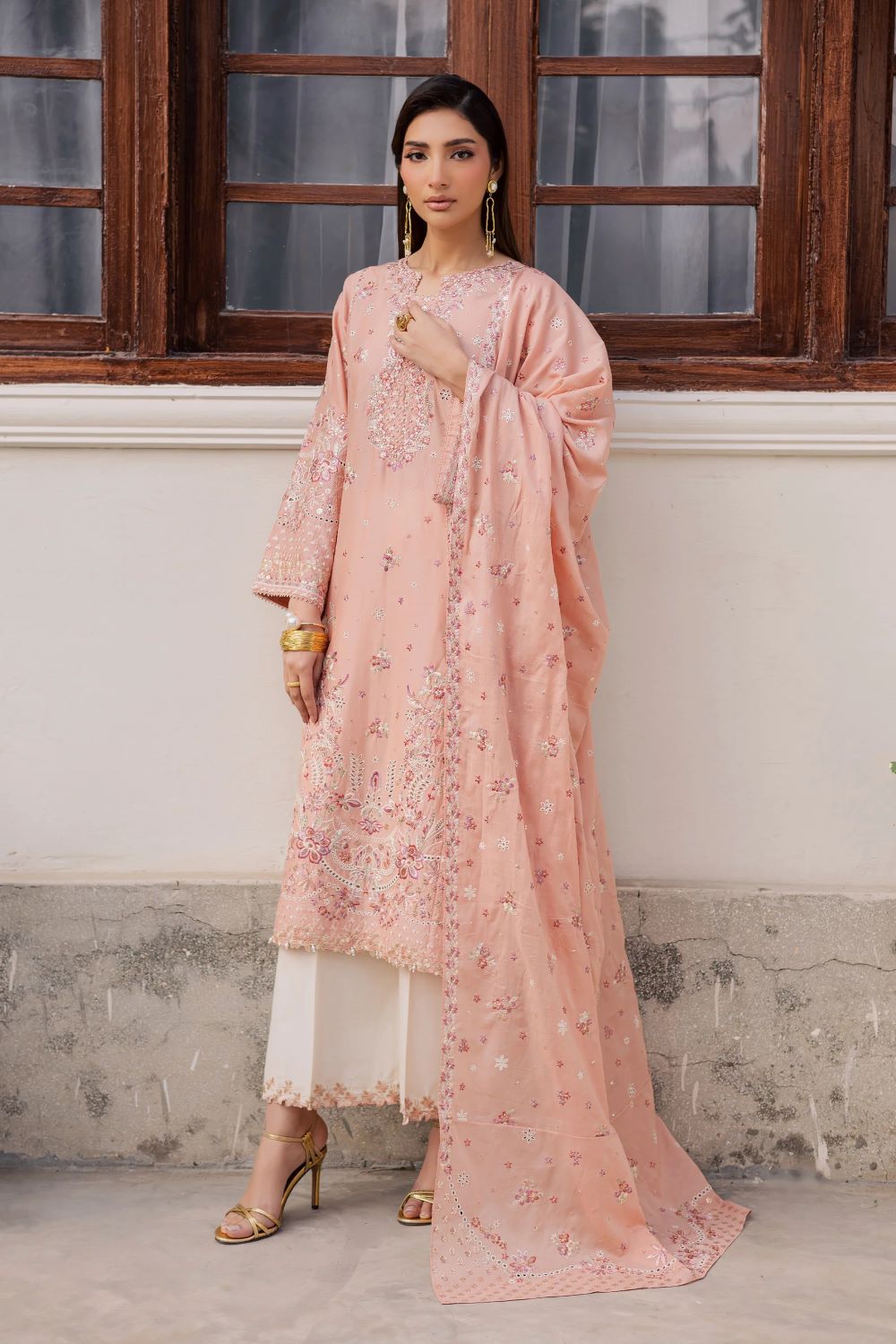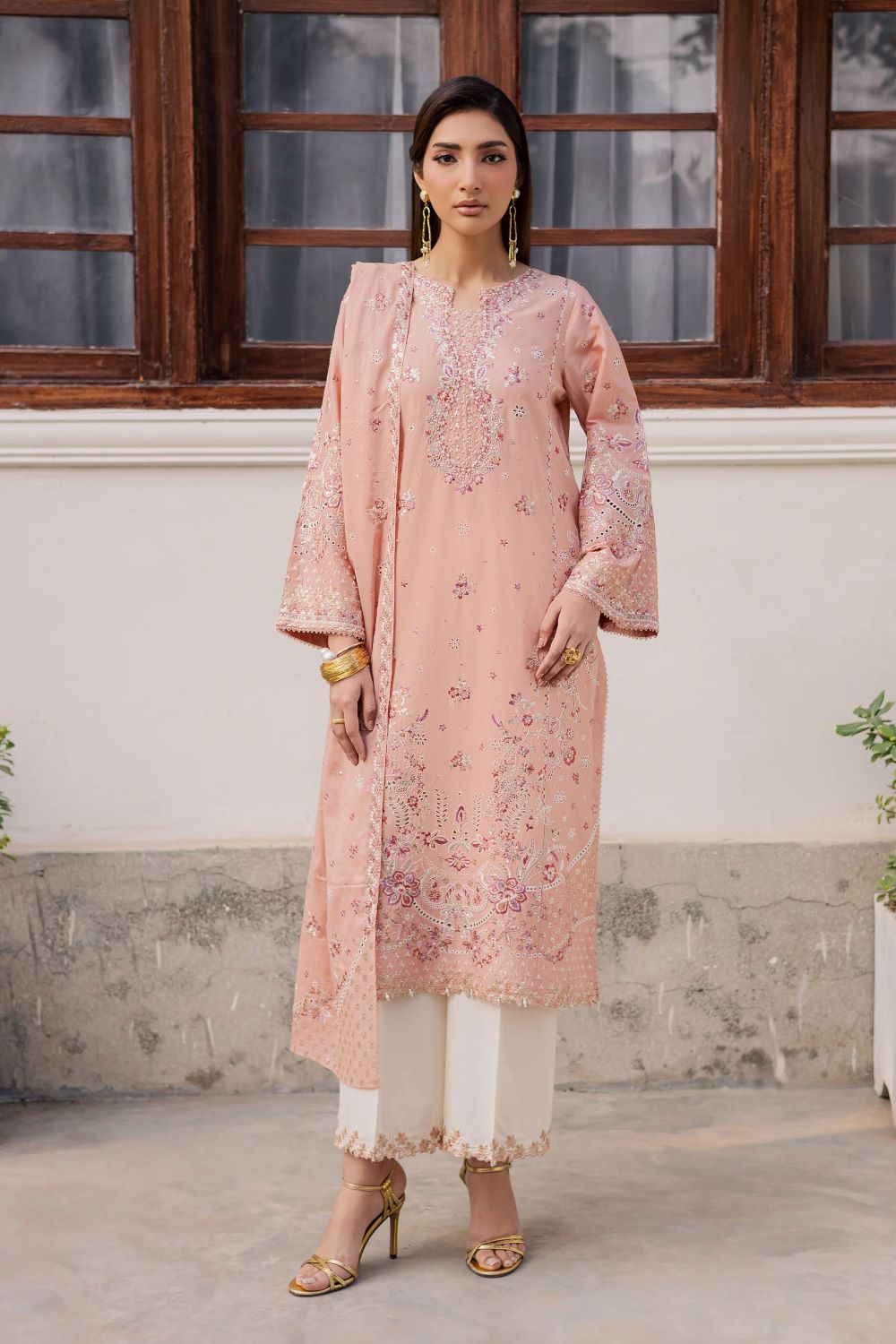 A heavily embroidered dupatta in a self tone completes the ensemble, adding softness and cohesion to the outfit, making it ideal for Eid day gatherings and celebrations.