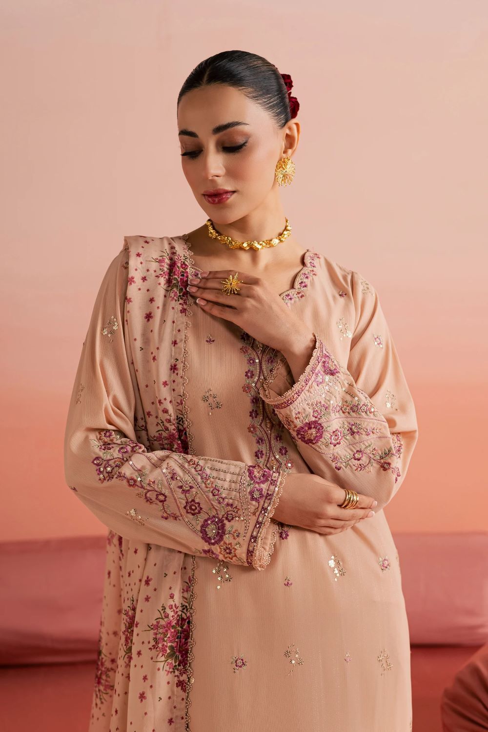 A printed chiffon dupatta completes the look, finished with lace on all four sides, adding softness and contrast to the ensemble.