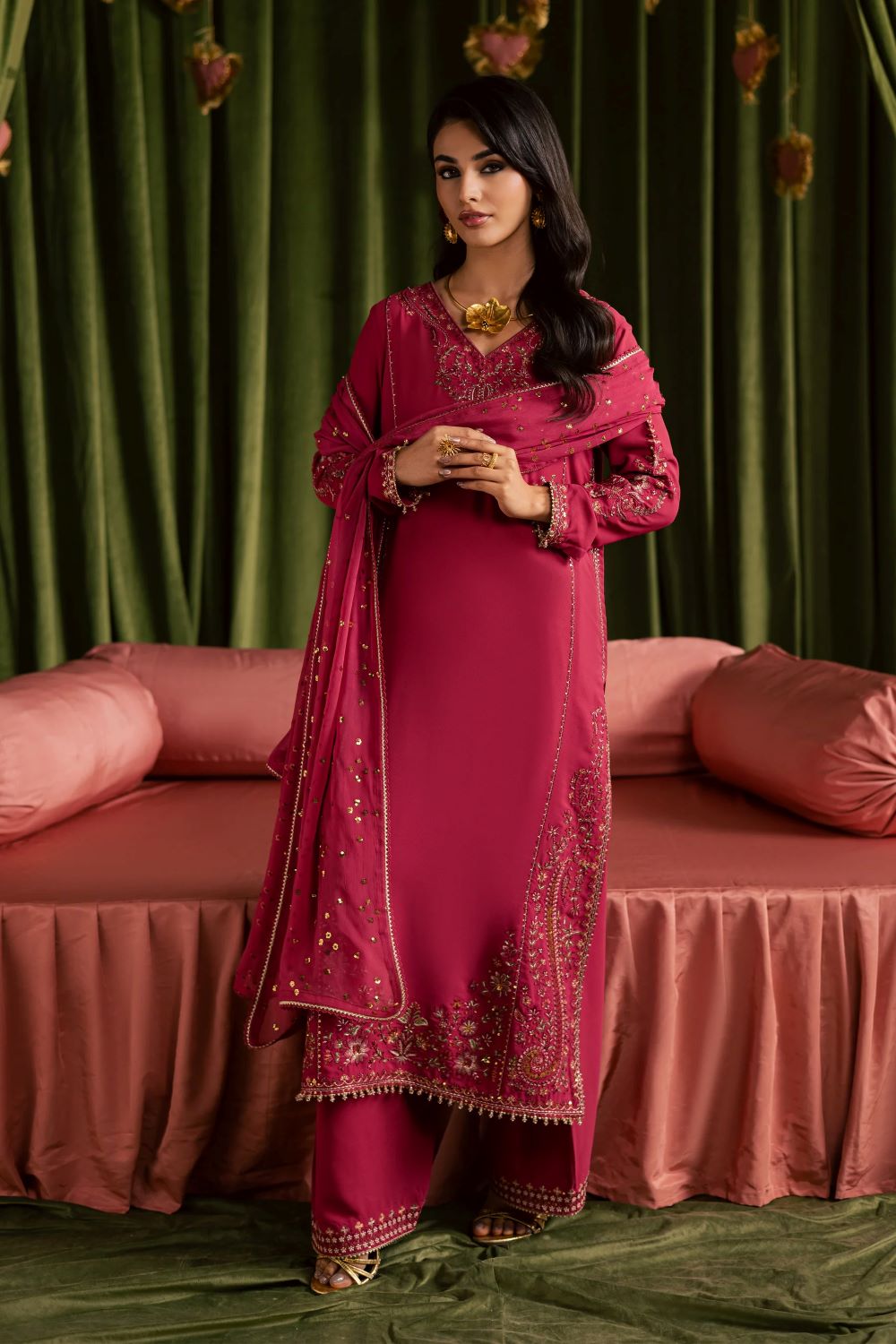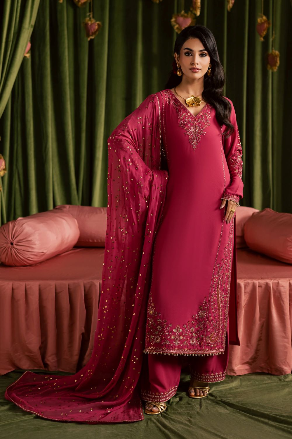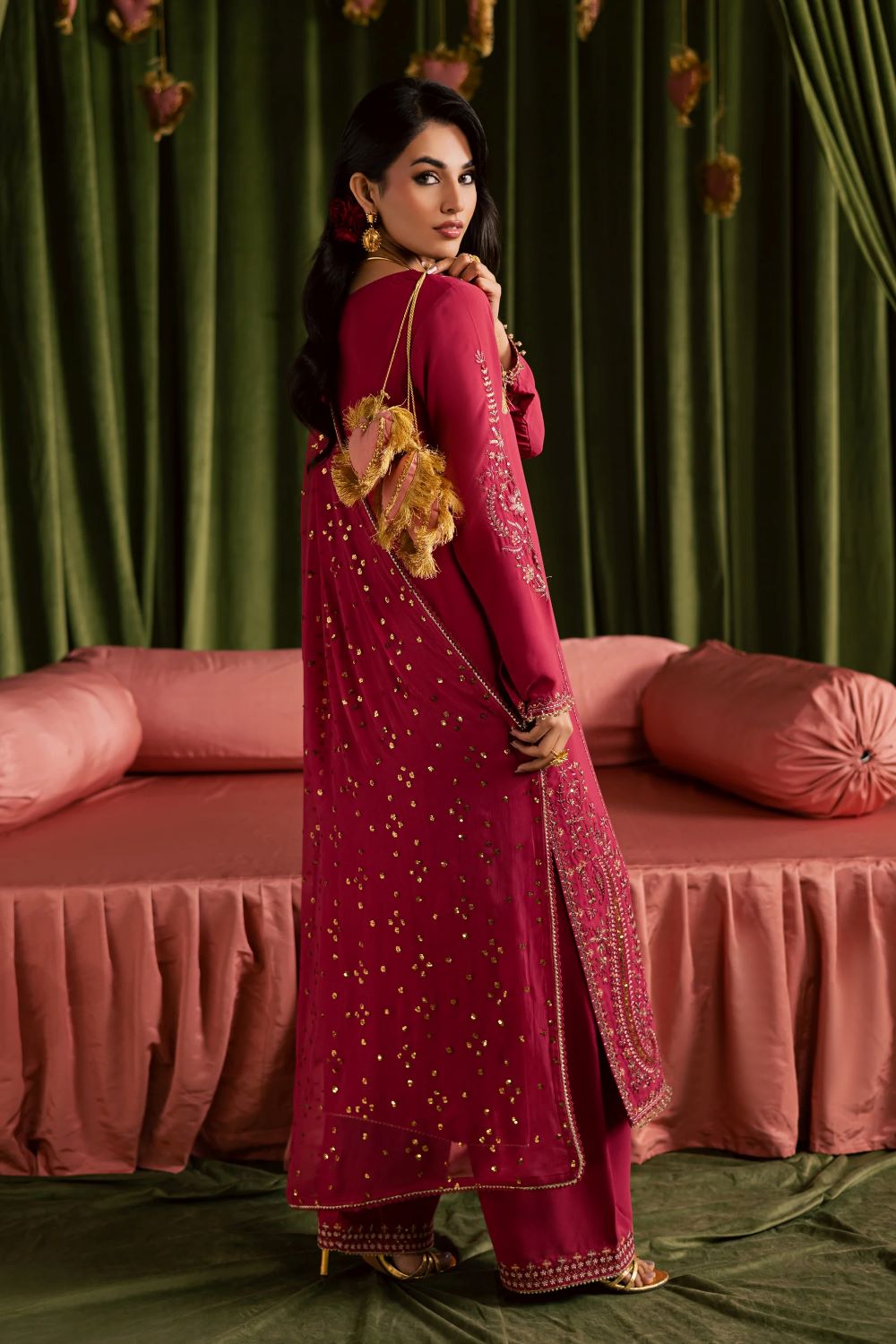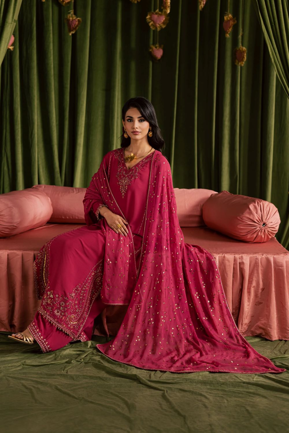 A crinkle dupatta completes the look, designed with an all-over sequin spread that adds soft shimmer for Eid celebrations.