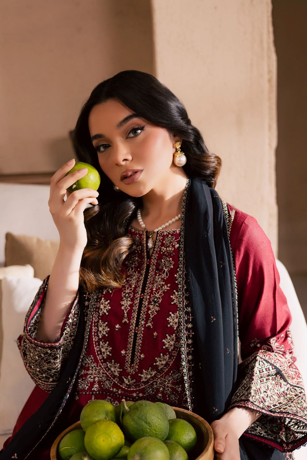 This 3 piece red khaddar ensemble embodies festive elegance with its mid length shirt featuring a delicately embroidered neckline and refined sleeve borders. The subtle detailing and balanced silhouette make it a graceful choice for winter occasions.