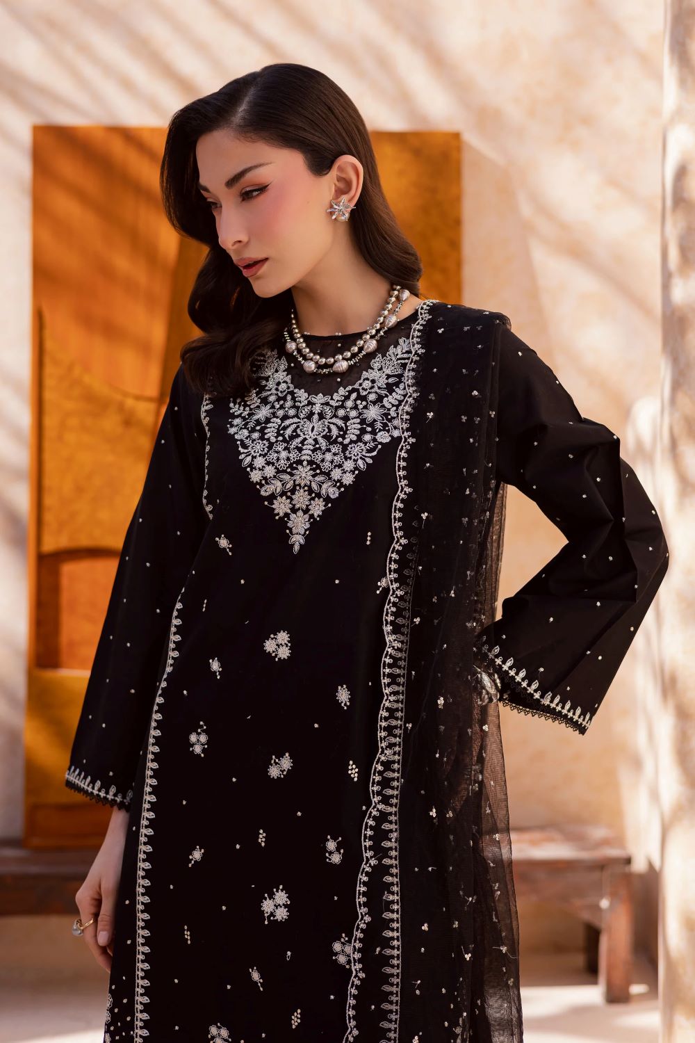 A net dupatta with minimal embroidery completes the ensemble, adding delicate texture and a light festive finish.