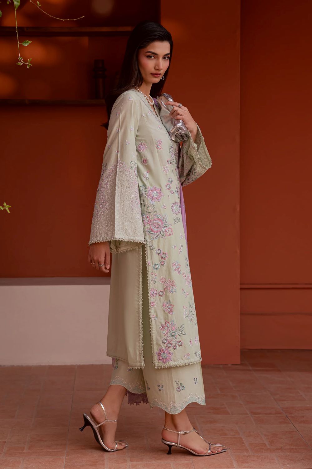 This three-piece ensemble features a mint green Pima shirt with sleeves, richly adorned with detailed embroidery that creates a refined festive silhouette. The neckline, sleeve hems, and shirt hem are enhanced with delicate lace and crystal embellishments, adding luminous elegance to the design.