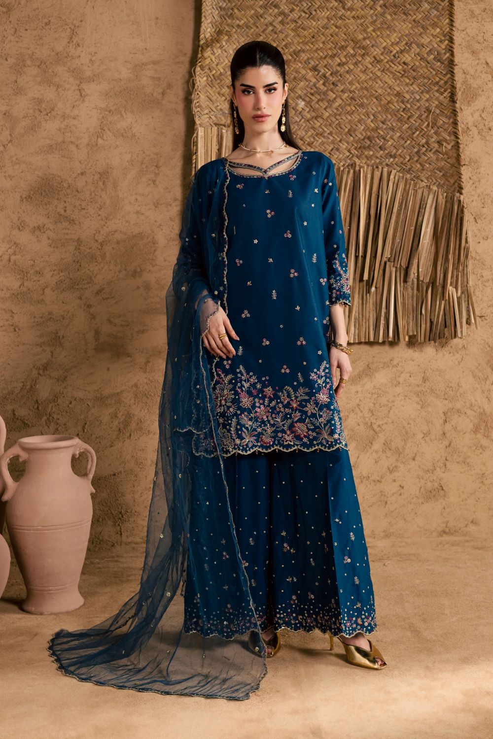 A short shirt featuring a cutout sweetheart neckline with delicate strappy detailing, adorned with composed embroidery and Kavya finishing along the side seams and hem, creating a refined Festive Eid statement.