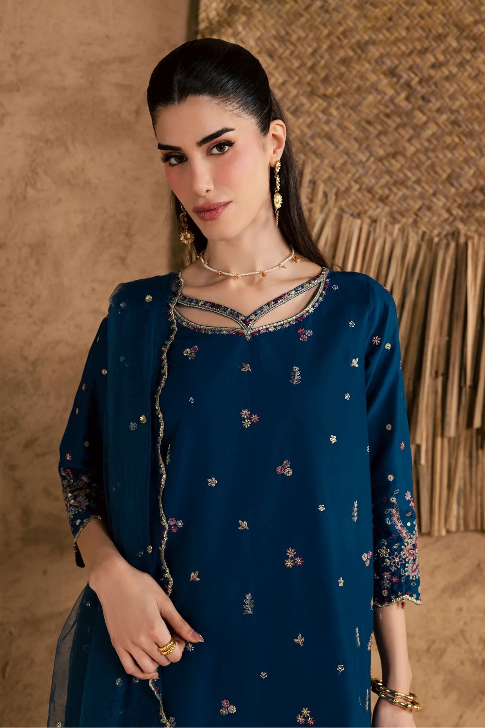 A net dupatta with sequin spread and minimal Kavya embroidery along the four sides of the pallu completes the ensemble, adding soft shimmer and festive sophistication.