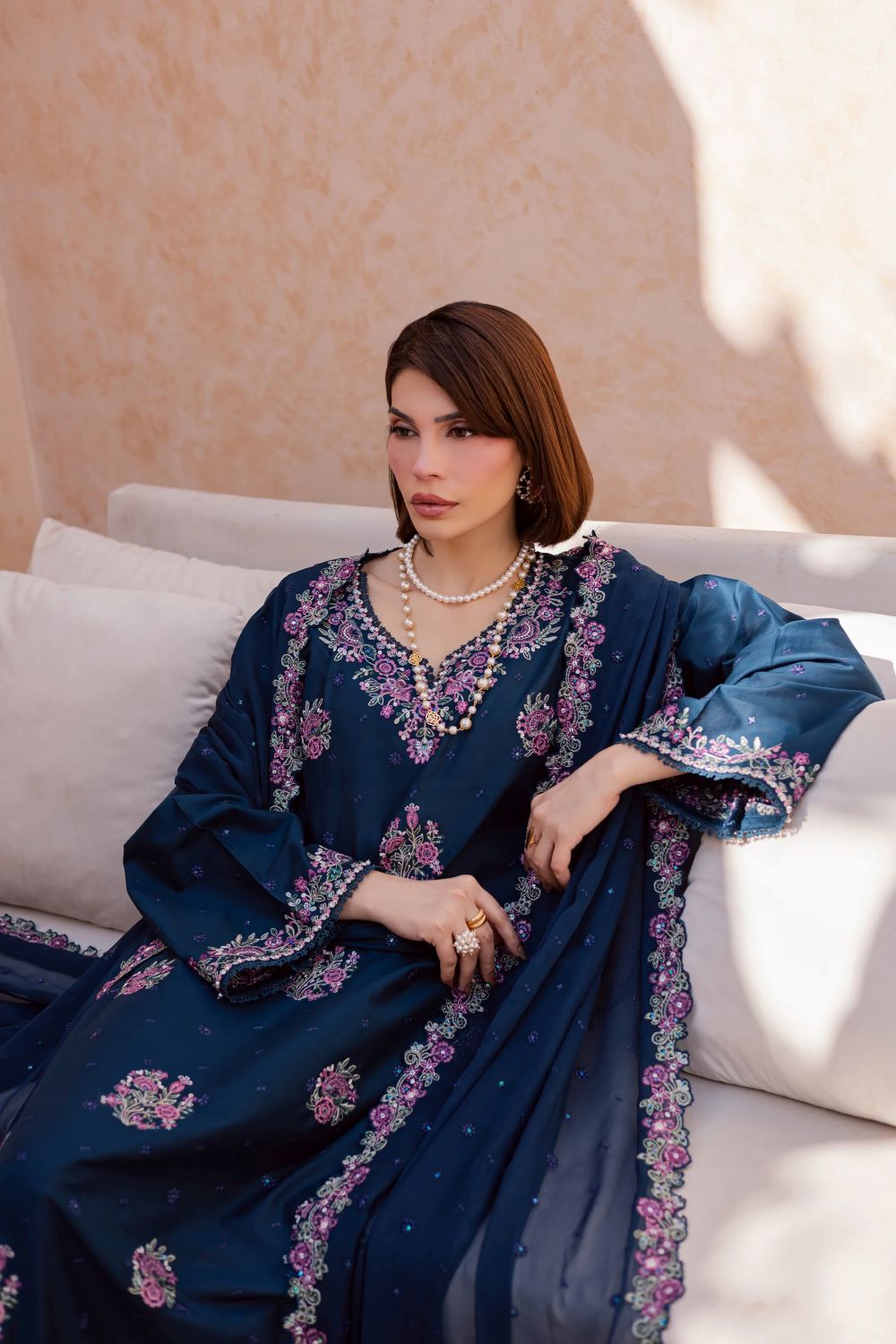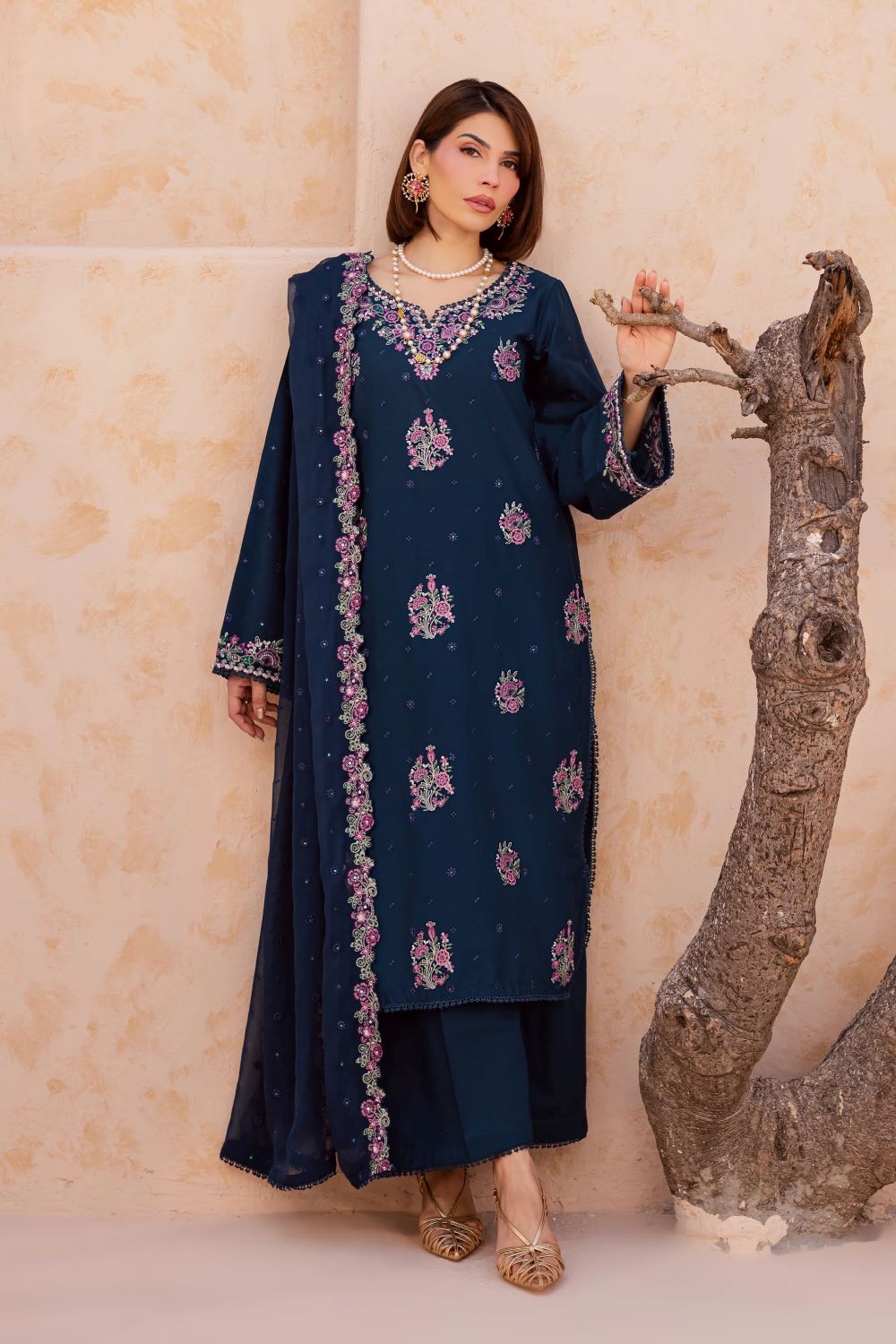 This three-piece ensemble features a floral embroidered shirt with sleeves, designed with a beautifully composed neckline and delicate floral bunches that adorn the shirt front and sleeves, creating a refined and graceful festive silhouette.