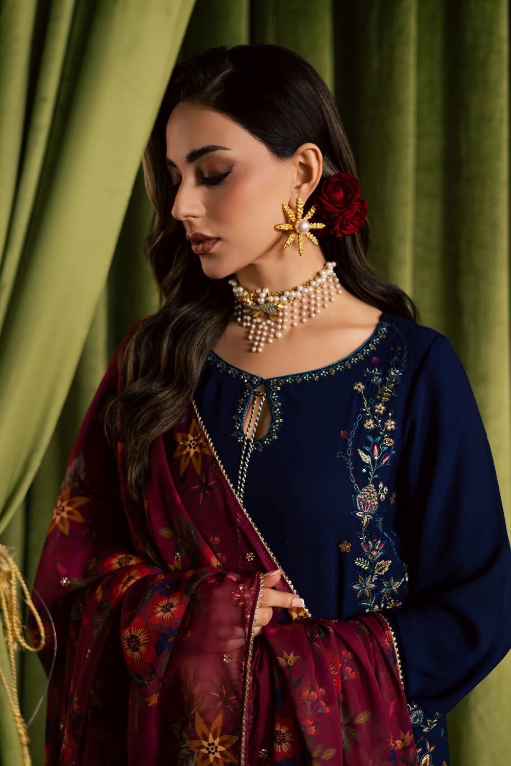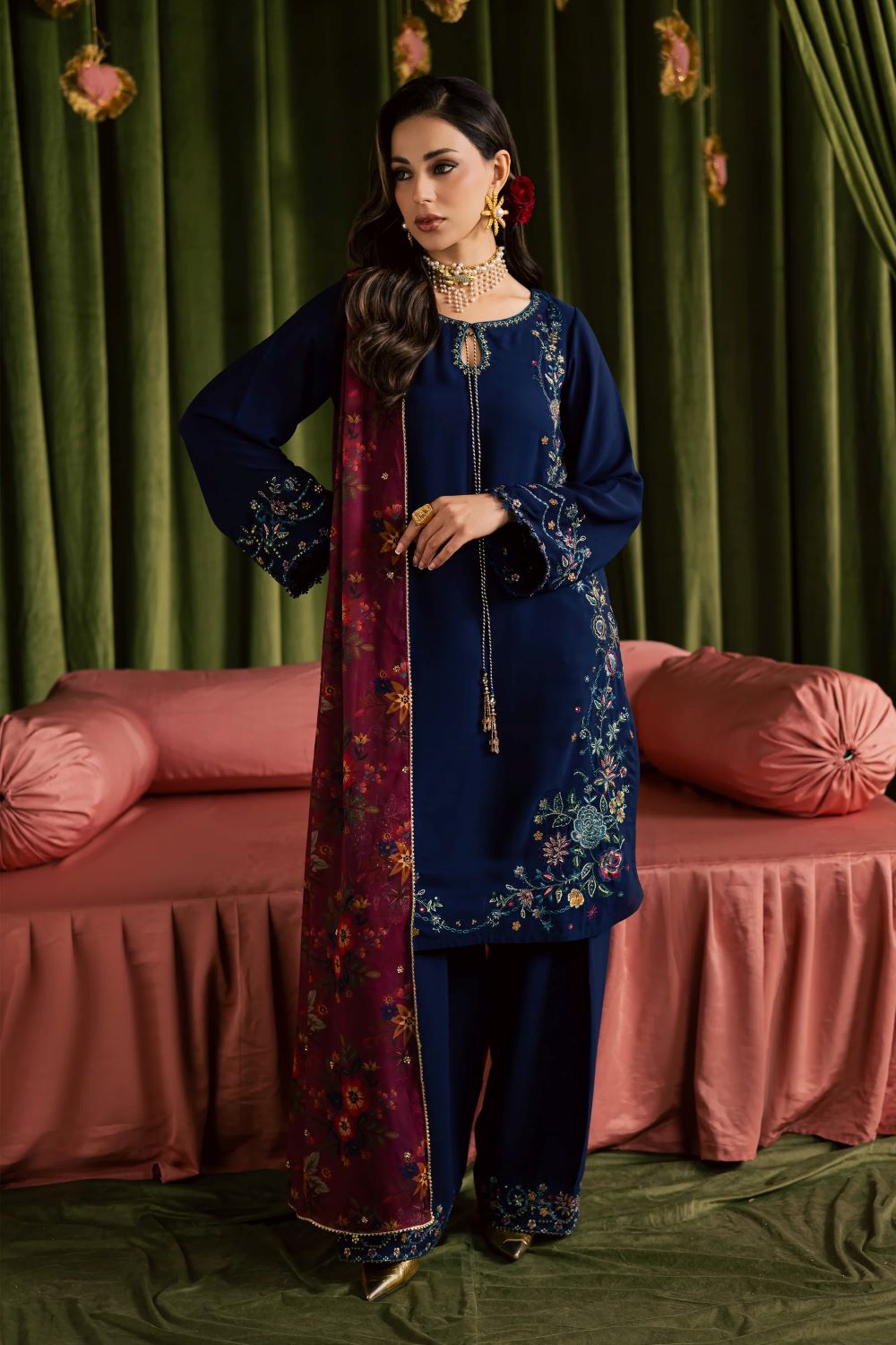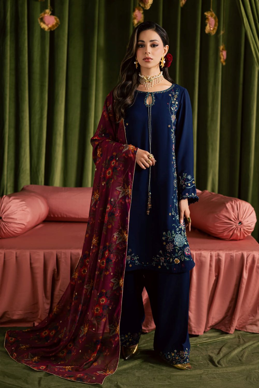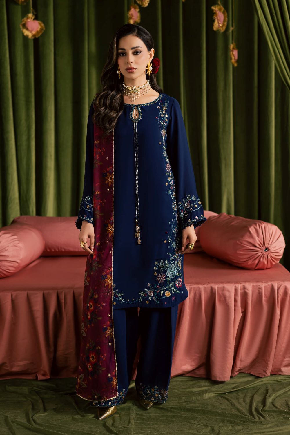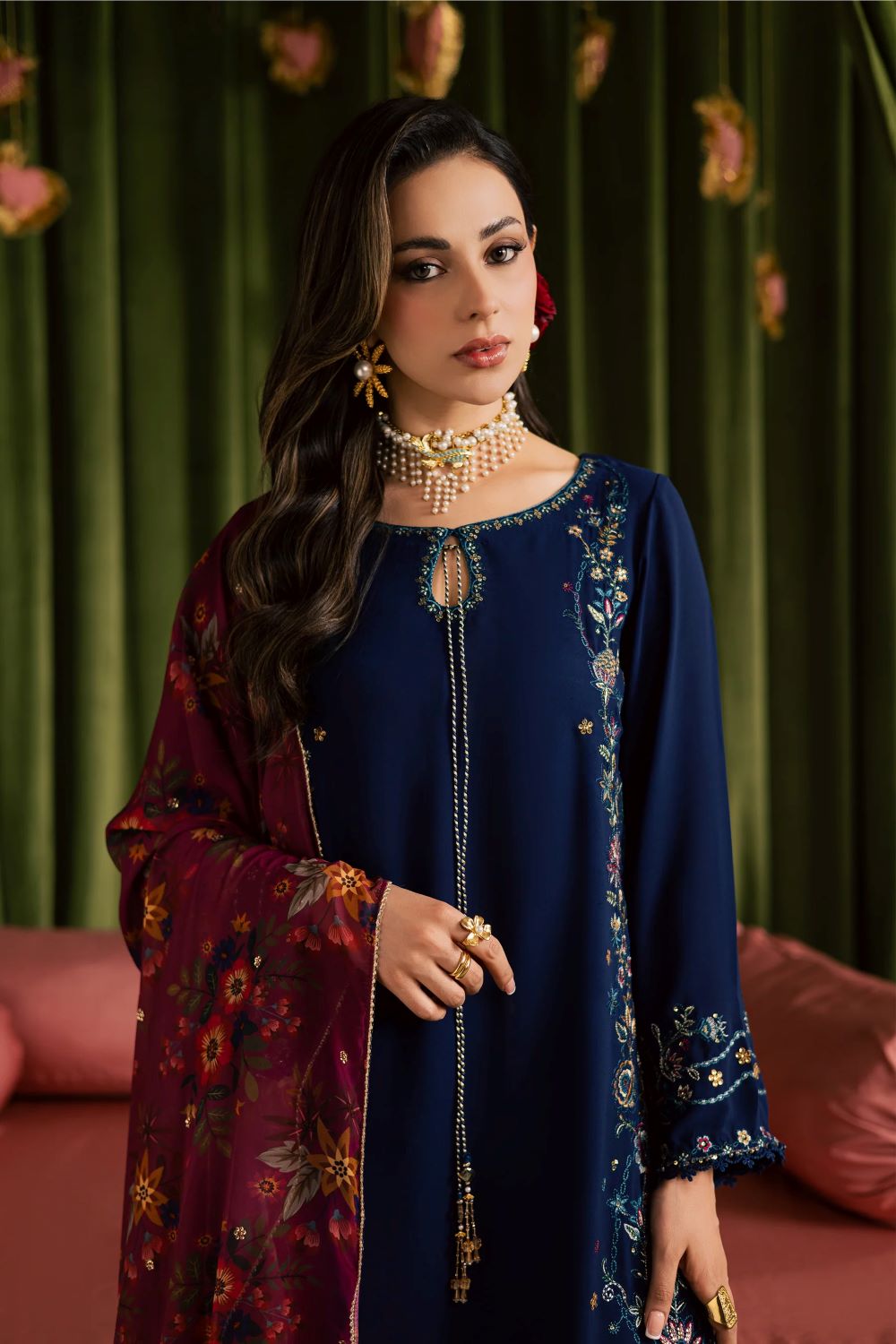 printed georgette dupatta completes the ensemble, featuring a sequin-embroidered spread that adds subtle sparkle for Eid celebrations.