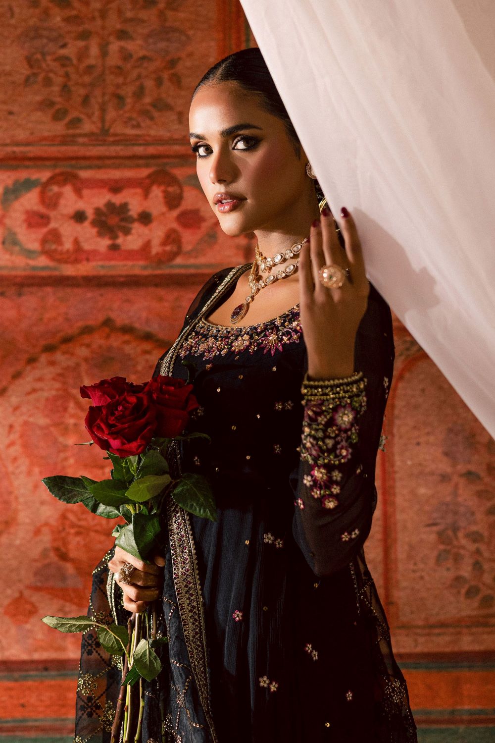 The heavy embroidered organza dupatta features a sequined jaal and embroidered border on all four sides, finished with samosa lace for a coordinated touch. Light yet luxurious, it brings the entire look together with understated sophistication.