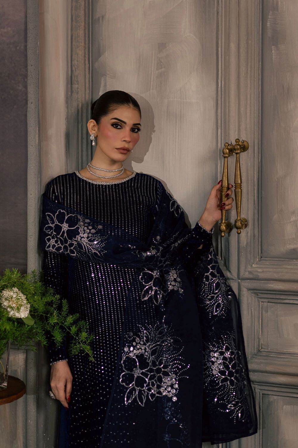 This 3-piece electric blue velvet ensemble features a fully sequin embroidered shirt that offers a soft, luminous shine. The neckline is enhanced with delicate adda work, while the sleeve hems carry subtle crystal details for an elegant finishing touch. The rich color and refined embellishments create a statement winter look that feels both festive and graceful.