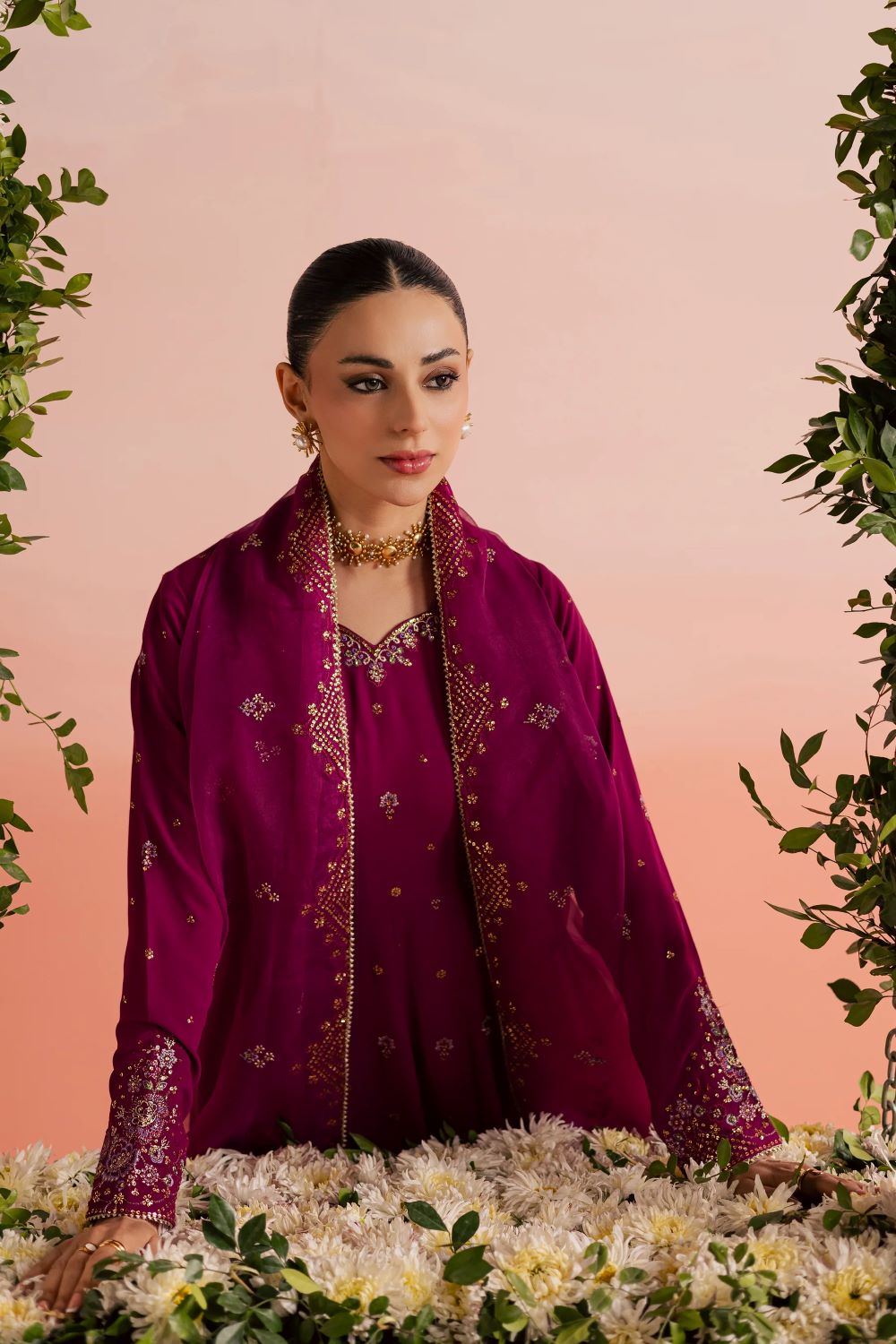 An embroidered organza dupatta completes the ensemble, finished with borders on all four sides and delicate samosa lace for a cohesive festive look.