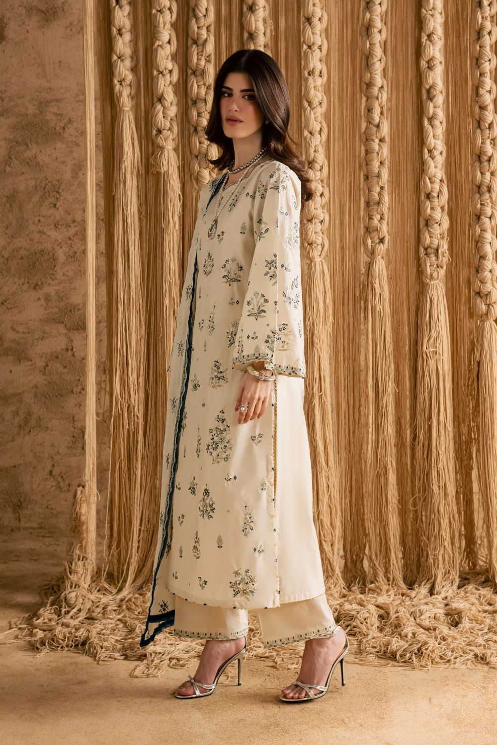 An embroidered spread crinkle dupatta, finished with contrast organza facing, adds soft texture and a sophisticated finishing touch, completing the ensemble with festive charm.