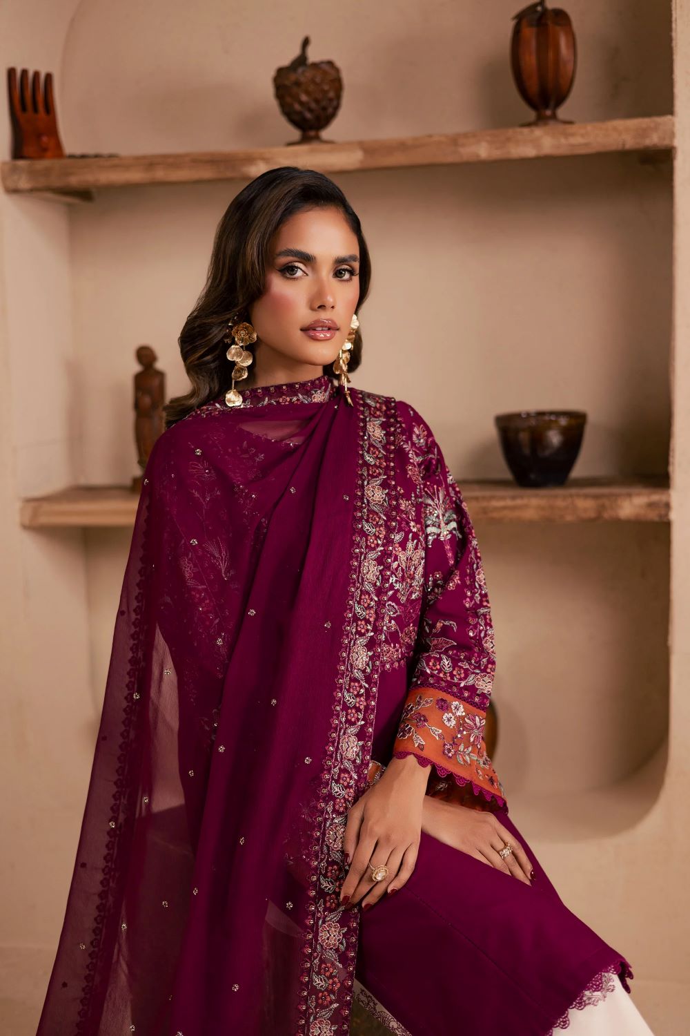 This 3 piece beet root khaddar ensemble reflects refined craftsmanship and timeless charm. The shirt features an intricately embroidered neckline adorned with delicate collage embellishments and lace detailing for a graceful finish. The sleeves carry matching embroidery, beautifully complemented with a contrasting organza embroidered border at the hem, adding depth and sophistication.