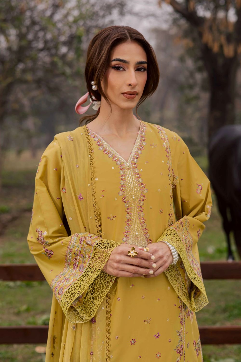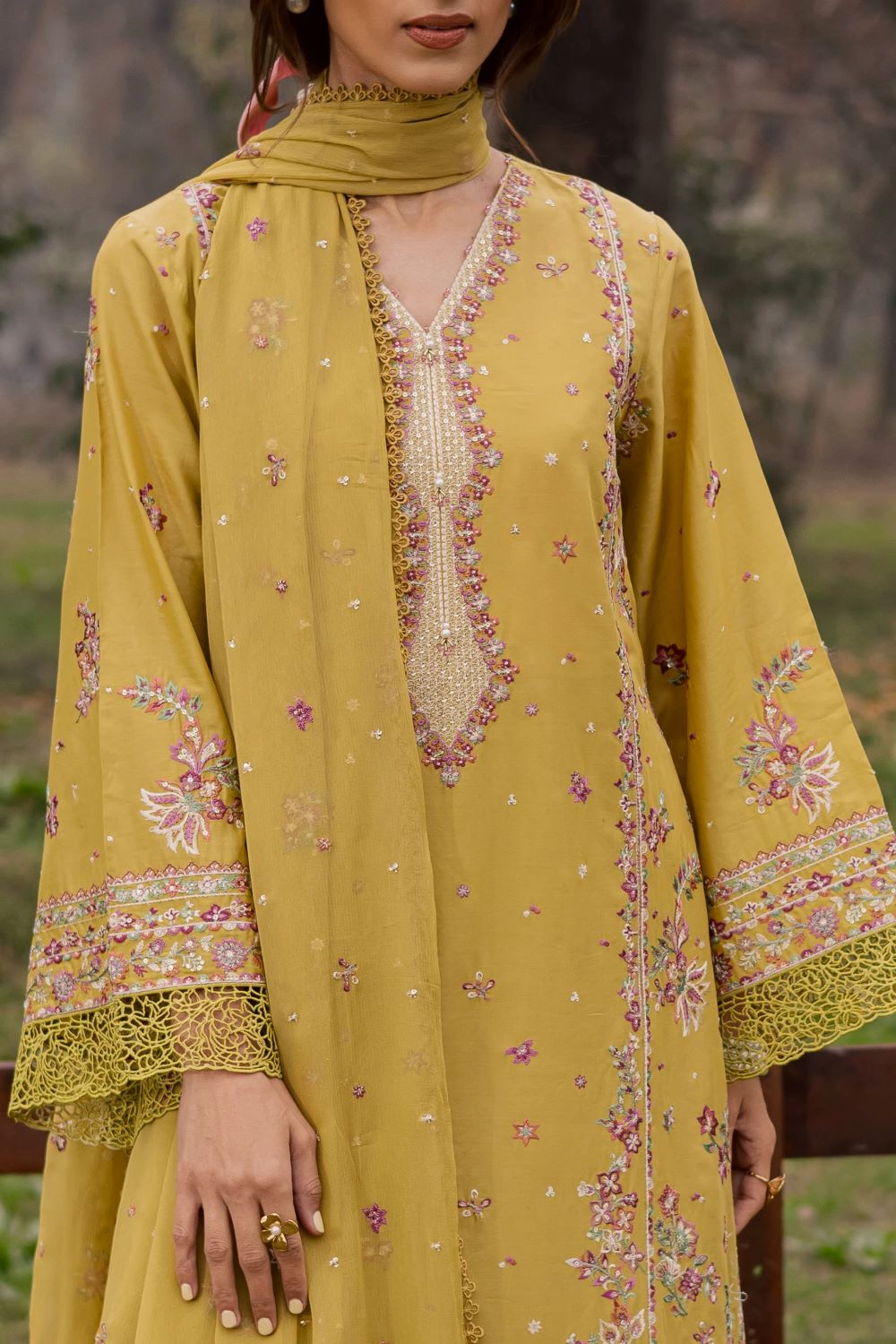 This elegant 3pc outfit in Pima lawn features a long shirt with heavy front embroidery, crochet and lace detailing, and fully embroidered sleeves. The hem and sides are adorned with crochet patchwork, creating a refined and festive Eid silhouette.